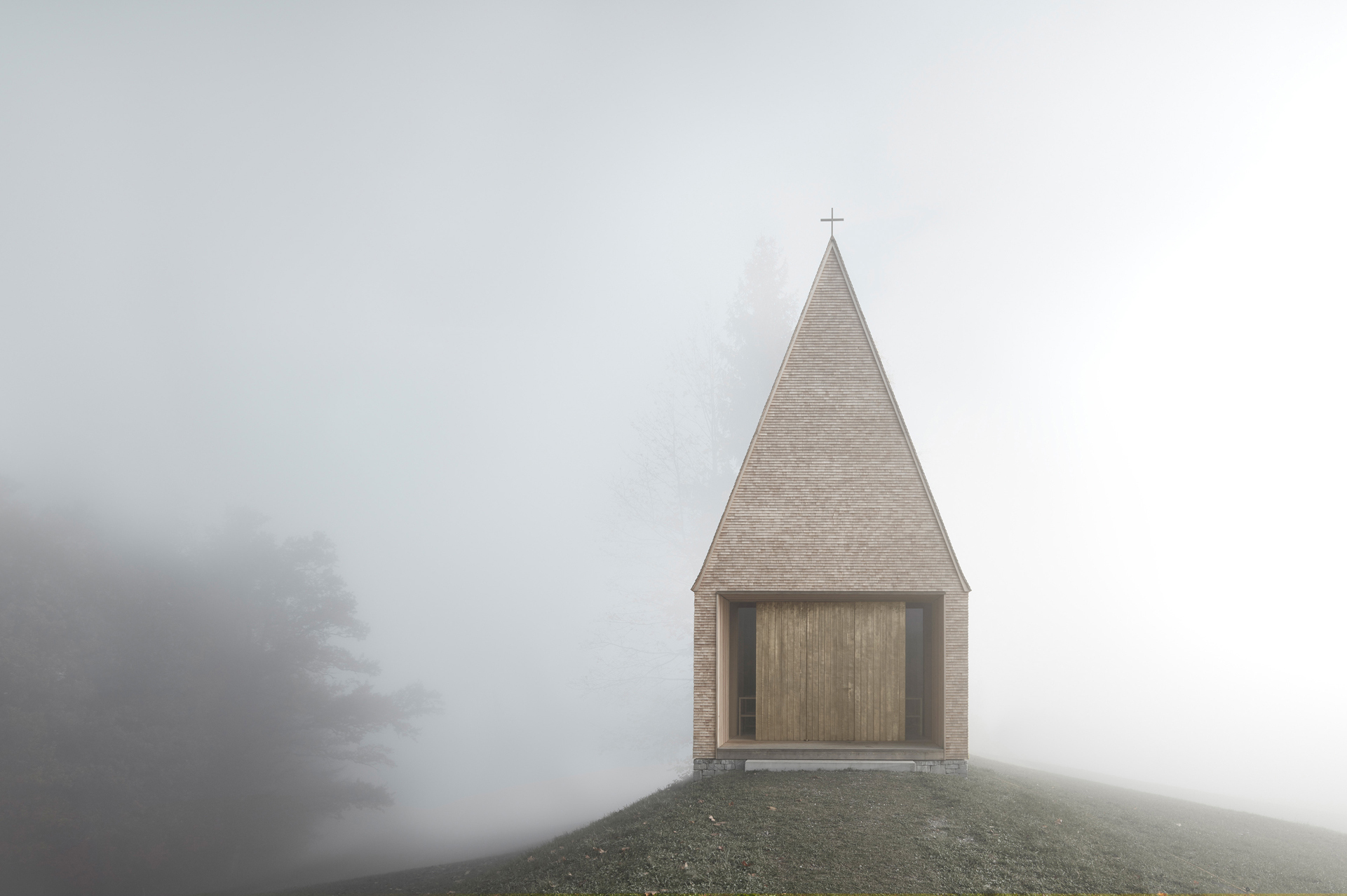 Ohne Turm steht die Kapelle nun auf einem schmalen Plateau, gerahmt im Hintergrund durch eine Reihe von Bäumen. Ihr hoch aufragendes, steiles Dach charakterisiert die Form der Kapelle, die monolithisch wirkt, weil Dach und Wandflächen mit einem Material, Lärchenschindeln, bekleidet sind. Eine Steinstufe führt vom Wiesensaum hoch. Ein nicht alltägliches Bauwerk hat traditionell ein Fundament, auch wenn es in der offenen Landschaft steht. Der langsamen Annäherung über den Pfad entsprichtein offener Vorbereich unter dem Dach, das Westwerk. Auch das schwere zweiflügelige Portal aus Holz, das außen mit Messing in schöner Handarbeit beschlagen ist, verlangsamt die Annäherung. Innere Sammlungbraucht Zeit.