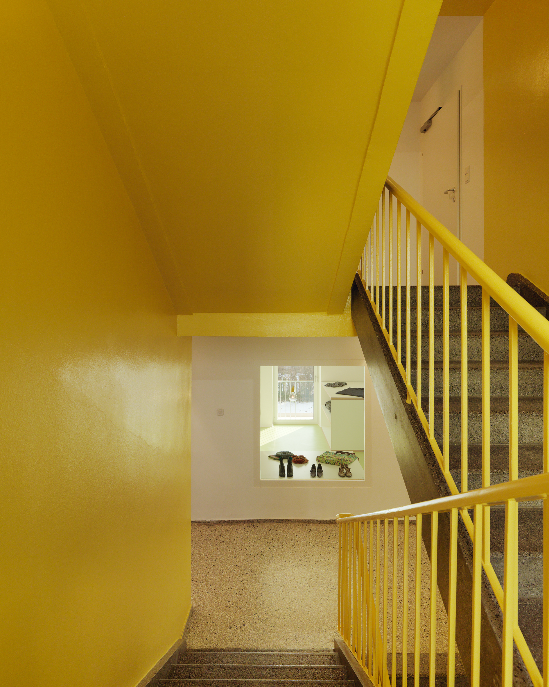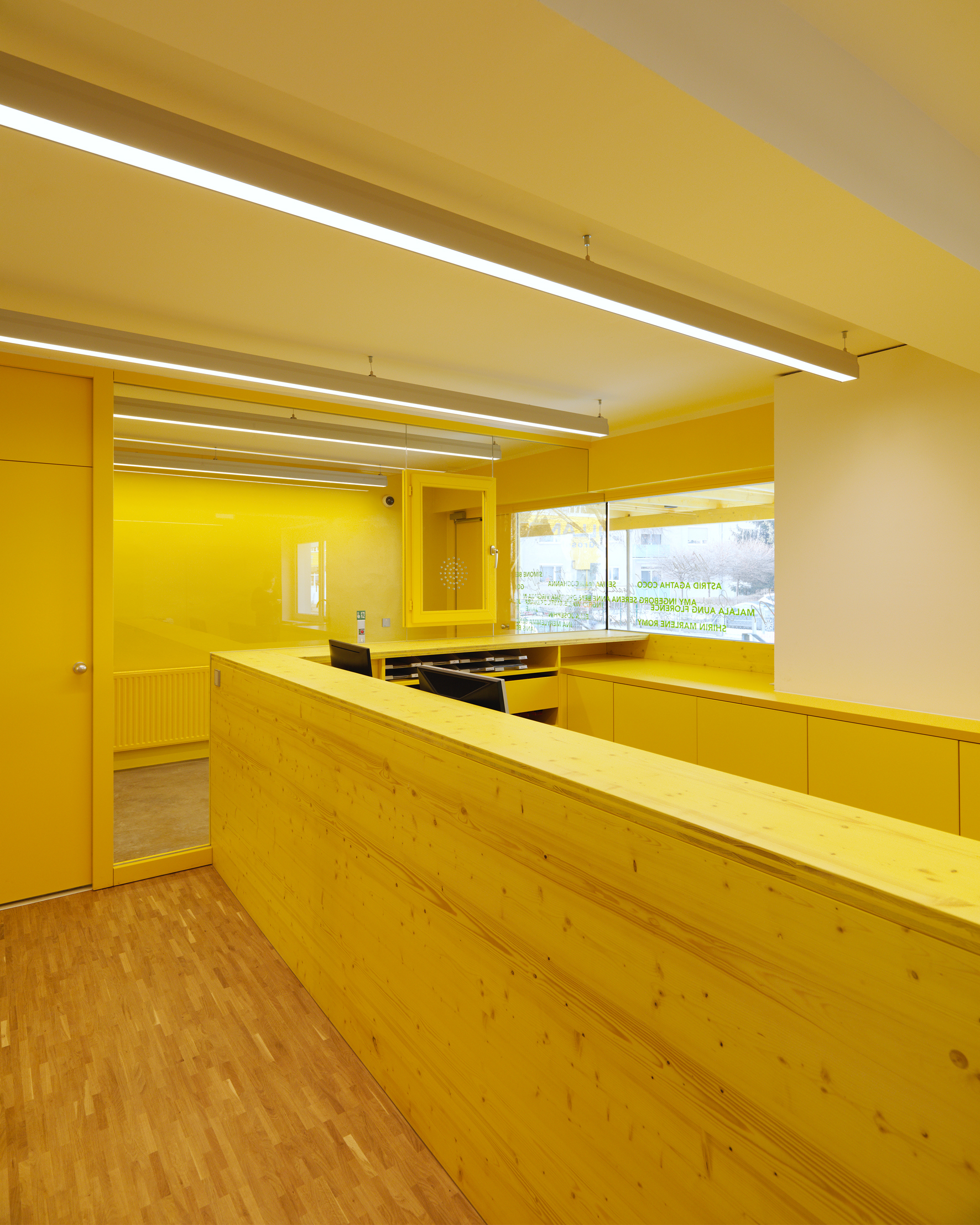 Das Farbkonzept unterscheidet private von öffentlichen Zonen: Empfang in freundlich leuchtendem Gelb