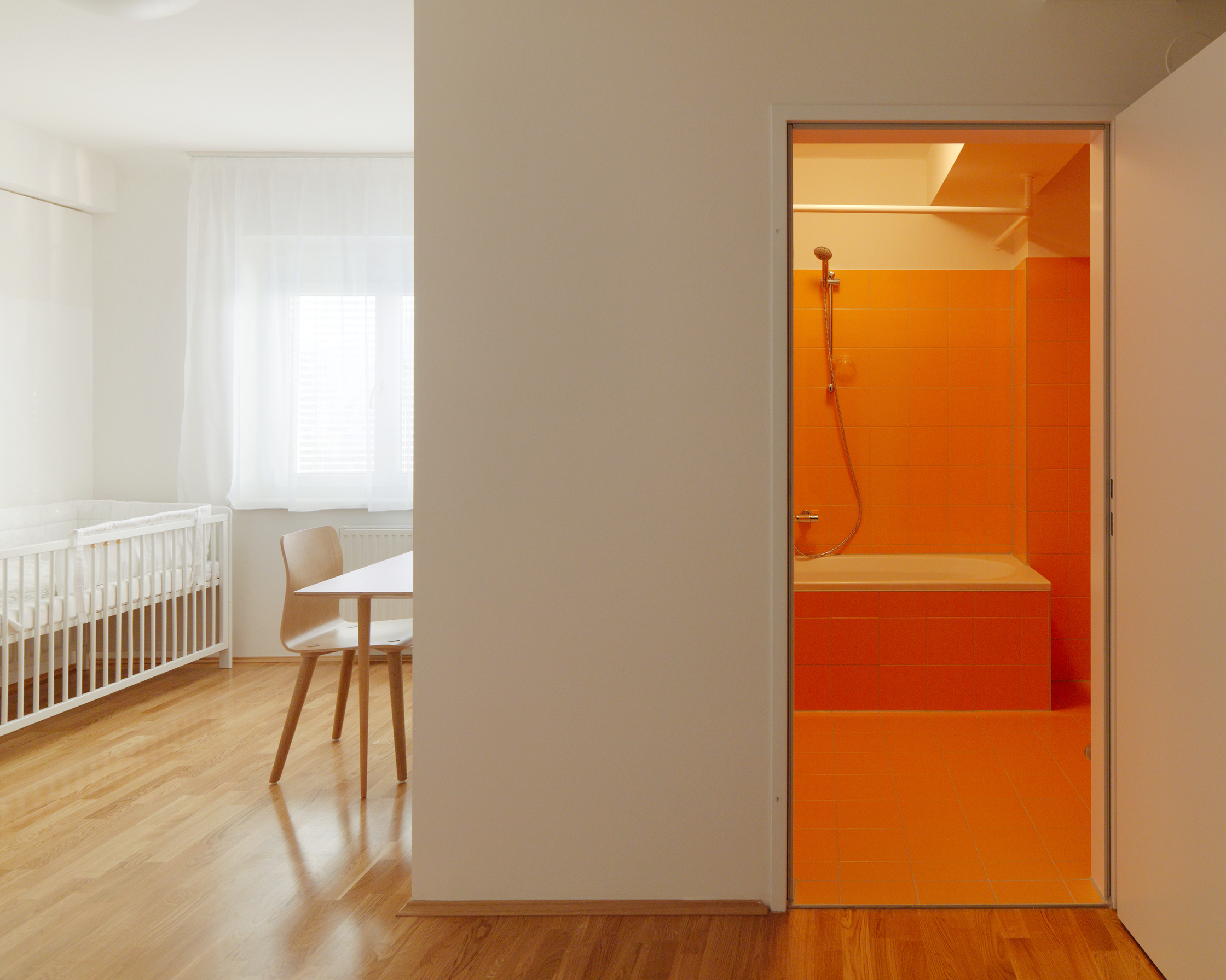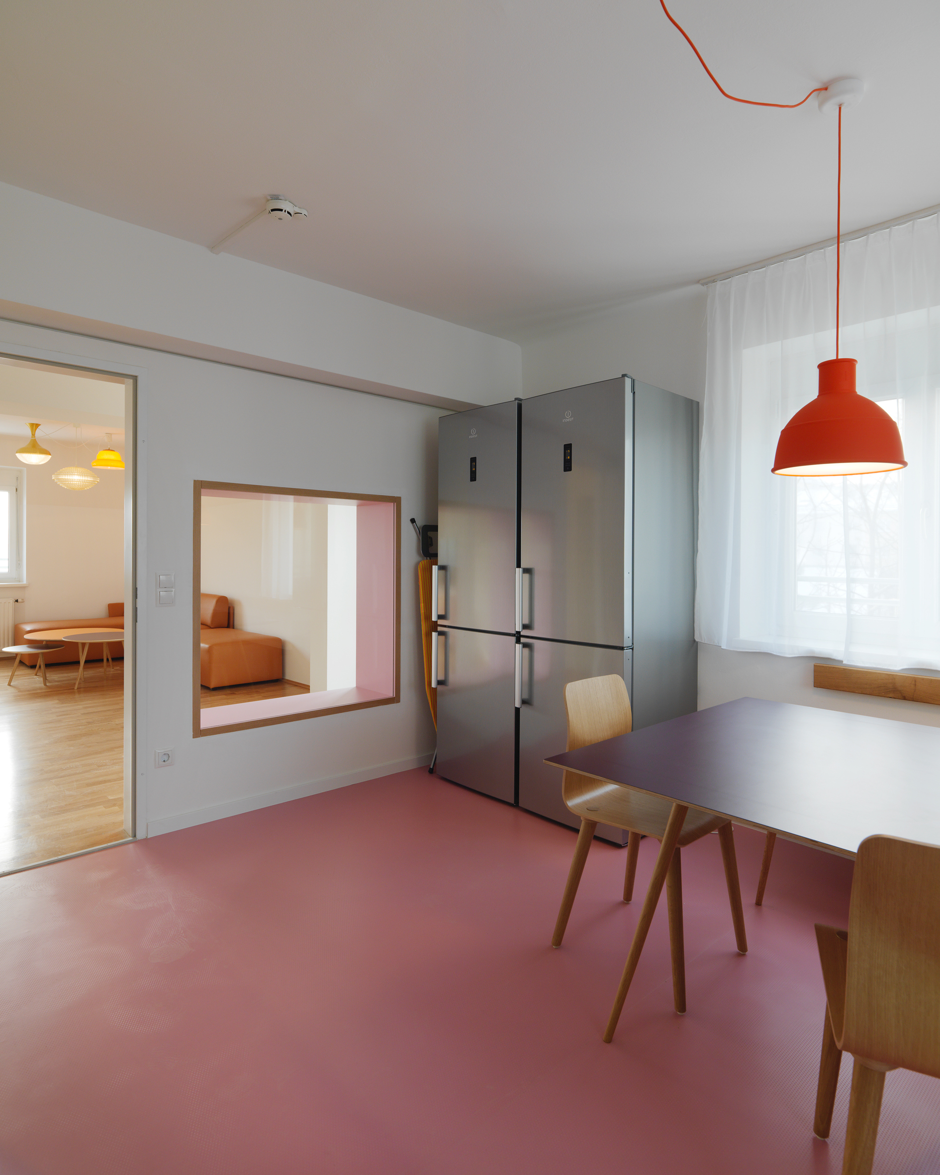 Rot-orange-mauve Töne in den Wohnbereichen. Küche und Wohnzimmer ist für alle in der Wohngemeinschaft und entsprechend großzügig.