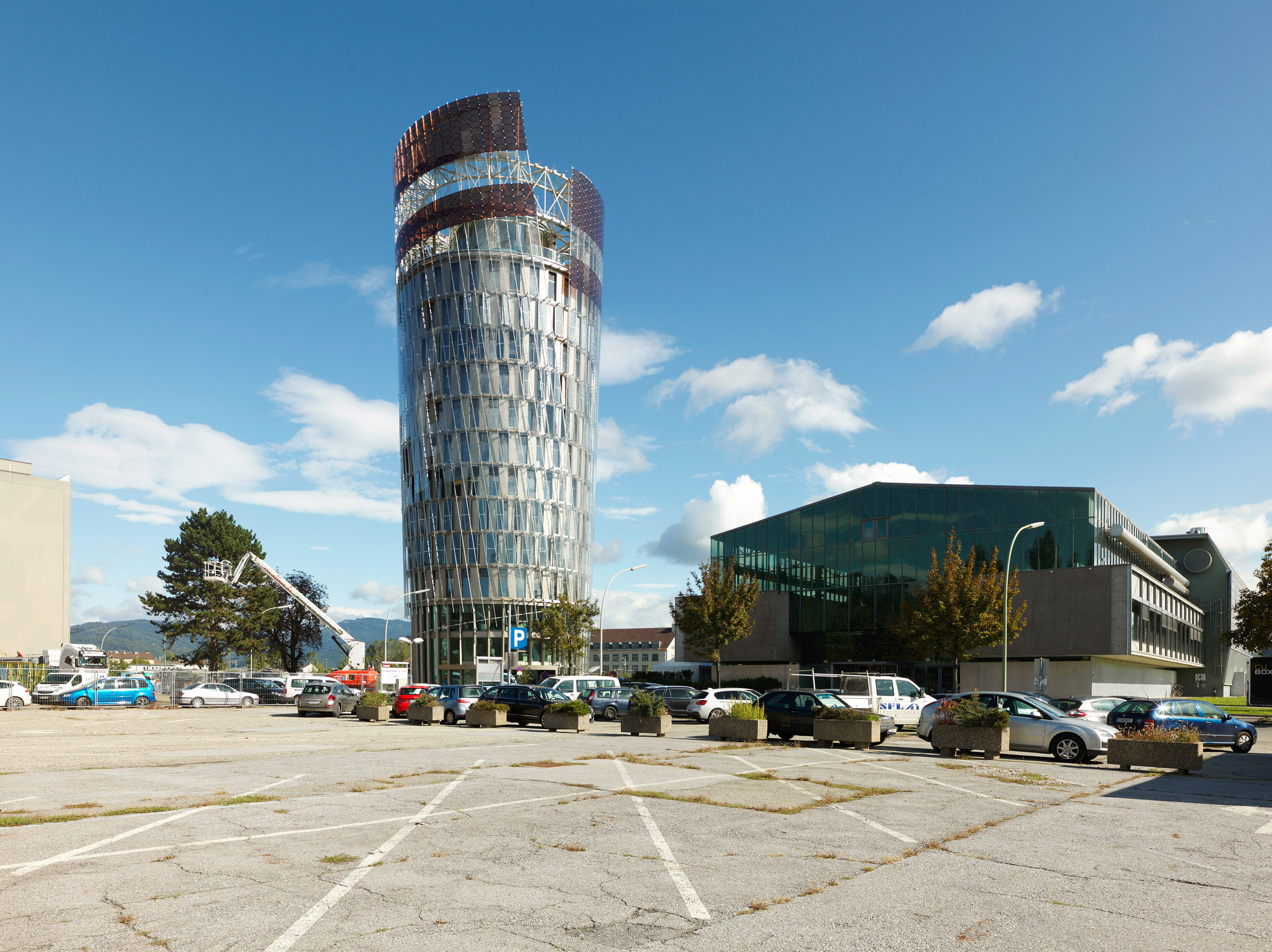 „Noch hat die Grätzelzelle einen sehr geringen Wirkungsgrad“, sagt Pernthaler und beziffert diesen mit sechs Prozent. „Aber früher oder später muss man mal anfangen, neue Technologien einzusetzen und empirische Alltagswerte zu sammeln, sonst findet Entwicklung niemals statt.“ Ursprünglich habe man die Grätzelzellen in den obersten Geschoßen des Turms grün färben, also mit Chlorophyll beschichten wollen, aber das wäre in diesen Dimensionen, in denen die Farbstoffsolarzelle übrigens erstmals zum Einsatz kommt, zu teuer gewesen.