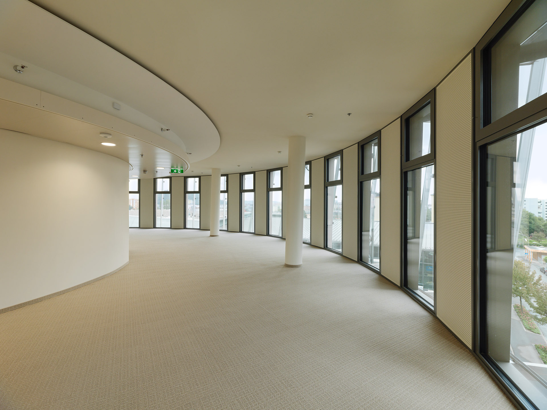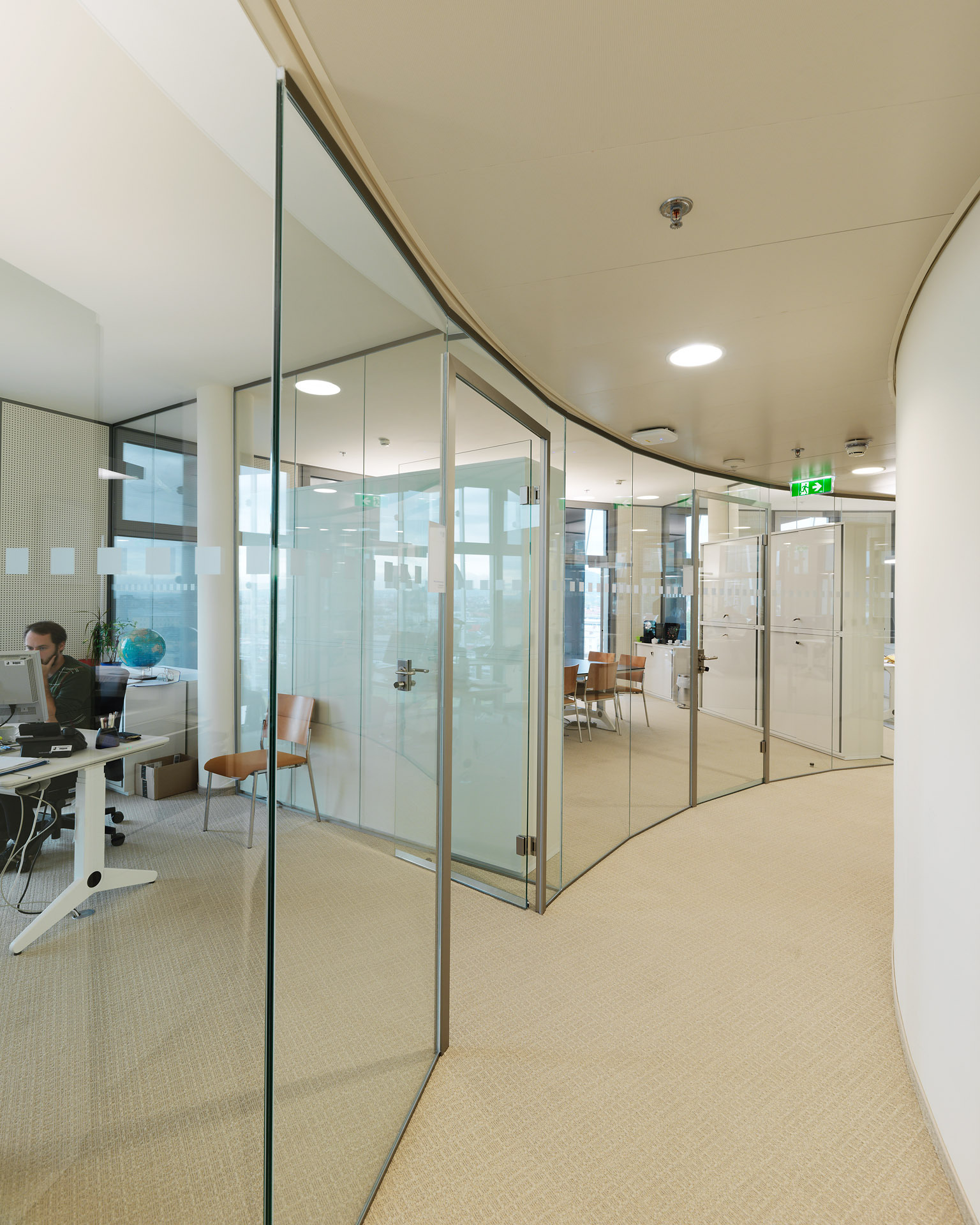 Und tatsächlich ist der Turm, der über Geothermie gespeist wird und weder über Heizkörper noch Klimageräte verfügt, die Summe von Innovationen und weltweiten Premieren. Es fängt bei der braun-orangen Glasfassade an, die sich wie ein Gruß aus den Siebzigerjahren um den Turm wickelt und gleich einem geblähten Segel nach oben ragt. Was auf den ersten Blick wie ein mäßig geglücktes Stilzitat anmutet, ist in Wirklichkeit nichts anderes als ein kleines Kraftwerk, das in der Lage ist, mittels technisch nachgebildeter Fotosynthese Strom zu produzieren.
