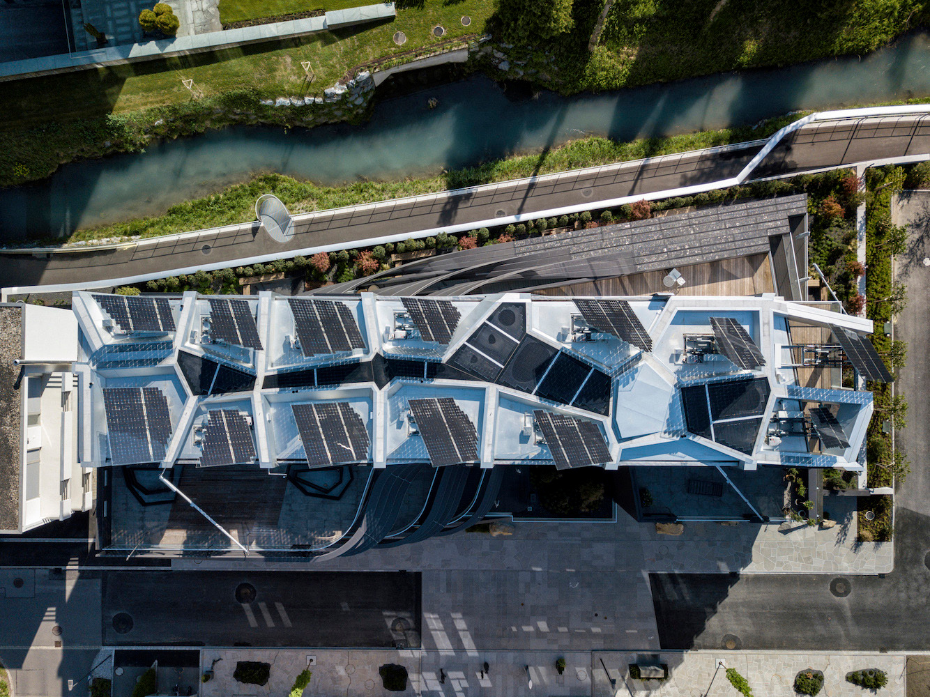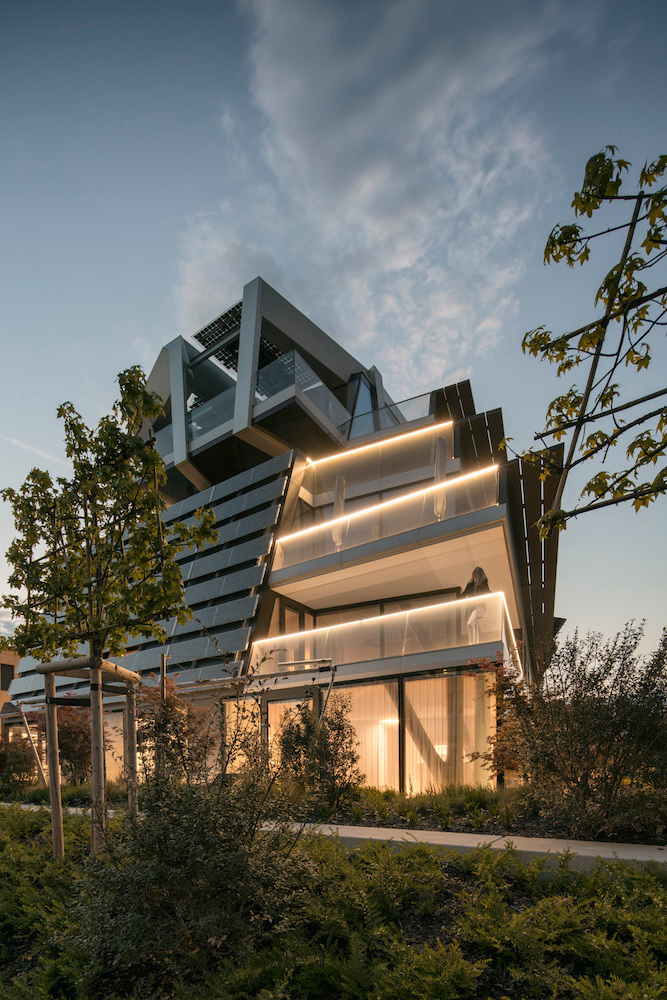 Neben den beweglichen Paraffinspeichern an der Fassade gibt es Geothermie, Grundwassernutzung sowie aktive und passive solare Nutzung. Die gesamte Südseite sowie ein Großteil der Dachfläche sind mit Fotovoltaikpaneelen verkleidet (Leistungsvolumen 32,4 kW Peak). Um die Stromgewinnung zu erhöhen, sind die PV-Elemente mit einem Solar-Tracker ausgestattet. Dieser ist mit der meteorologischen Station verbunden und hat die exakt errechneten Sonnenstandskoordinaten bis ins Jahr 2117 eingespeichert. Dank der Motoren, die wie eine Sonnenblume exakt dem Sonnenverlauf folgen, indem sie die Paneele drehen, hochklappen und im Fünf-Minuten-Takt hydraulisch nachjustieren, kann die Stromausbeute um fast 300 Prozent gesteigert werden.