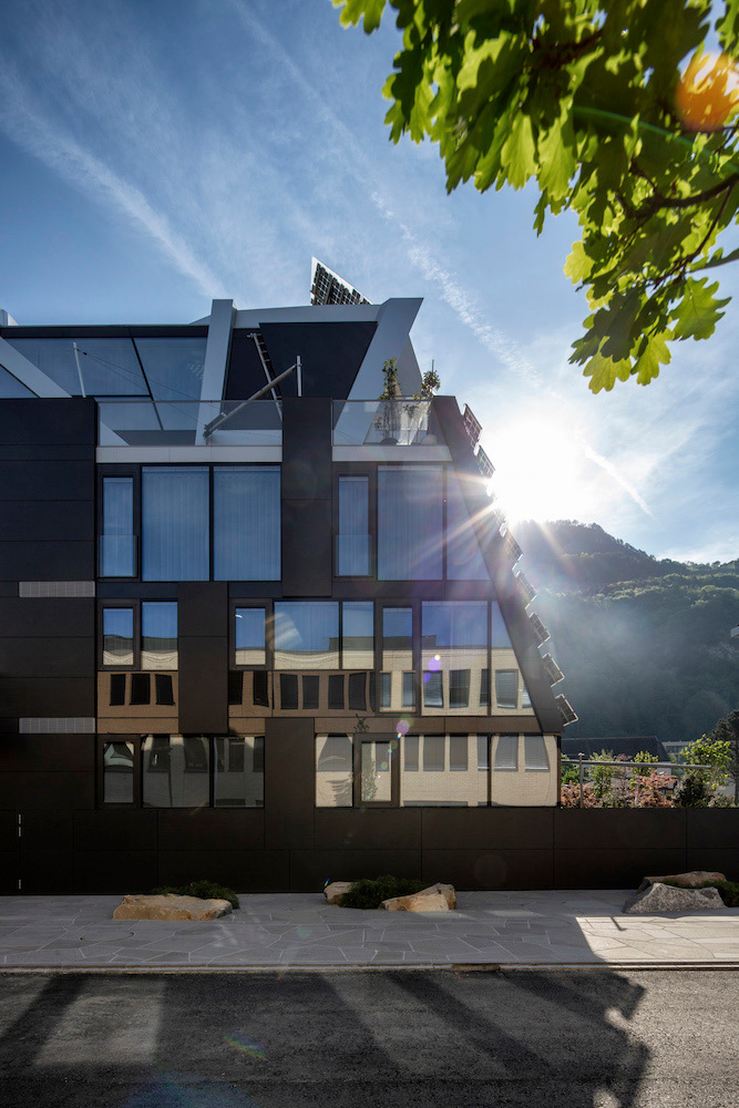 Es ist, als wäre soeben ein silbrig-schokobraunes Ufo im kleinen Fürstentum gelandet. Während im Hintergrund der neugotische Kirchturm zu St. Florin in den Rheintalhimmel ragt und sich um einen Hauch historischer Präsenz bemüht (ziemlich vergeblich), macht sich in Vaduz am Gerberweg 1 ein hyperfuturistisches Wohnhaus breit, von dem man schon jetzt sicher sein kann, dass es wie ein heiliger Gral durch die internationale Forschungs- und Technologielandschaft gereicht werden wird.