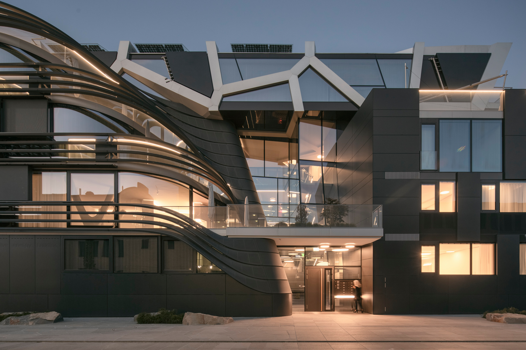 Im Active Energy Building sind insgesamt acht Tonnen Paraffin verbaut. In diesen schwergewichtigen Dimensionen fand PCM noch nie zuvor den Weg in die Baubranche. Es ist eine Weltpremiere. Je nach Sonnenstand, je nach Tages- und Nachtzeit klappen in den obersten zwei Stockwerken mobile Flügel auf, die sich entweder zur Sonne oder zum nächtlichen Sternenhimmel recken und das Paraffin bei 32 Grad Celsius verflüssigen beziehungsweise bei 21 Grad Celsius gefrieren lassen. Im zugeklappten Zustand kann die Wärme- und Kälteenergie über Lufttauscher direkt ins Lüftungssystem gespeist werden. Auf diese Weise kann der Heiz- und Kühlbedarf des Hauses um rund 25 Prozent reduziert werden.