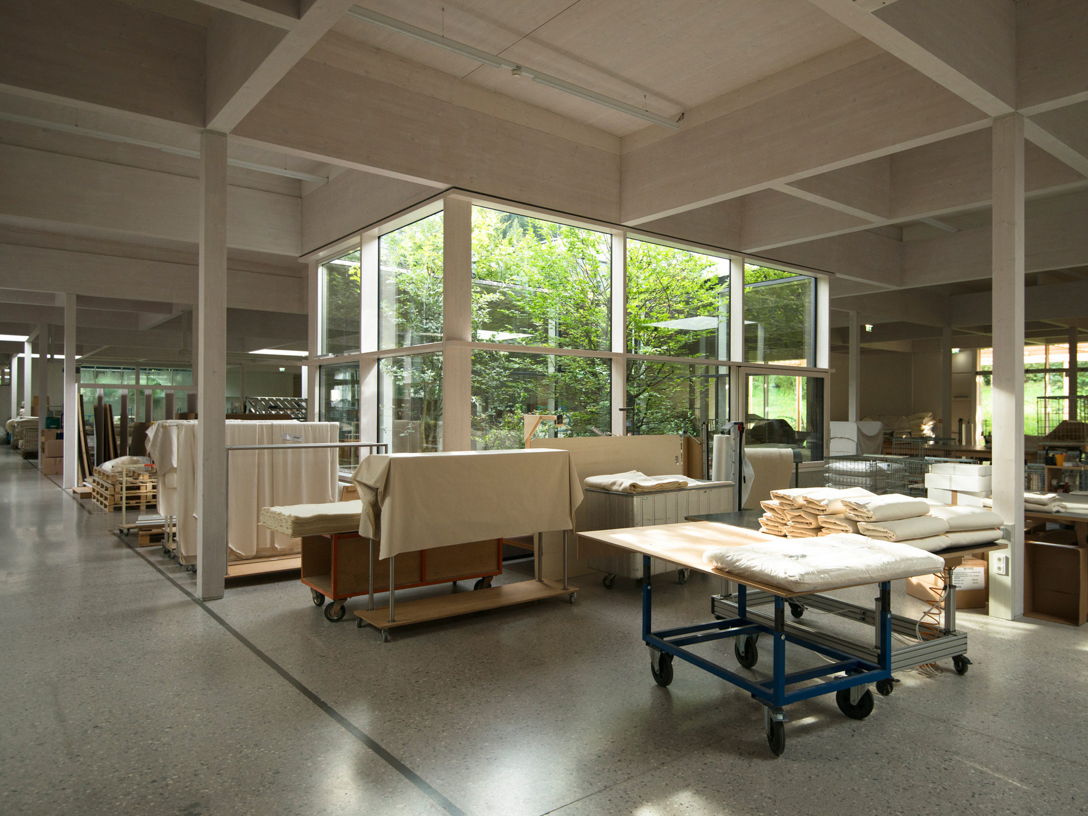 Kainrad, 55 Jahre alt, ist Teamleiterin in der Schneiderei. Gemeinsam mit ihren 20 Mitarbeiterinnen in der Abteilung sitzt sie zwischen Nähmaschinen, Dampfbügelgeräten und schrankgroßen, radgetriebenen Spulen, auf die Fäden, Garne und naturfarbene Baumwollstoffe aufgewickelt sind. Doch anders als in anderen Fabriken ist sie nicht Gefangene in irgendeiner gesichtslosen Industriehalle mit Dämmpaneelfassade und Trapezblechdecke, die einzig und allein dem Prinzip der Kosteneffizienz folgt, sondern arbeitet in einem mittlerweile preisgekrönten Holzbau – mit Blick auf eines von insgesamt 13 begrünten Atrien, die wie sinnliche Luft- und Pflanzenwürfel aus dem rund 9000 Quadratmeter großen Gebäude ausgestanzt sind.