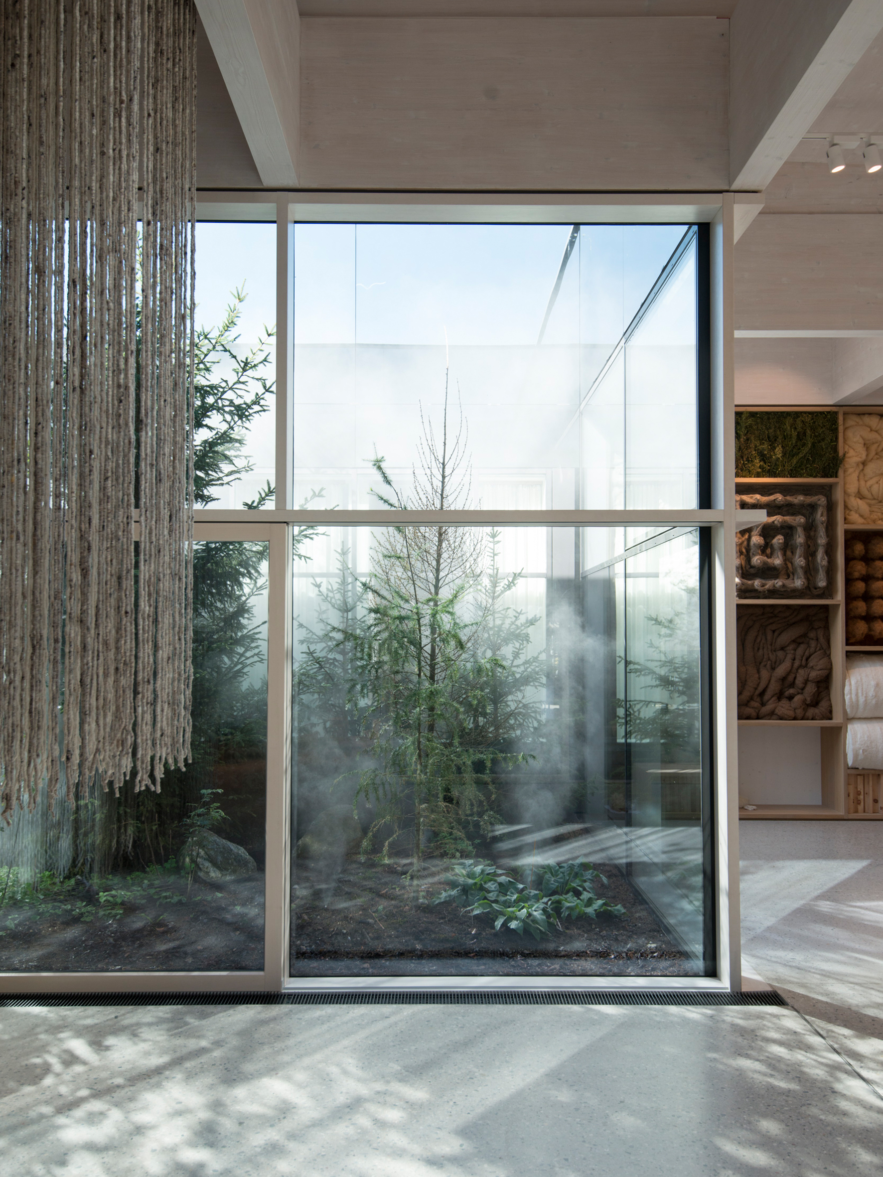 Die 13 Lichtatrien schließlich, die 13-mal unterschiedlich bestückt und bepflanzt sind und auf diese Weise die verschiedensten Rohstoffquellen der Grünen Erde sichtbar machen, sind nicht nur Lichtspender, sondern dienen auch zur sommerlichen Querlüftung. Große Öffnungsflügel machen die winzigen Miniaturwälder spür- und riechbar. „Es ist ein schöner Job an einem tollen Ort, aber den ganzen Tag lang zu arbeiten hat trotzdem etwas Ermüdendes“, sagt Maria Kainrad. „Wenn man dann plötzlich den Nadelwald und die blühenden Sträucher riecht, sobald man die Fenster aufmacht, ist das schon ziemlich lässig.“