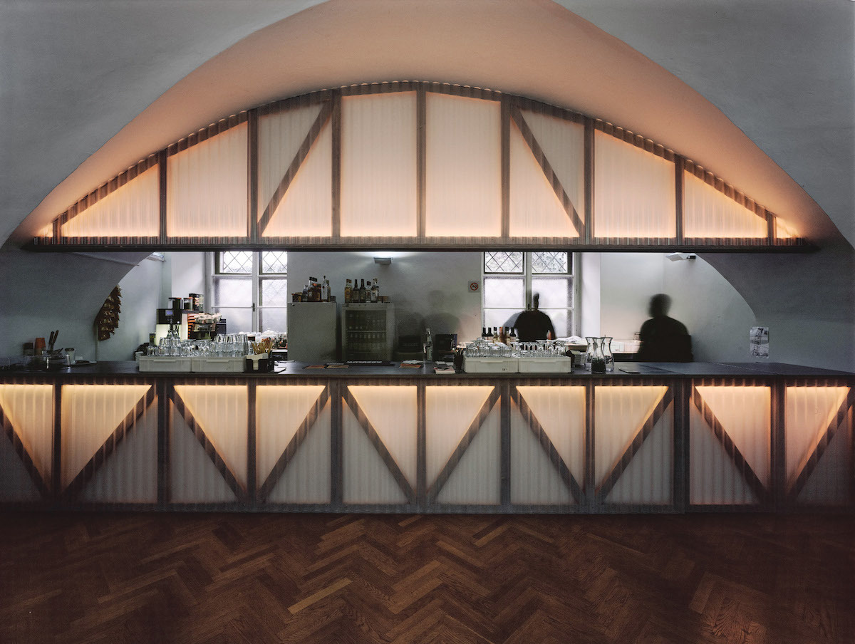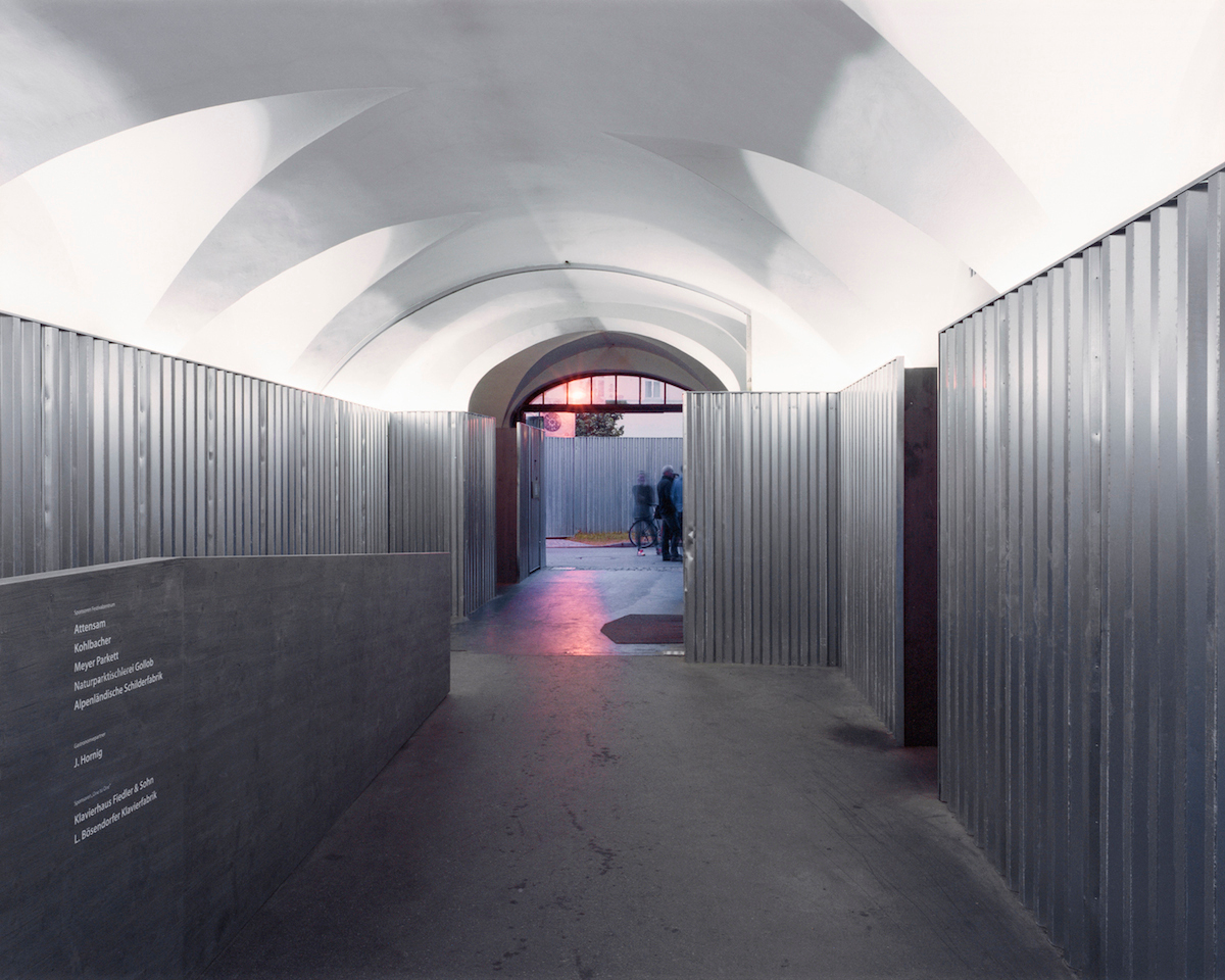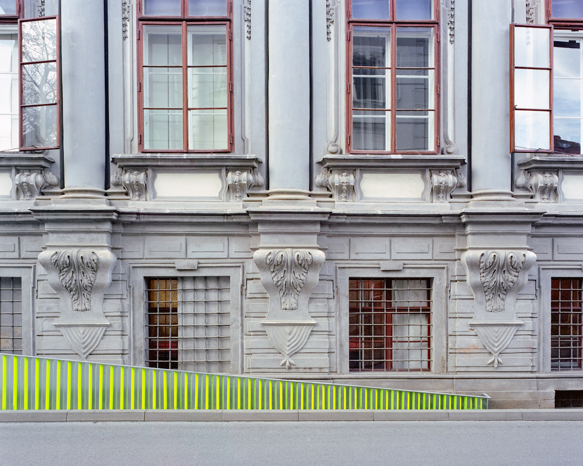 Architekturelement und Leitsystem in einem: ansteigende Trapezblechkulisse und gelbe Reflektorbänder