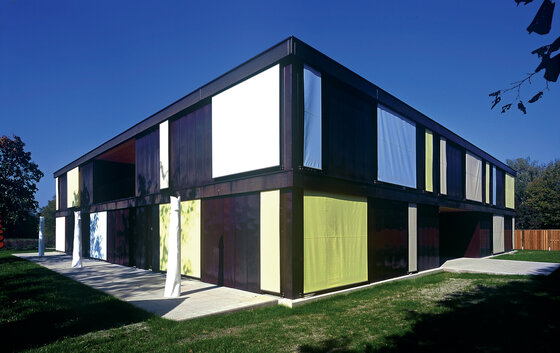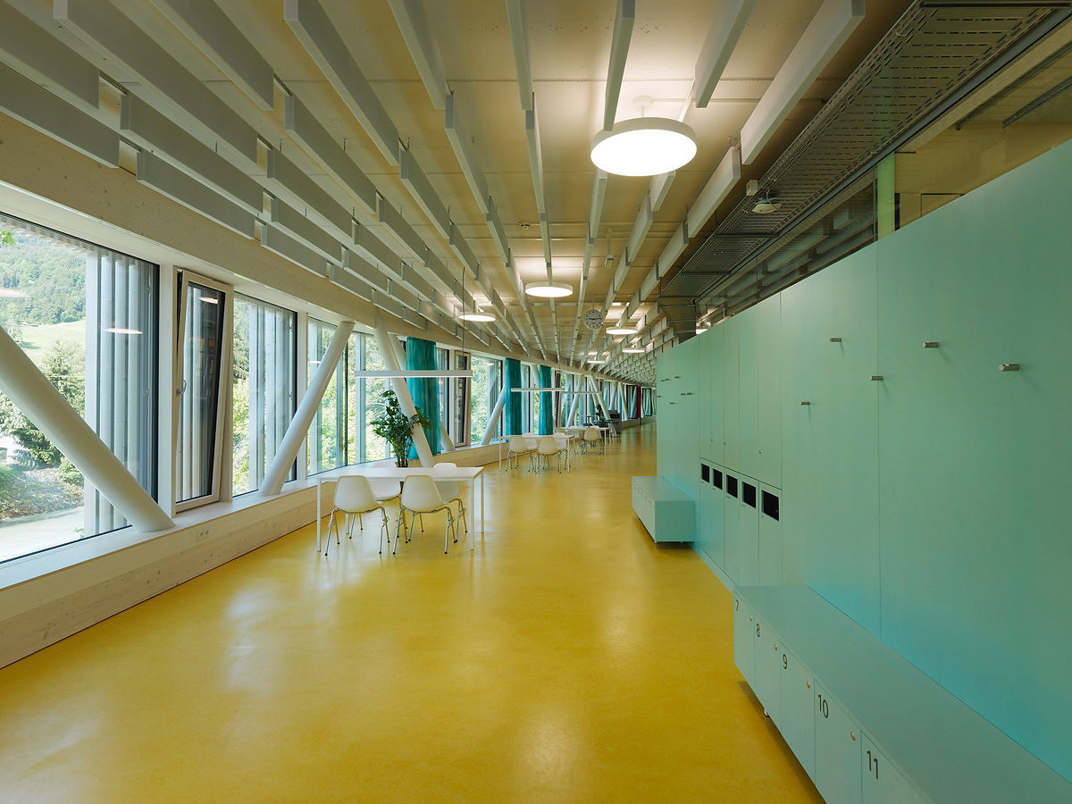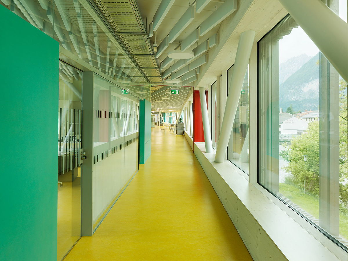 Die Architekten Hemma Fasch und Jakob Fuchs schlugen ein völlig anderes Konzept vor: einen auf Stützen über der Uferpromenade schwebenden eingeschoßigen Baukörper, der den bestehenden Gebäuden vorgelagert und durch Brücken mit ihnen verbunden ist. Erfahrungen mit dem Thema einer scheinbar schwebenden Architektur haben Fasch und Fuchs bereits mit der Schiffstation für den Twin City Liner Wien–Bratislava am Wiener Donaukanal gesammelt. Das Projekt in Lienz ist mit seinen knapp über 150 Meter Länge deutlich größer und von seiner Funktion her komplexer. Vor der Länge scheuen sich Fasch und Fuchs nicht, im Gegenteil: Die innere Erschließung läuft schnurgerade über diese Länge durch, während sich zuerst auf der einen, dann auf der anderen Seite die Nutzflächen anordnen und dabei elegant den Bäumen ausweichen, die nach Möglichkeit erhalten bleiben sollten. An einigen Stellen kommt der horizontale „Flieger“ den Baumstämmen erstaunlich nahe, was nur möglich ist, weil sein Brückentragwerk auf wenigen Fundamentpunkten ruht und damit die Wurzeln der Bäume nicht beschädigt. Im Inneren des fliegenden Baukörpers dürfen sich die Nutzer wie in einem Raumschiff fühlen, das gerade an seinem Landeplatz an der Isel angedockt hat. Die Böden sind in einem kräftigen Gelb gehalten, die leichten Trennwände in einem Graublau, das an die Farbe der Dolomiten erinnert, und die Vorhänge im wässrigen Grün des vorbeirauschenden Flusses. Die Fachwerkkonstruktion, geplant von Werkraum Ingenieure, besteht aus runden, weiß gestrichenen Stahlrohren und überwindet die großen Spannweiten mit beachtlicher Leichtigkeit. Für Boden und Decke kamen Stahlbeton-Hohldielen mit bis zu 17 Meter Spannweite zum Einsatz, die zwischen den geschoßhohen Fachwerken an den beiden Längsseiten des Baukörpers gespannt sind.