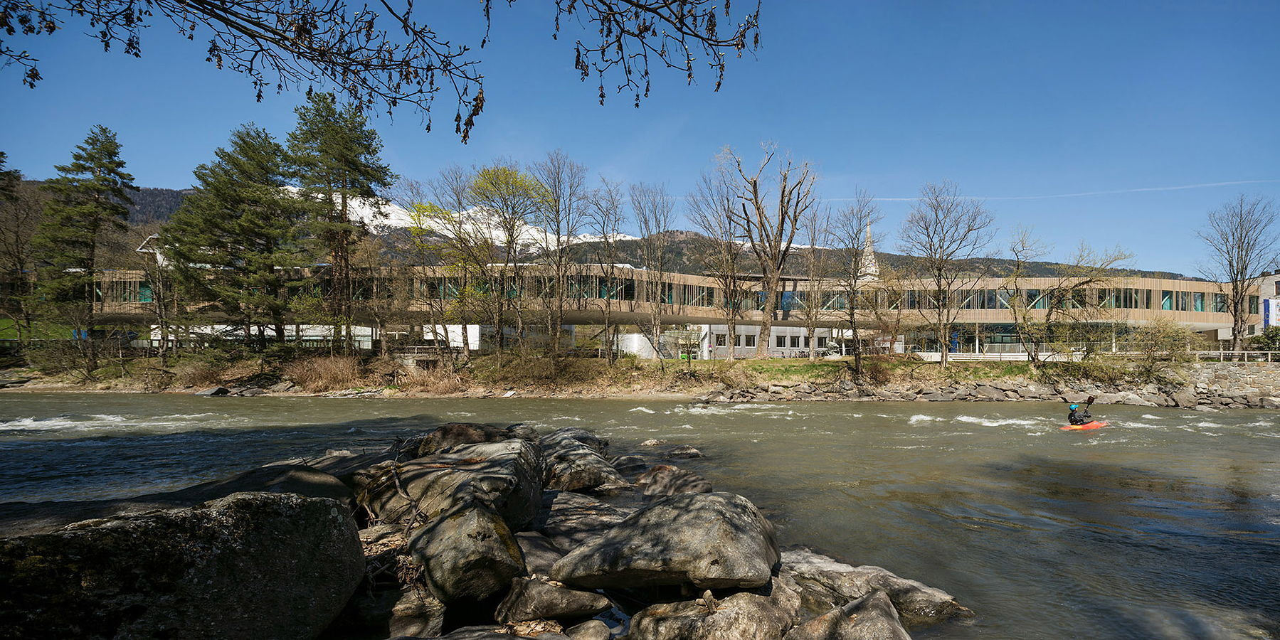 Die Rahmenbedingungen für diese Aufgabe waren ausgesprochen schwierig. Der Standort am Ufer des Flusses Isel ist bereits mit Bestandsbauten besetzt, die über die Jahre gewachsen sind. Den Anfang machte die Fachberufsschule, zu der später die formal private, de facto aber von Bund, Land und Gemeinde getragene HTL kam, die sich auf Mechatronik spezialisiert hat. Diese bestehenden Einrichtungen sollten erweitert und um neue Räume für die Außenstelle von LFUI und UMIT ergänzt werden.