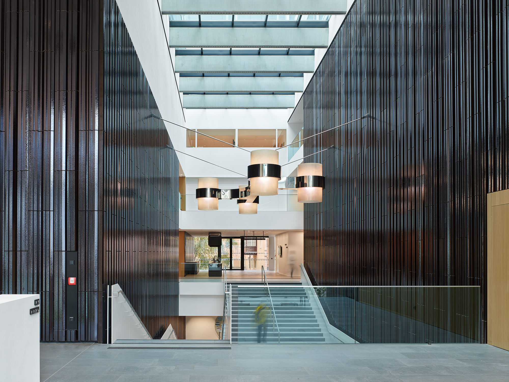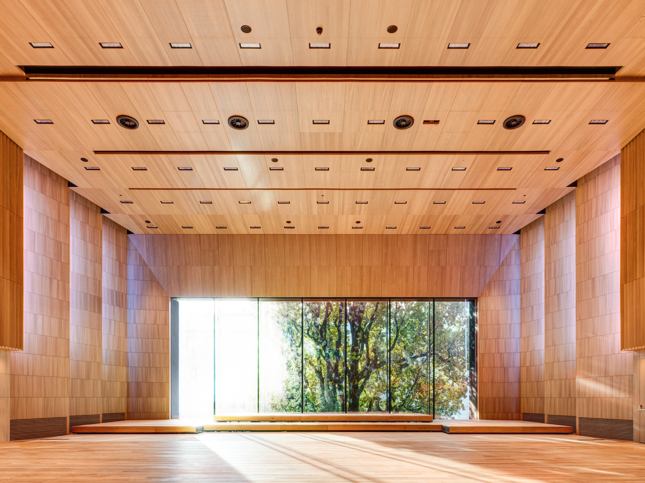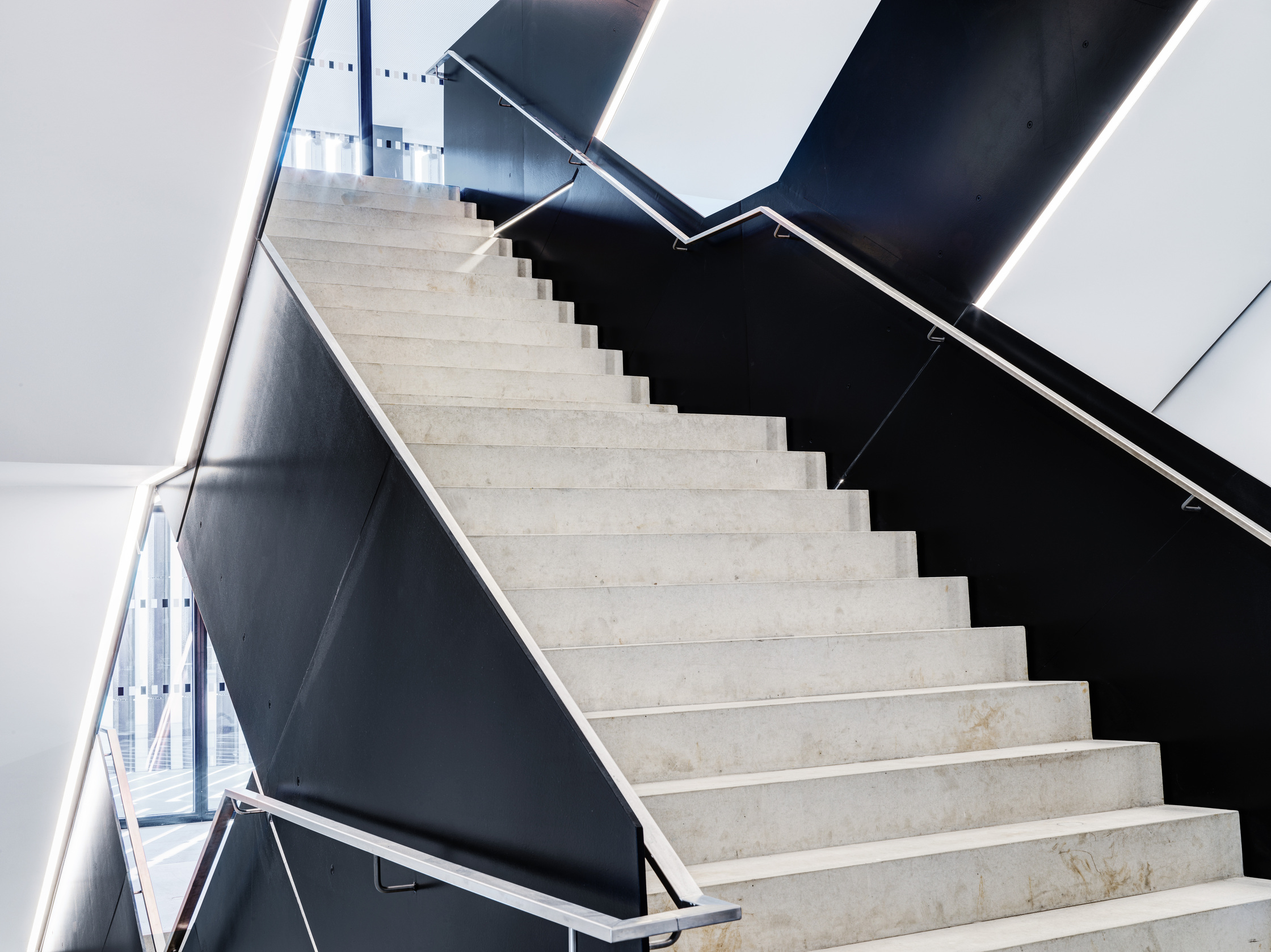 „Das richtige Raumprogramm war eine echte Herausforderung“, sagt der Innsbrucker Architekt und Wettbewerbssieger Erich Strolz, der das Projekt gemeinsam mit dem Vorarlberger Büro Dietrich Untertrifaller realisierte. „Es ist nicht nur ein Konzerthaus mit insgesamt vier verschieden großen Konzert- und Kammersälen, sondern vielmehr eine Art kulturelles Infrastrukturgebäude, in dem auch unterrichtet und verwaltet wird.“ Aus einigen Musik- und Seminarräumen der in den oberen Etagen angesiedelten Institute blickt man durch das Glasdach direkt nach unten ins Foyer. Köpfe mit hochgesteckten Frisuren und Abendroben werden bald das Sichtfeld dieser Räume prägen.