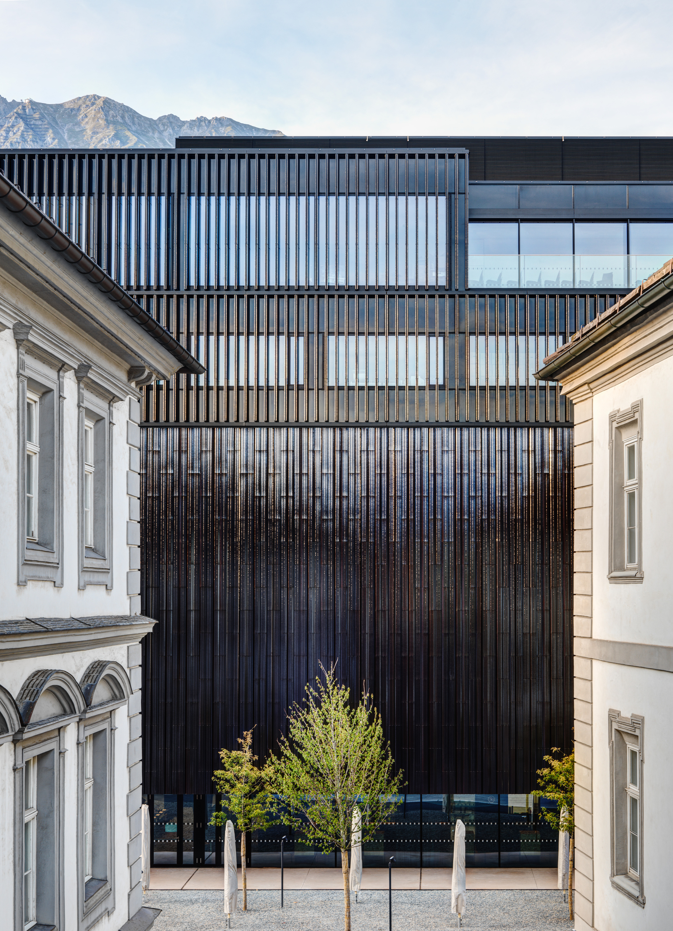 „Wir haben lange nach einem passenden Material für die Fassade gesucht“, erinnert sich Strolz, der zu Beginn mit hellen Keramikplatten und sogar hölzernen Lamellen experimentiert hat. Doch nachdem sich selbst die Chronikredaktionen der lokalen Medien in die Debatte eingeschaltet und danach getrachtet haben, die Bevölkerung nach und nach zu instrumentalisieren, wurde kurzerhand das Bundesdenkmalamt, der Innsbrucker Stadt- und Ortsbildschutzbeirat, der Innsbrucker Gestaltungsbeirat sowie ein eigens ins Leben gerufener Projektbeirat unter der Leitung von Ernst Beneder und Elke Delugan-Meissl zurate gezogen.
