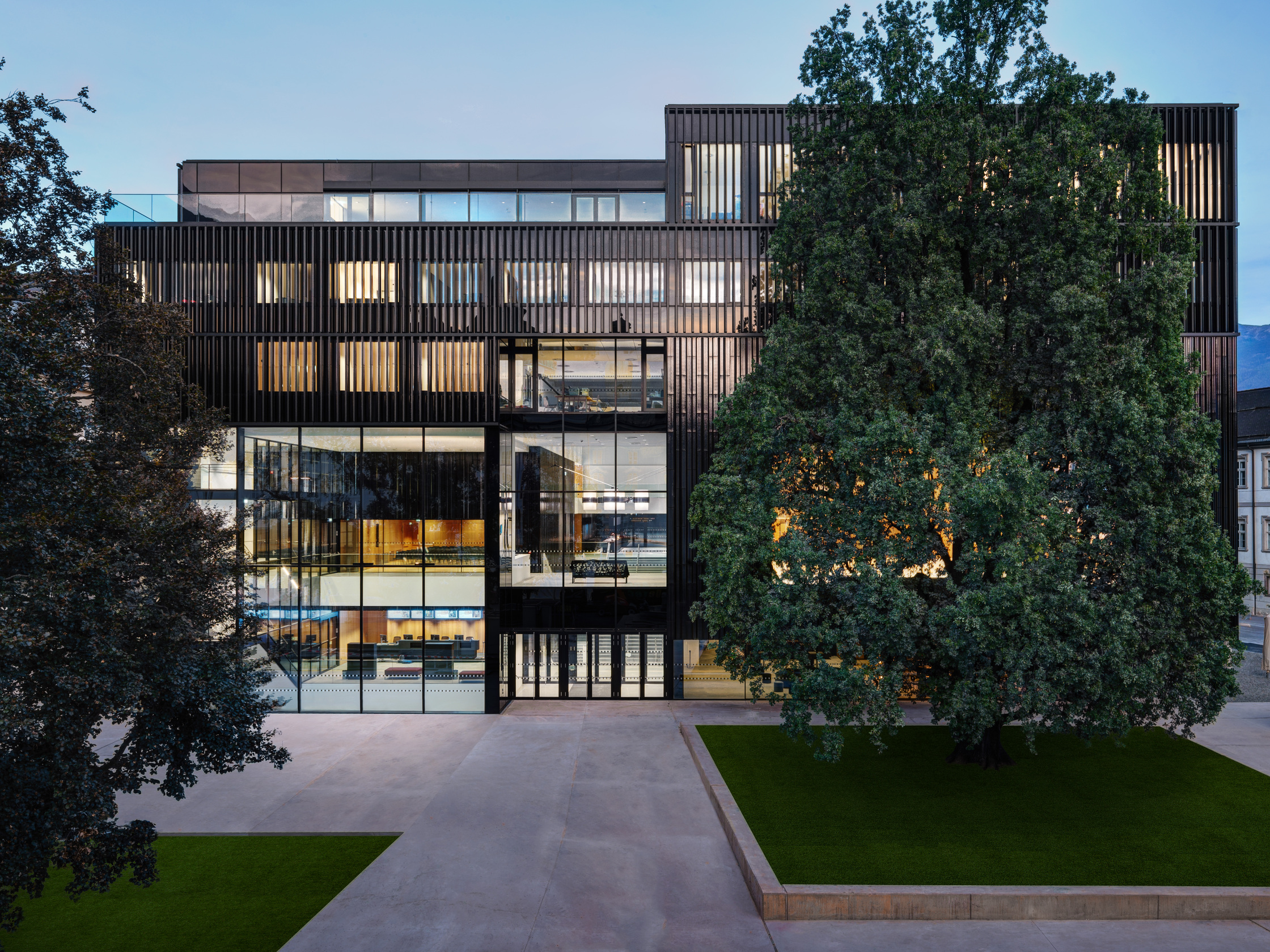 Und dann das Schwarz. „Das ist kein Schwarz, das ist eine dunkle Farbe, die je nach Tageszeit und je nach Wetter von Rot und Braun bis Aubergine schimmert“, erklärt Architekt Erich Strolz, der diese Entscheidung gemeinsam mit dem Innsbrucker Gestaltungsbeirat gefällt und gegenüber den Ortsbild- und Denkmalschützern verteidigt hat. „Wir haben uns bewusst für eine hochwertige Fassade entschieden, die sich hinter den Bäumen zurücknimmt und die die Farben und Lichtstimmungen der Umgebung reflektiert.“