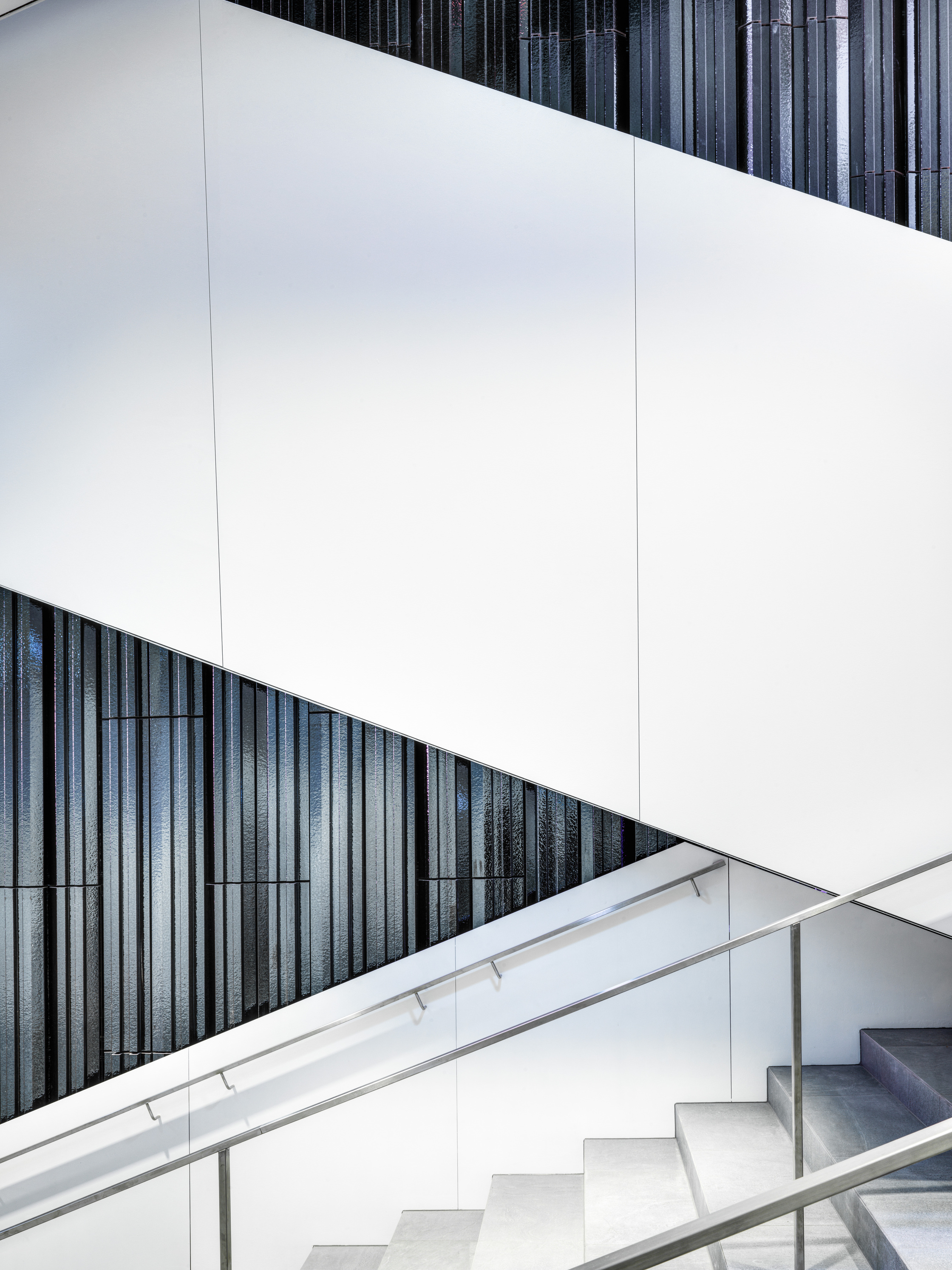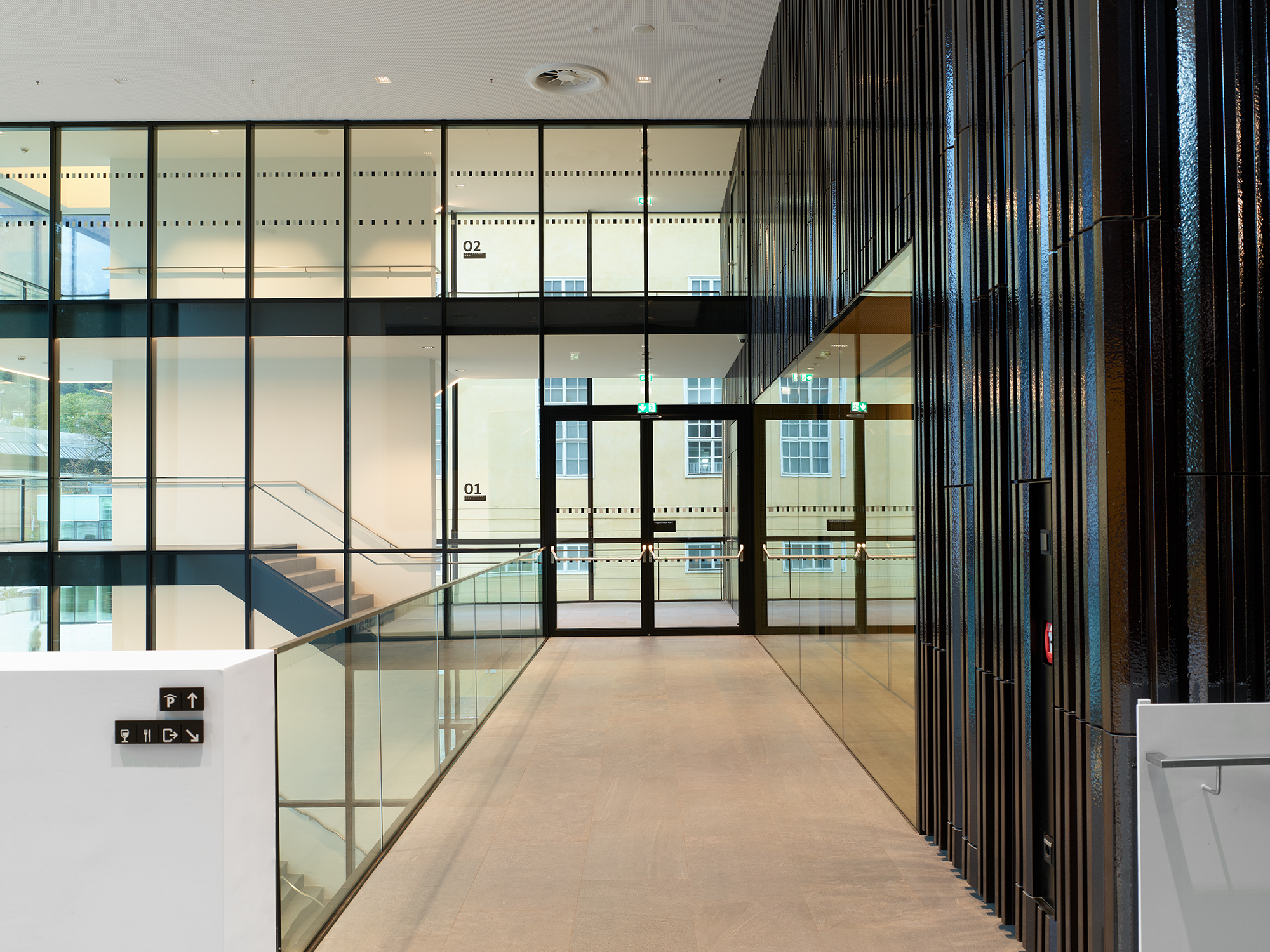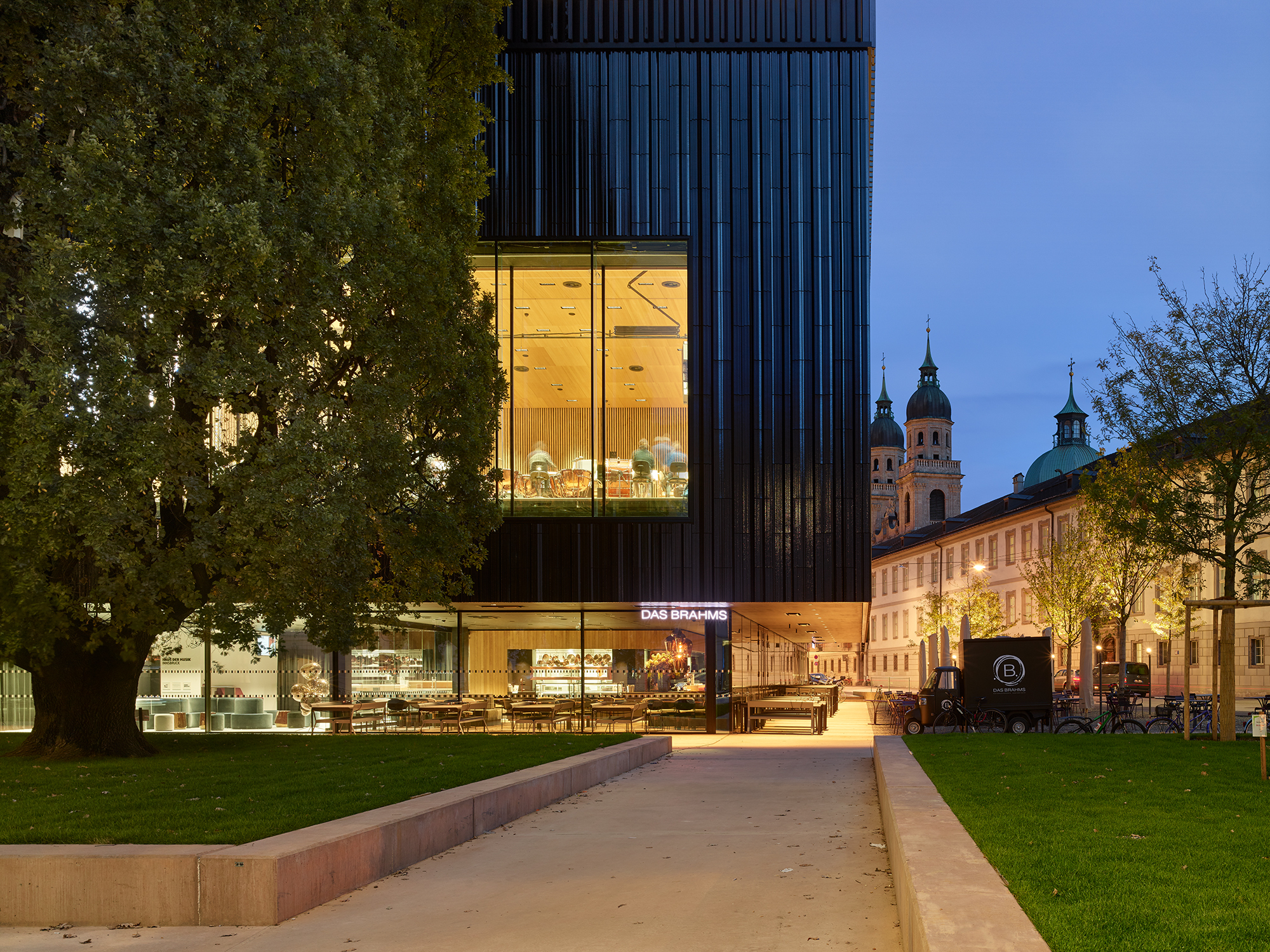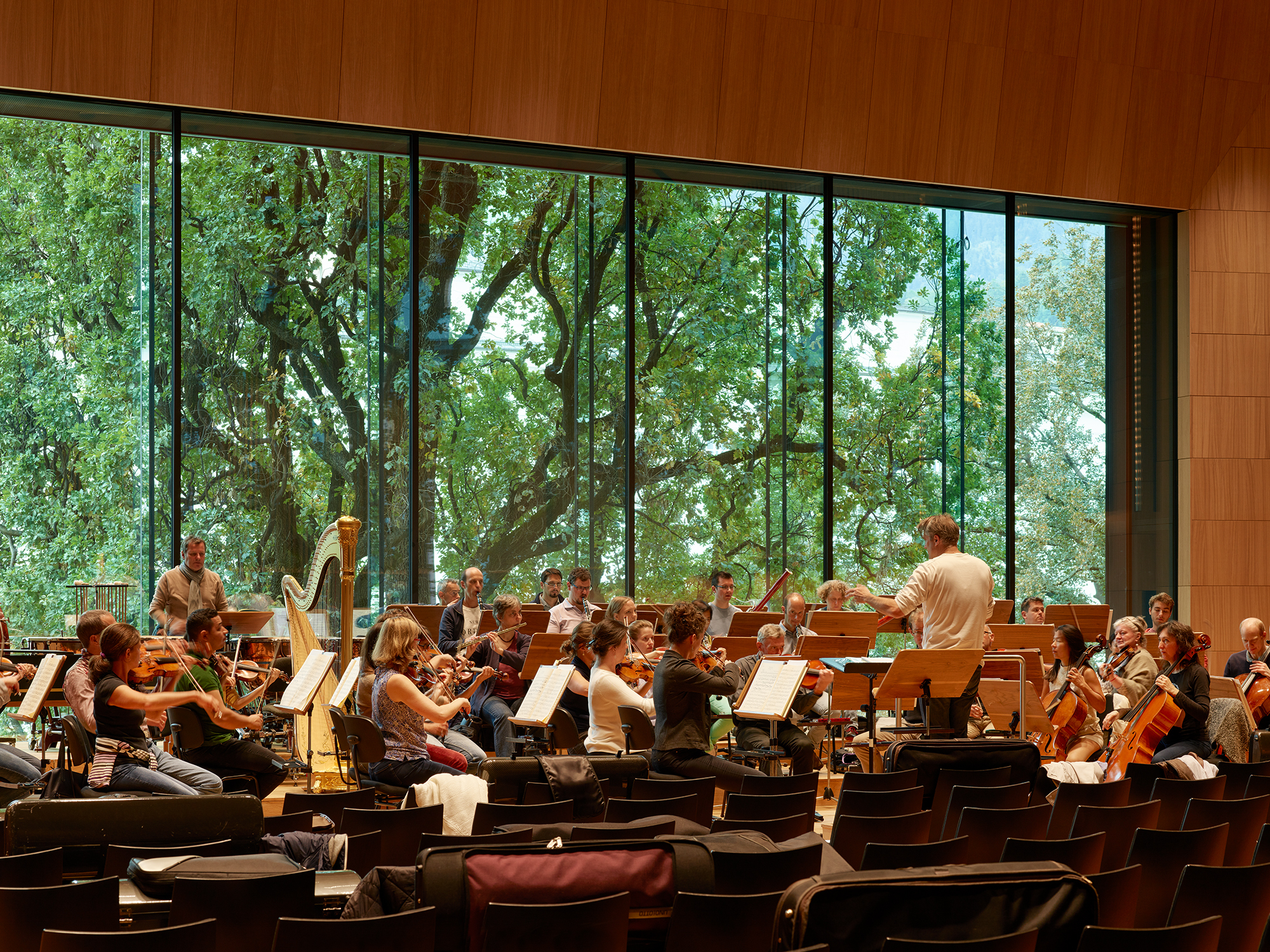 „Das richtige Raumprogramm war eine echte Herausforderung“, sagt der Innsbrucker Architekt und Wettbewerbssieger Erich Strolz, der das Projekt gemeinsam mit dem Vorarlberger Büro Dietrich Untertrifaller realisierte. „Es ist nicht nur ein Konzerthaus mit insgesamt vier verschieden großen Konzert- und Kammersälen, sondern vielmehr eine Art kulturelles Infrastrukturgebäude, in dem auch unterrichtet und verwaltet wird.“ Aus einigen Musik- und Seminarräumen der in den oberen Etagen angesiedelten Institute blickt man durch das Glasdach direkt nach unten ins Foyer. Köpfe mit hochgesteckten Frisuren und Abendroben werden bald das Sichtfeld dieser Räume prägen.