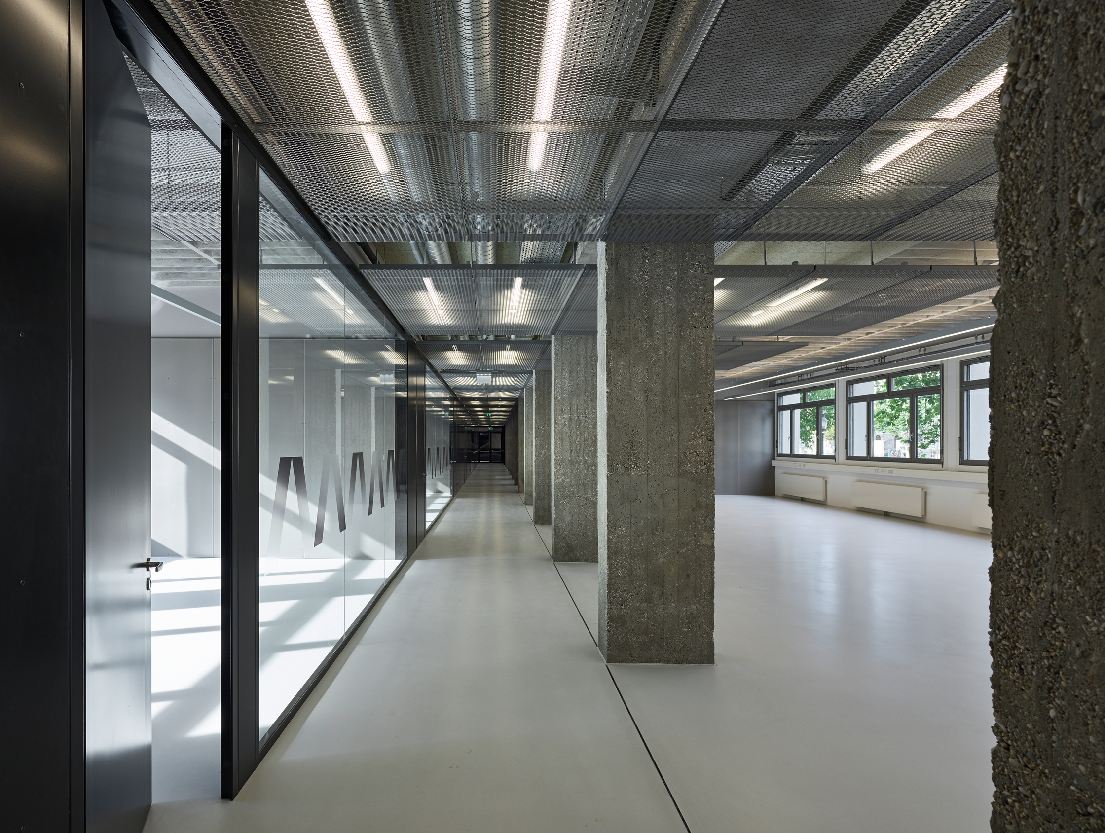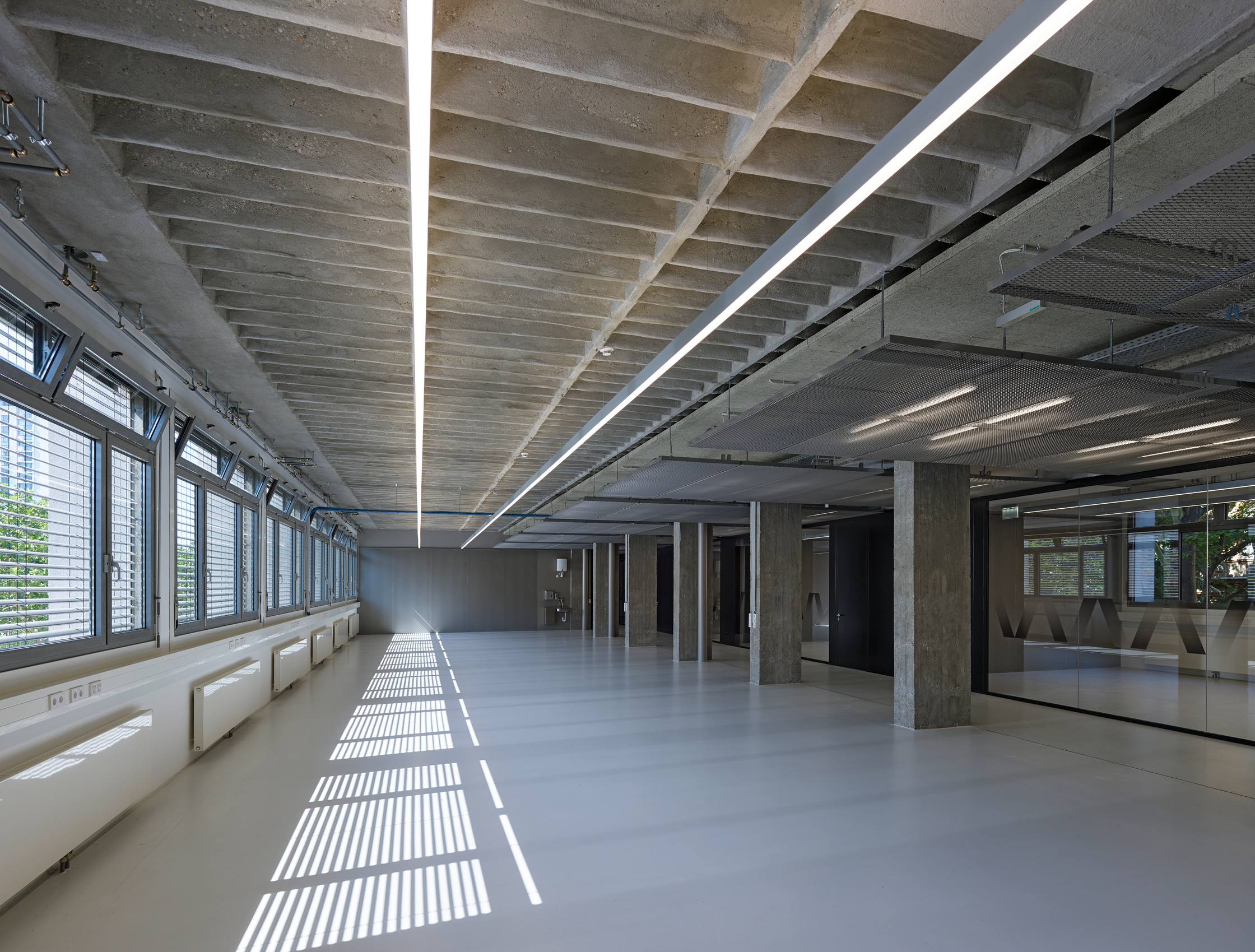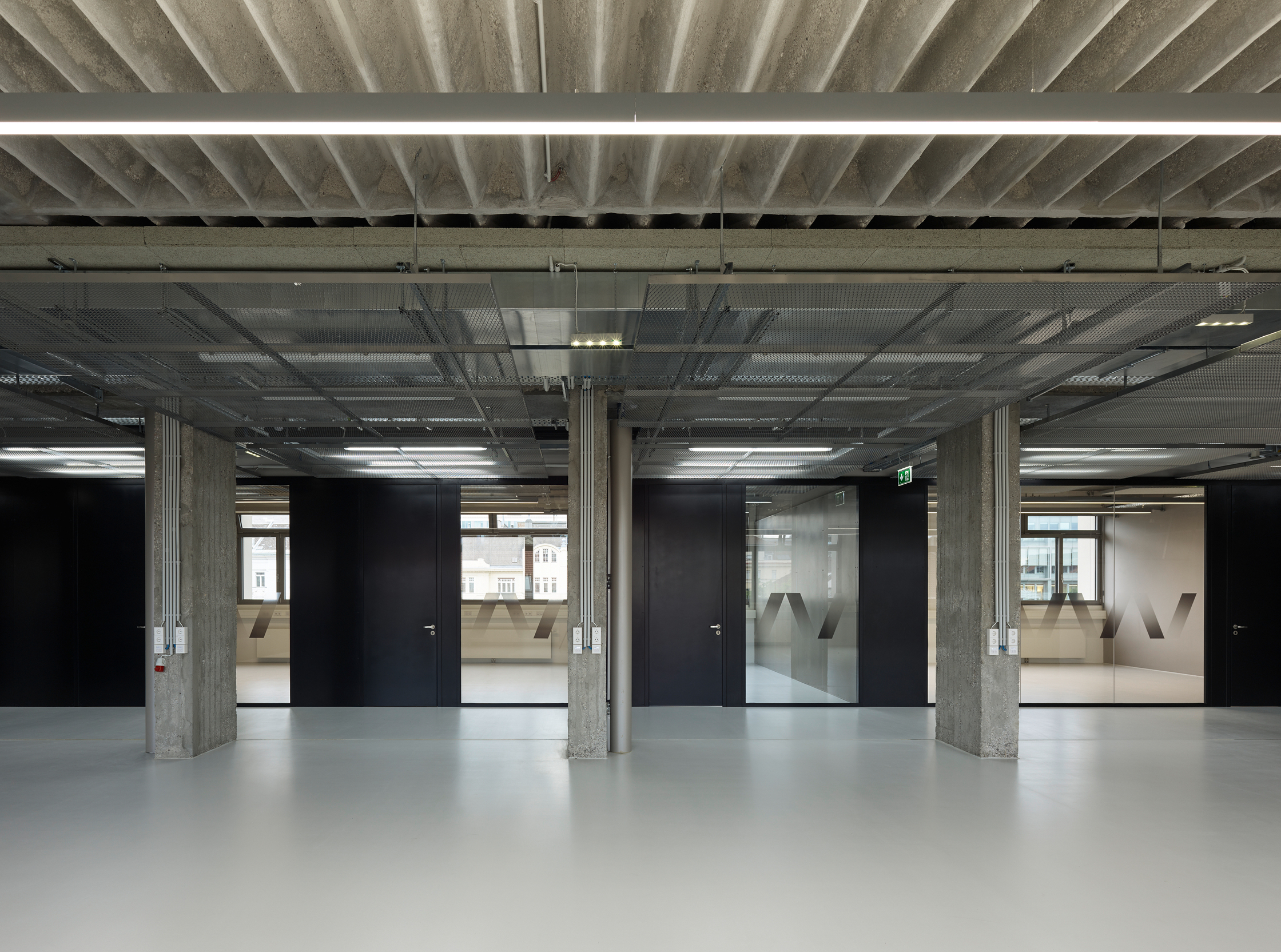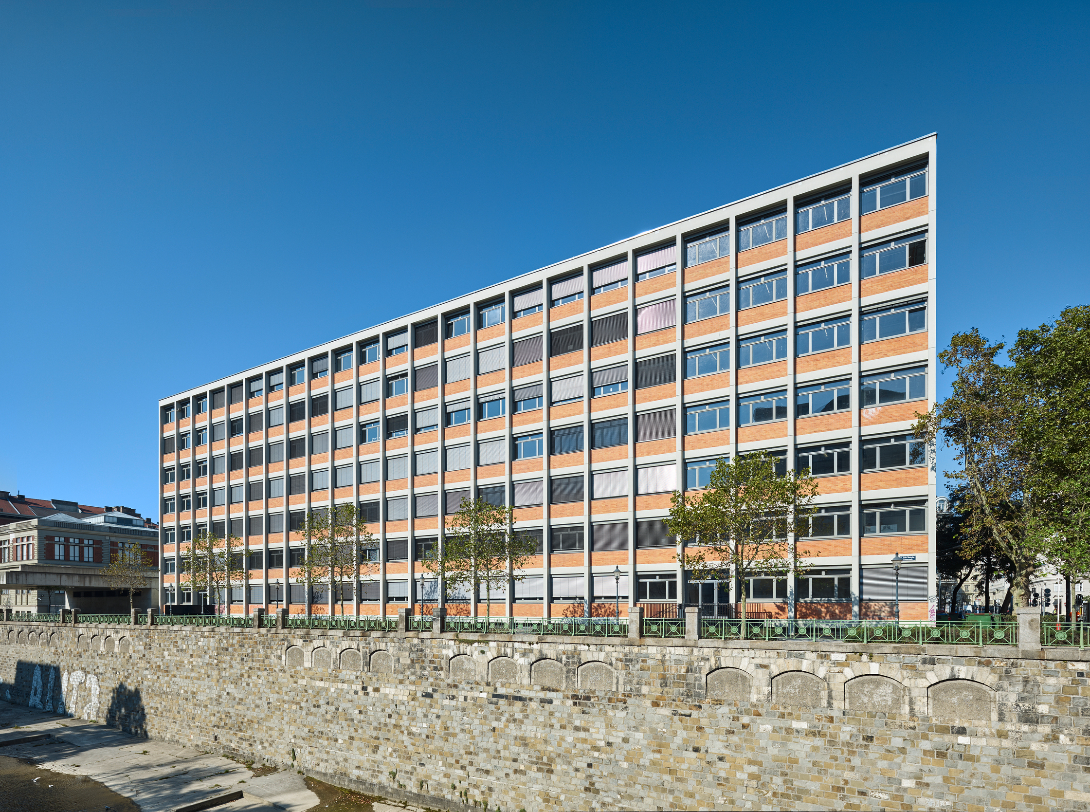 Riepl Kaufmann Bammer Architektur hat, als Sieger eines geladenen Verfahrens mit der Generalsanierung des Schwanzer-Traktes beauftragt, alles konstruktiv Unnötige daraus entfernt und seine klare, an einen Industriebau gemahnende Tragstruktur freigelegt. Der Schwanzer-Trakt erstreckt sich parallel zum Wienfluss. Seine sieben oberirdischen Geschoße sind zwischen zwei stirnseitig gelegenen Stiegenhäusern aufgespannt. Die filigranen, hinter abgehängten Verkleidungen zum Vorschein gekommenen kassettierten Stahlbetondecken werden von jeweils drei Betonstützenreihen getragen. Die lang gezogenen rechteckigen Hallen zwischen den Stiegenhäusern lassen eine Vielzahl unterschiedlicher Raumfigurationen zu. Um diese funktionelle Großzügigkeit auch im Raumeindruck zu erhalten, hat Riepl Kaufmann Bammer Architektur einen Bausatz entwickelt, der die notwendige Variabilität der Grundrisse in einem System verankert: In der Mittelzone ordnet eine abgehängte Decke aus Streckmetall den Verlauf der darüber vage sichtbaren haustechnischen Leitungen.