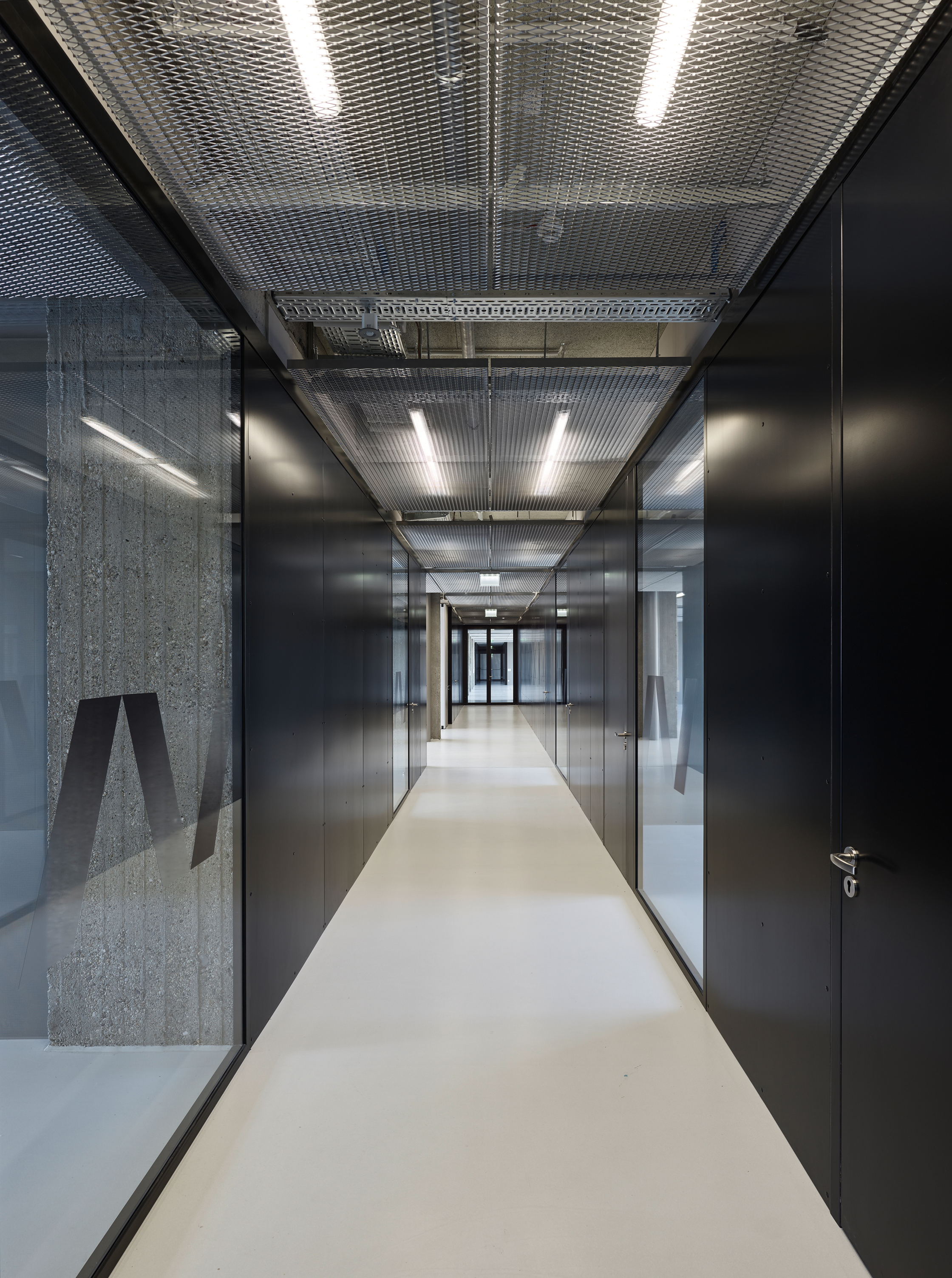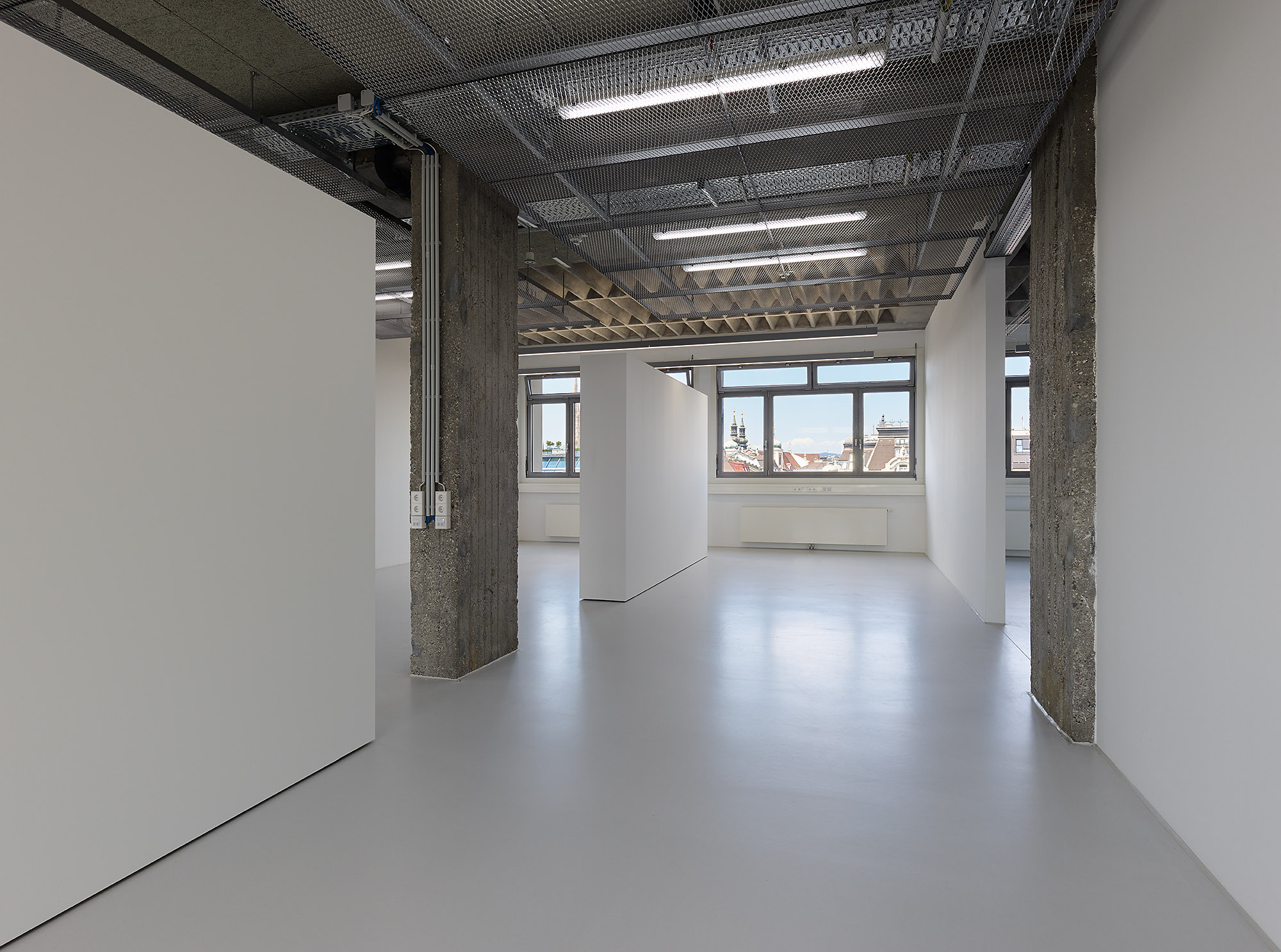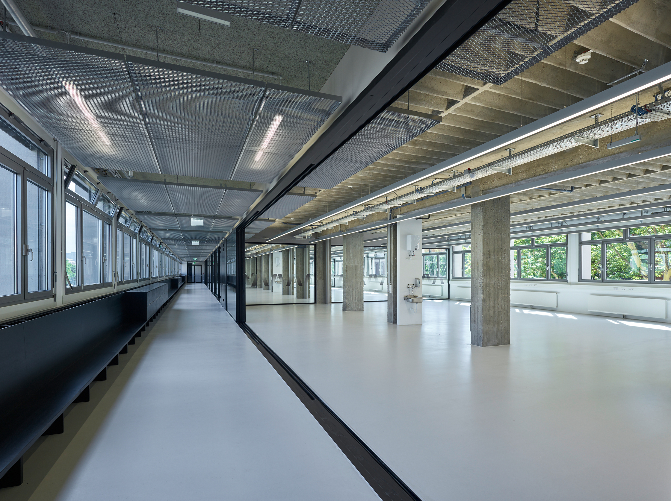 Riepl Kaufmann Bammer Architektur hat, als Sieger eines geladenen Verfahrens mit der Generalsanierung des Schwanzer-Traktes beauftragt, alles konstruktiv Unnötige daraus entfernt und seine klare, an einen Industriebau gemahnende Tragstruktur freigelegt. Der Schwanzer-Trakt erstreckt sich parallel zum Wienfluss. Seine sieben oberirdischen Geschoße sind zwischen zwei stirnseitig gelegenen Stiegenhäusern aufgespannt. Die filigranen, hinter abgehängten Verkleidungen zum Vorschein gekommenen kassettierten Stahlbetondecken werden von jeweils drei Betonstützenreihen getragen. Die lang gezogenen rechteckigen Hallen zwischen den Stiegenhäusern lassen eine Vielzahl unterschiedlicher Raumfigurationen zu. Um diese funktionelle Großzügigkeit auch im Raumeindruck zu erhalten, hat Riepl Kaufmann Bammer Architektur einen Bausatz entwickelt, der die notwendige Variabilität der Grundrisse in einem System verankert: In der Mittelzone ordnet eine abgehängte Decke aus Streckmetall den Verlauf der darüber vage sichtbaren haustechnischen Leitungen.