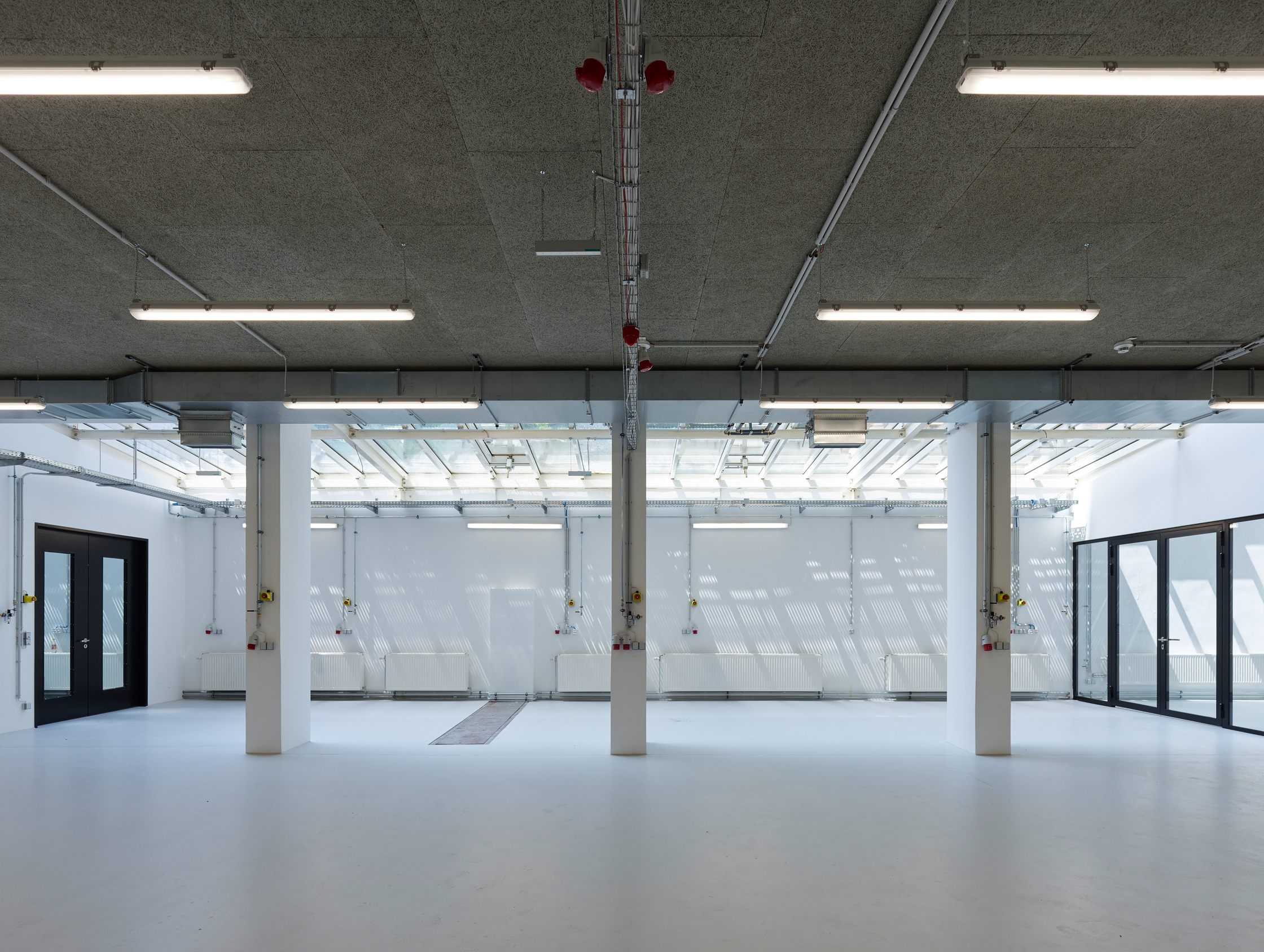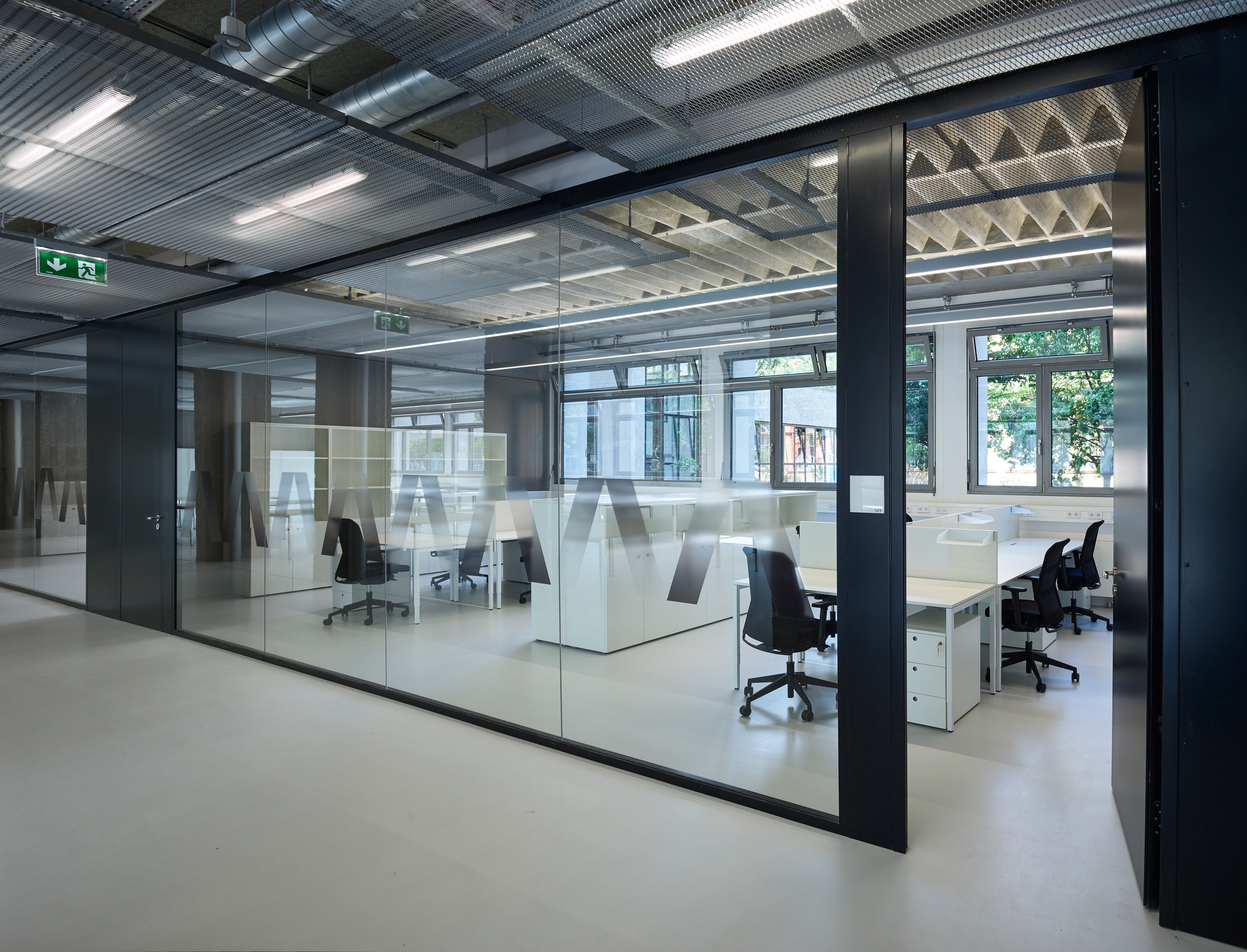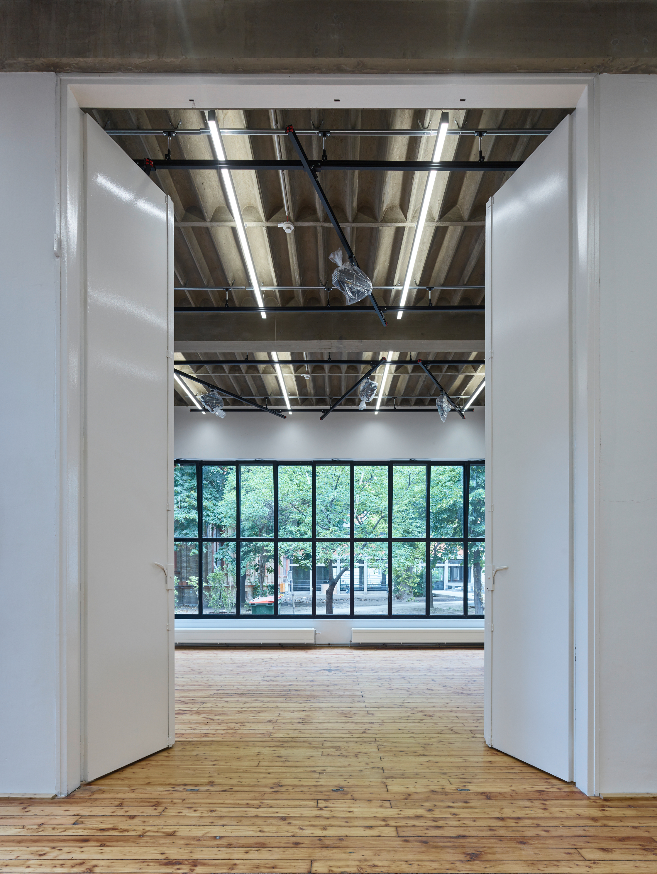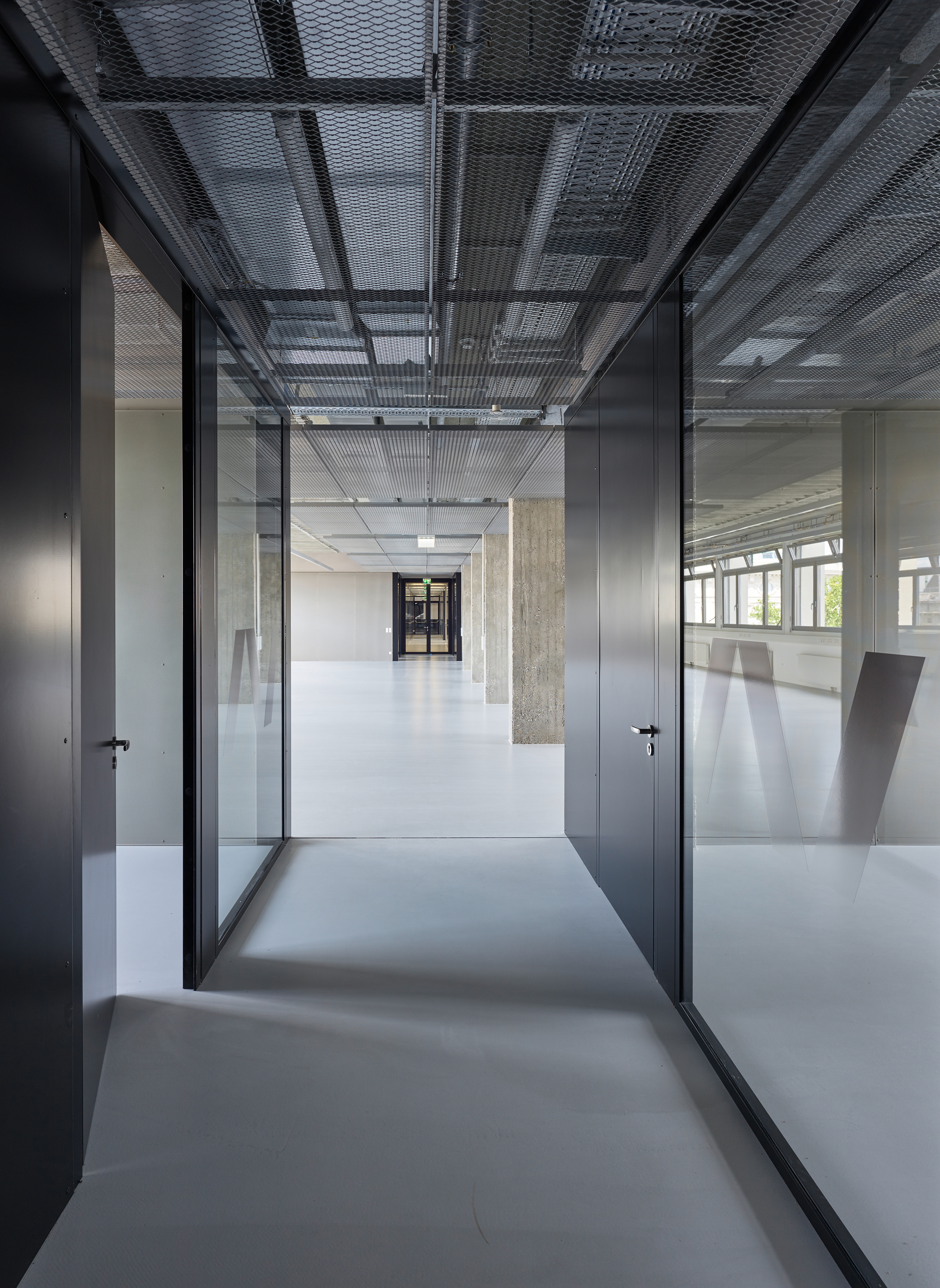 Riepl Kaufmann Bammer Architektur hat, als Sieger eines geladenen Verfahrens mit der Generalsanierung des Schwanzer-Traktes beauftragt, alles konstruktiv Unnötige daraus entfernt und seine klare, an einen Industriebau gemahnende Tragstruktur freigelegt. Der Schwanzer-Trakt erstreckt sich parallel zum Wienfluss. Seine sieben oberirdischen Geschoße sind zwischen zwei stirnseitig gelegenen Stiegenhäusern aufgespannt. Die filigranen, hinter abgehängten Verkleidungen zum Vorschein gekommenen kassettierten Stahlbetondecken werden von jeweils drei Betonstützenreihen getragen. Die lang gezogenen rechteckigen Hallen zwischen den Stiegenhäusern lassen eine Vielzahl unterschiedlicher Raumfigurationen zu. Um diese funktionelle Großzügigkeit auch im Raumeindruck zu erhalten, hat Riepl Kaufmann Bammer Architektur einen Bausatz entwickelt, der die notwendige Variabilität der Grundrisse in einem System verankert: In der Mittelzone ordnet eine abgehängte Decke aus Streckmetall den Verlauf der darüber vage sichtbaren haustechnischen Leitungen.