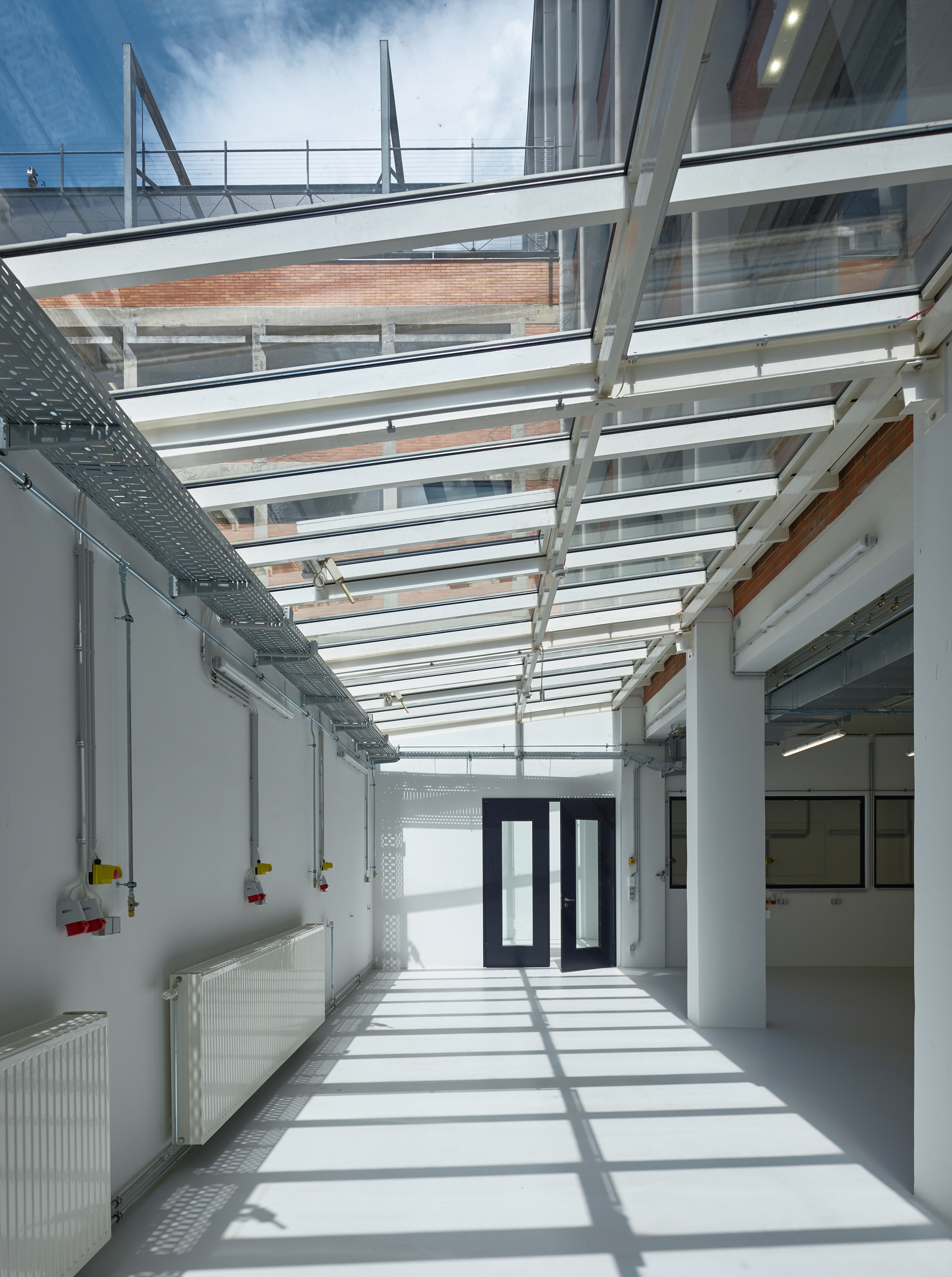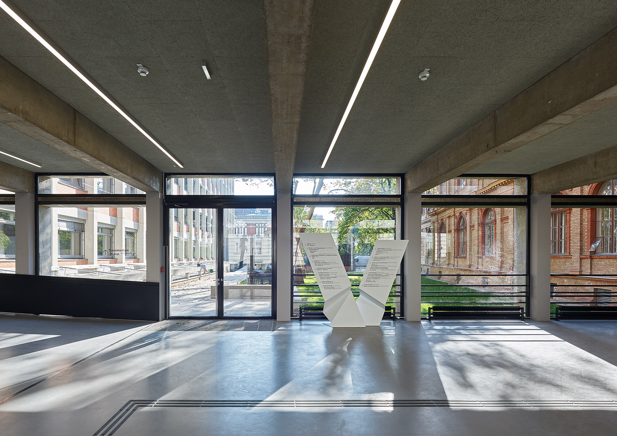 Quer zu den Längswänden gestellte Trennwände sind undurchsichtig ausgeführt, der Länge nach verlaufende Raumtrennungen transparent, Türblätter opak. Dieses Ordnungssystem setzt die unterschiedlichen Raumfigurationen der Universität um, ohne die Konstruktion erneut zu verschleiern oder Lichteinfall und Blick quer über die Tiefe des Traktes zu verstellen. Der Außenauftritt des Gebäudes ist nahezu unverändert. Lediglich eine im Garten angelegte Rampe verbindet nun ebenerdig die beiden Quertrakte der Anlage.