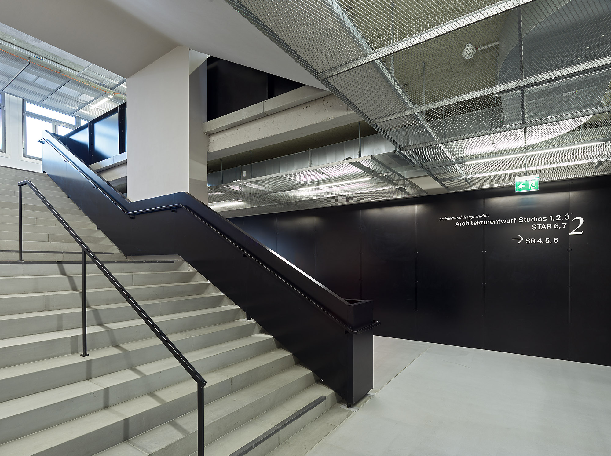 Während die historischen Räume von Riepl Kaufmann Bammer Architektur in fast spartanisch anmutender Zurückhaltung für die jeweilige Nutzung ertüchtigt wurden, liegt der gestalterische Schwerpunkt der Anlage deutlich auf ihrer neuen Mitte. Der den Gartenhof flankierenden Querspange sind verglaste Räume zugewiesen, die dazu beitragen, das Atrium zu einem lichten Ort spannender Blickbeziehungen zu machen. Eine Cafeteria im Erdgeschoß und der gläsern zum Atrium orientierte Empfangsbereich der Bibliothek unterstreichen den Stellenwert des kommunikativen Zentrums. Sogar die Lesekabinen hoch oben im weitgehend geschlossenen Betonkranz des Dachgeschoßes schauen aus schmalen, in den Fächer ihrer Wandscheiben geschobenen Fenstern hinunter in den Raum, sodass selbst in der Konzentration auf das eigene Anliegen das inspirierende Ganze gegenwärtig ist.