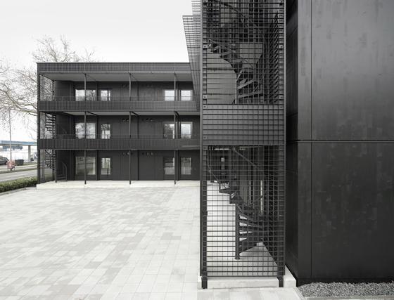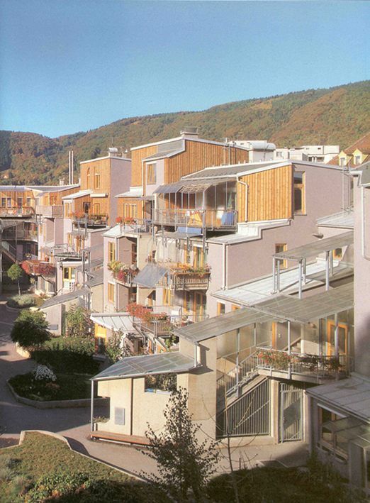 Zehn bis zu vier Geschoße hohe Baukörper sind deutlich in der Höhe abgestuft und sichtbar gegliedert zwecks Optimierung der Sonneneinstrahlung. Was damit auch angestrebt wurde und wie selbstverständlich gelang, ist ein maßvoller Übergang zur im Süden vorgelagerten, öffentlich nutzbaren Wiese, zur schönen Baumpflanzung am Ufer und zum Radweg entlang der Glan. Die Wohnungen im Erdgeschoß haben private Kleingärten. Jene am halb öffentlichen Grün und dem zentralen, teils befestigten Platz sind durch Hecken und halb hohe Lüftungsschächte der Tiefgarage getrennt, die Privatheit garantieren sollen. Der große Gemeinschaftsraum, auch zum Platz hin angelegt, eine gedeckte Spielfläche und die Wegeführung zur Erdgeschoß- und zur Laubengangerschließung signalisieren allerdings urbane Betriebsamkeit.