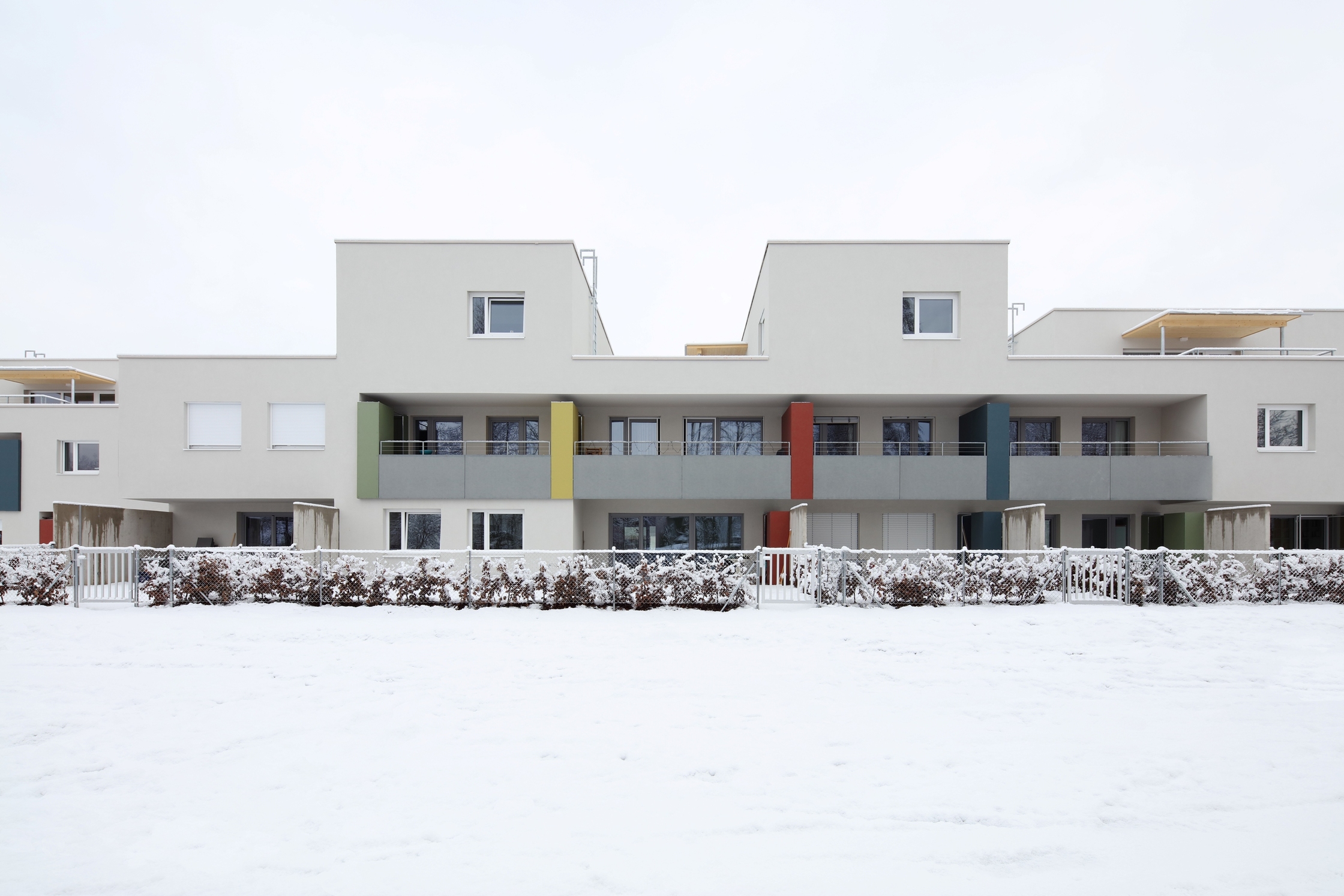 Eva Rubins grundlegende Faktoren für den Entwurf waren Maßstäblichkeit und eine lebendige Gliederung der Baumassen, um Erkennungswert und Identifikation mit dem Zuhause zu fördern. Zur möglichen Höhenentwicklung im Wohnungsbau vertritt die Tochter von Roland Rainer eine klare Haltung: Die maximale Höhe ist dort gegeben, wo die direkte kommunikative Verständigung zwischen der Wohnung und dem Freibereich vor dem Haus gerade noch möglich ist.