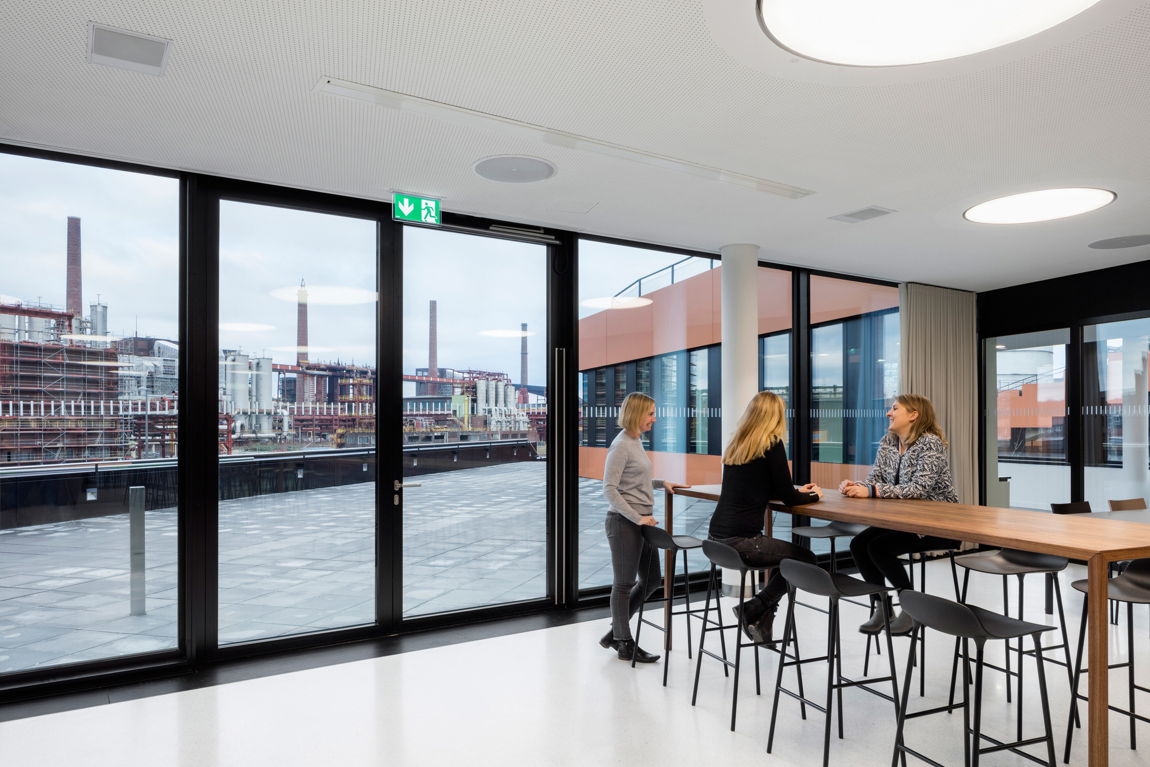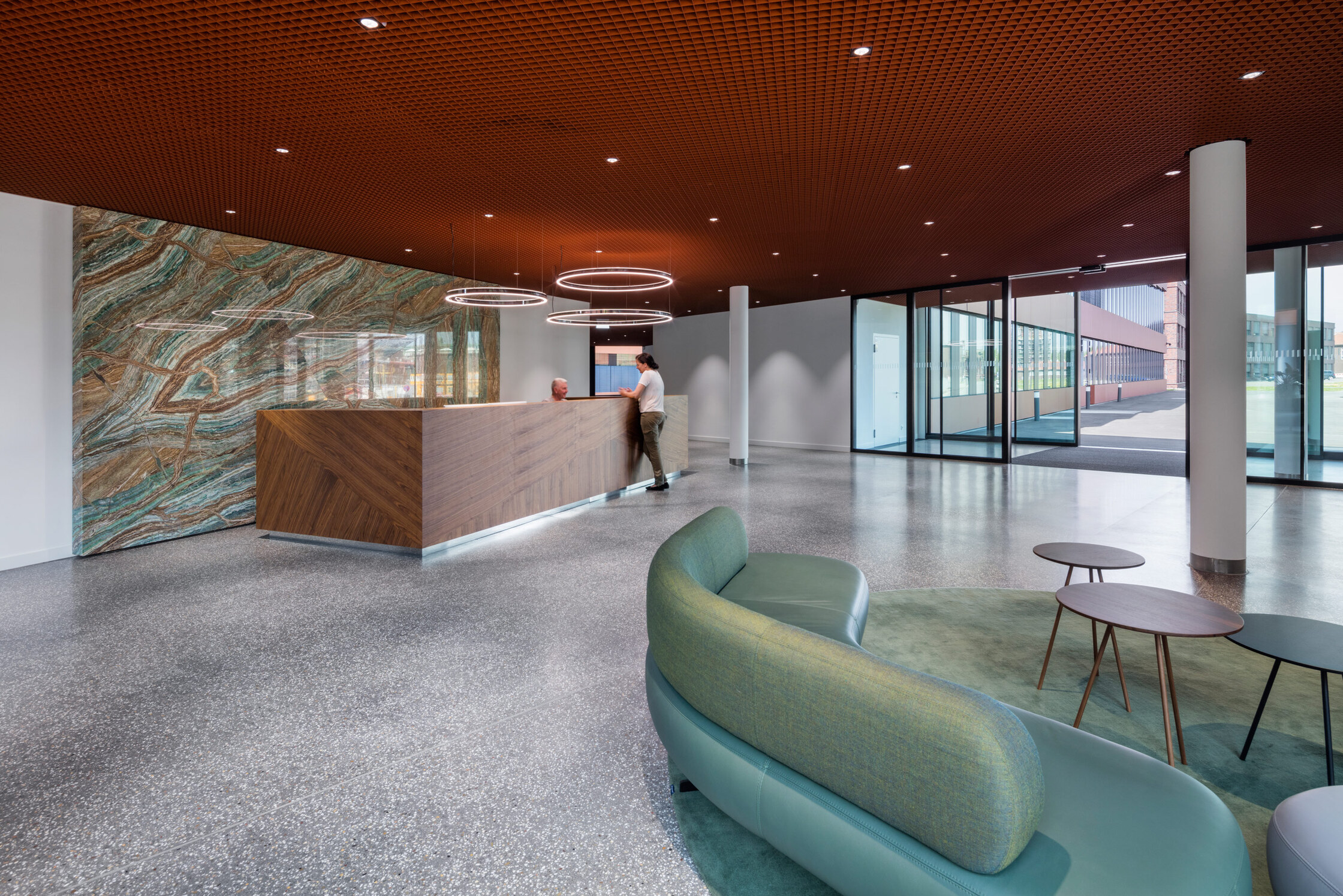 Gesunde Arbeitsumgebung: Bauökologische Materialprüfung (Nutzung von halogenfreier Verkabelung und Grundleitungen, Verwendung mineralischer Dämmmaterialien) / Höchster Standard für Innenraum-Luftqualität (C2C Bodenbeläge, Florawalls)