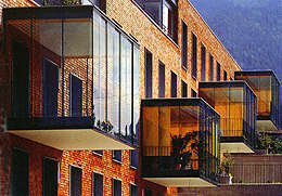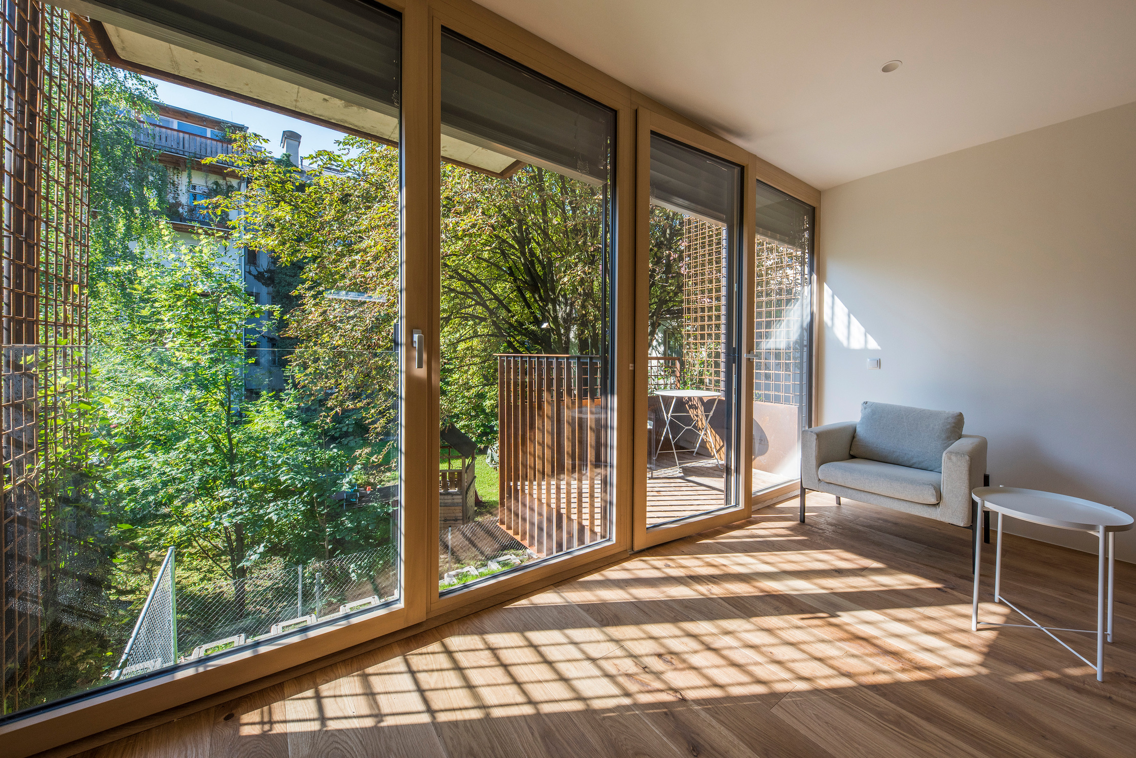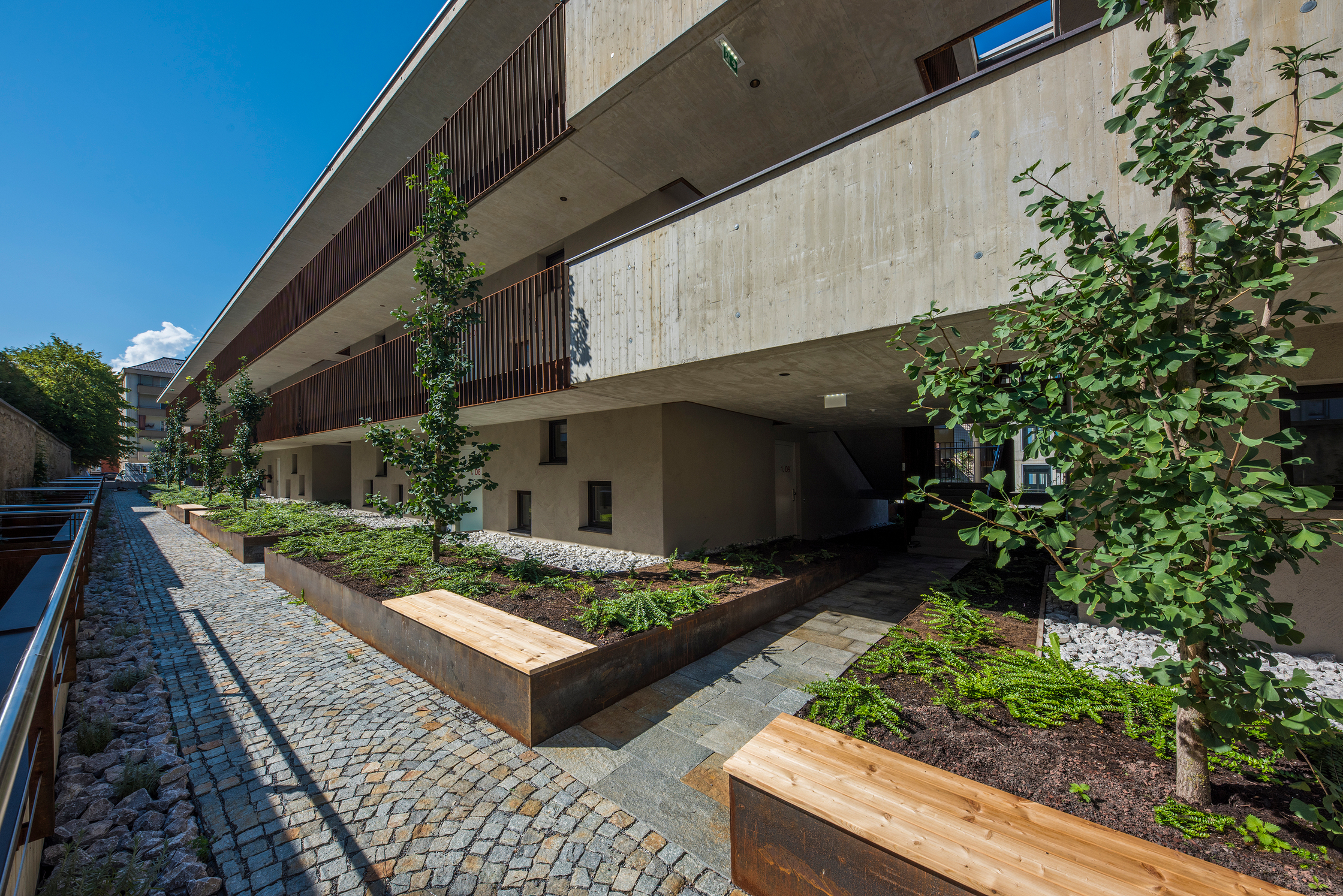 Ursprünglich befanden sich auf dem großen Innenhof zwischen Speckbacherstraße, Schöpfstraße, Andreas-Hofer-Straße und Franz-Fischer-Straße ein Parkplatz und ein Bürogebäude. Mit dem Ziel einer möglichst geringen Beeinträchtigung der Anrainer entstand der Neubau mit ca. 120 Wohnungen nach dem Konzept einer „sunken plaza“, d. h. als Verdichtung nach unten. Zwei unterirdische Wohngeschoße öffnen sich zu einem abgegrabenen Innhof, die drei Obergeschoße wurden auf mehrere einzelne Häuser mit begrünten Dächern und Fassaden verteilt. Die 1- bis 4-Zimmer-Wohnungen bieten mit gut durchdachten Grundrissen viel Platz auf wenig Raum. Jeder Einheit – von den atelierartigen Erdgeschoßwohnungen bis zu Dachgeschoßapartments mit dreiseitiger Belichtung – ist ein privater Freiraum in Form von Gartenflächen, Balkonen und Terrassen zugeordnet. (Text: Claudia Wedekind)