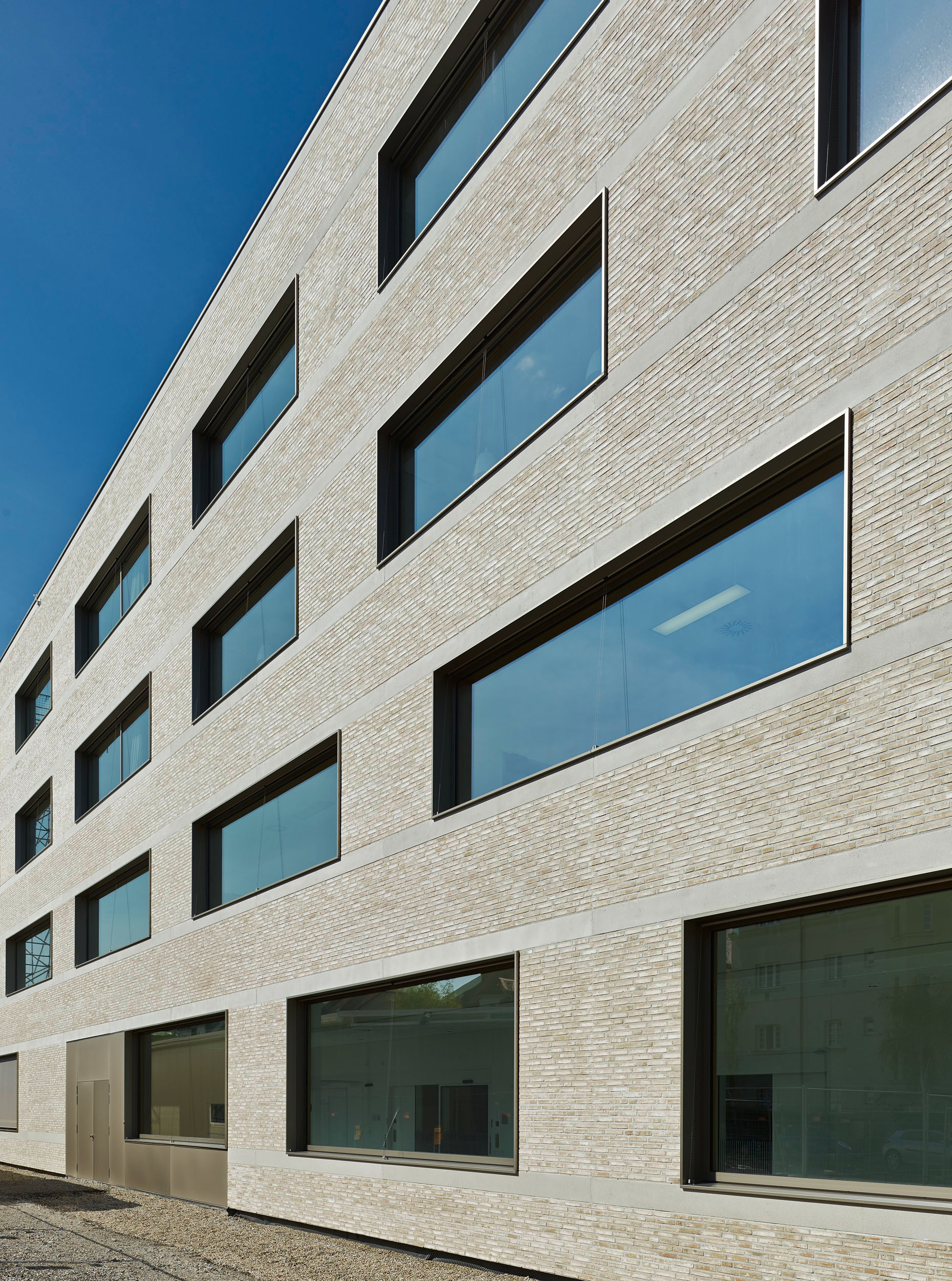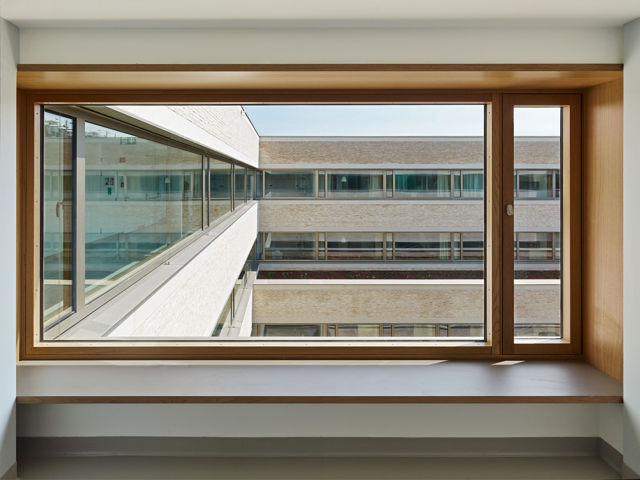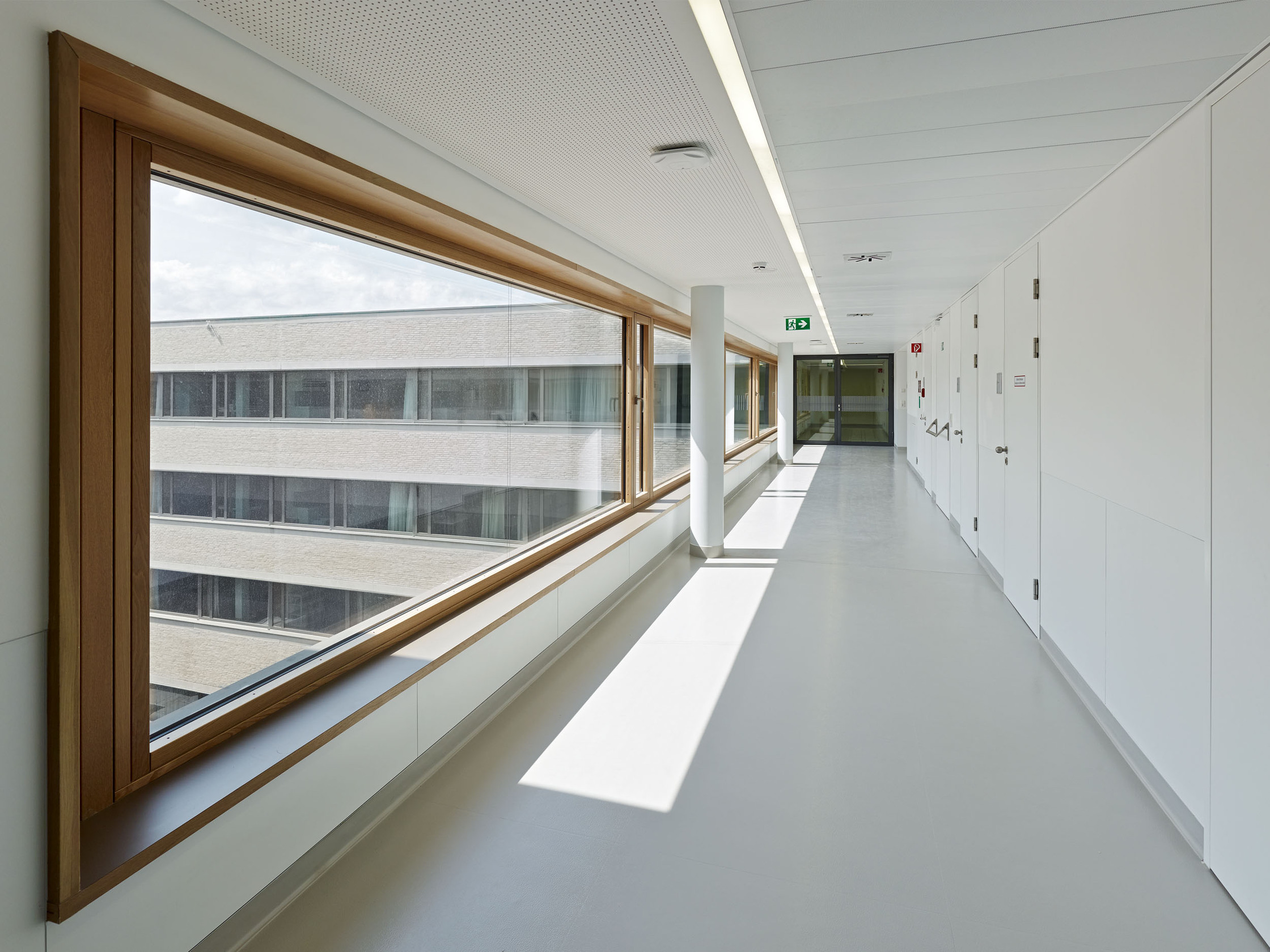 Diese Stationen sind konventionell angelegt. Auffällig sind etwas breitere Korridore als üblich und viel Holz an den Oberflächen. Die Stützpunkte der Stationen sind als frei stehende Pulte ausgeführt. Im größten der drei Blocks, bei dem diese Stützpunkte in einer Dunkelzone liegen würden, sichern zwei kleine begrünte Lichthöfe den Kontakt zur Außenwelt. Alle Patientenzimmer haben Blick in die Umgebung. Zum Hof hin liegen Nebenräume und Aufenthaltsräume für Personal und gehfähige Patienten. Der Blick in den Hof ist aber alles andere als langweilig, wenn man etwas genauer hinsieht. Die Architektur von Paul Katzberger und Mike Loudon ist eine Architektur der leisen Töne, eine „fade“ Architektur, wobei „fade“ in dem Sinn zu verstehen ist, wie es François Jullien in seinem Buch „Über das Fade – eine Eloge“ in Bezug auf Denken und Ästhetik in China beschrieben hat: das „Fade“ als der Moment, in dem noch fast alles möglich ist, einen letzten, minimalen Schritt entfernt vom intensiven Ausdruck, der in diesen Moment des „Faden“ zurückleuchtet. Dieser Haltung verdankt sich unter anderem die Materialwahl der Außenfassade, eine Kombination aus Klinkerziegeln und Kunststeinelementen. Letztere sind wie Notenlinien über die Fassade gezogen, über denen die minimal unterschiedlich gebrannten Ziegel ihre Melodie spielen. Diese ruhige, aber alles andere als eintönige Ziegeloberfläche findet sich auch an wichtigen Punkten im Innenraum, zum Beispiel als Ummauerung der Lifte. Für den Einsatz eines derart porösen und daher haptisch ansprechenden Materials im Krankenhaus war ein zeitgemäßes Hygienekonzept Voraussetzung.