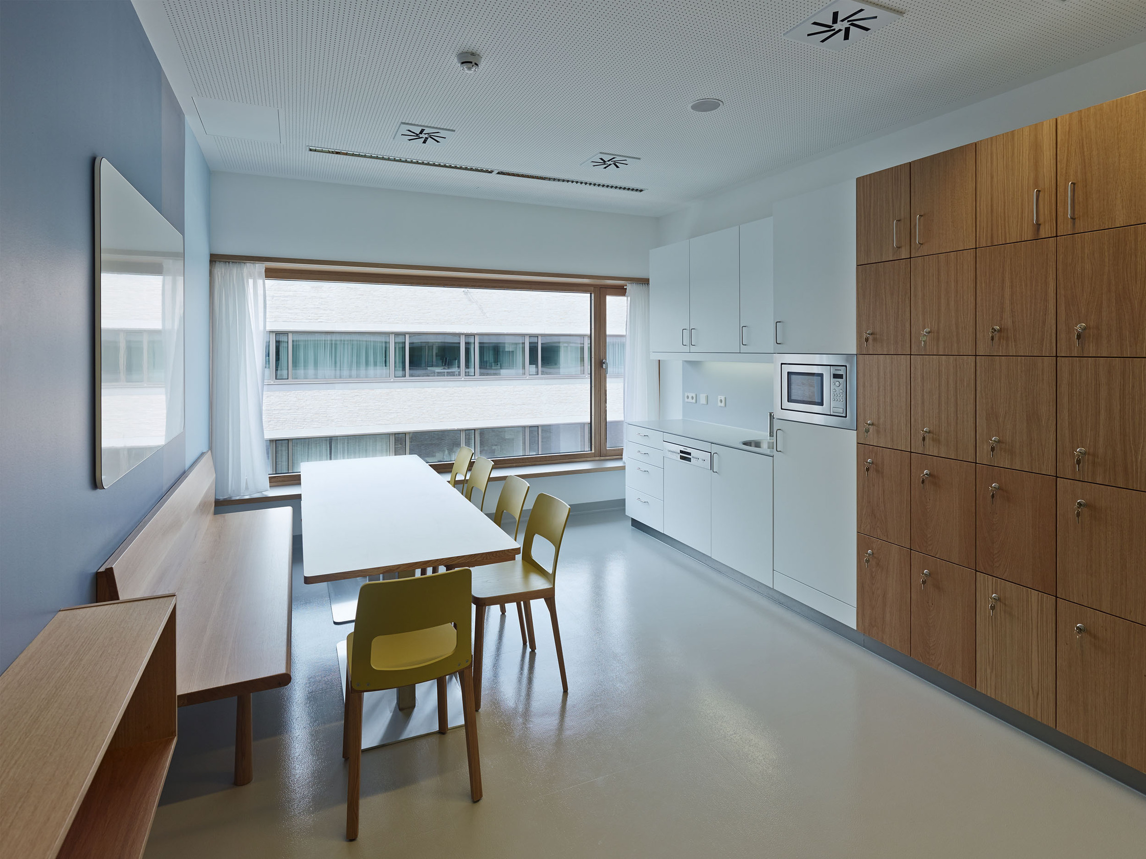 In jedem der drei Hofhäuser ist ein Raum pro Geschoß für die Haustechnik bestimmt, die einen Schacht im Ausmaß eines Doppelzimmers in Beschlag nimmt. Dieses Krankenhaus ist auch eine gigantische Maschine, für deren Wartung fünf Haustechniker nötig sind. Sie füllt die Kellergeschoße aus, von wo sich Kilometer an Leitungen mit zigtausenden Ventilen nach oben verzweigen – technische Blutgefäße und Luftröhren in wunderbar klaren, gut proportionierten Baukörpern.