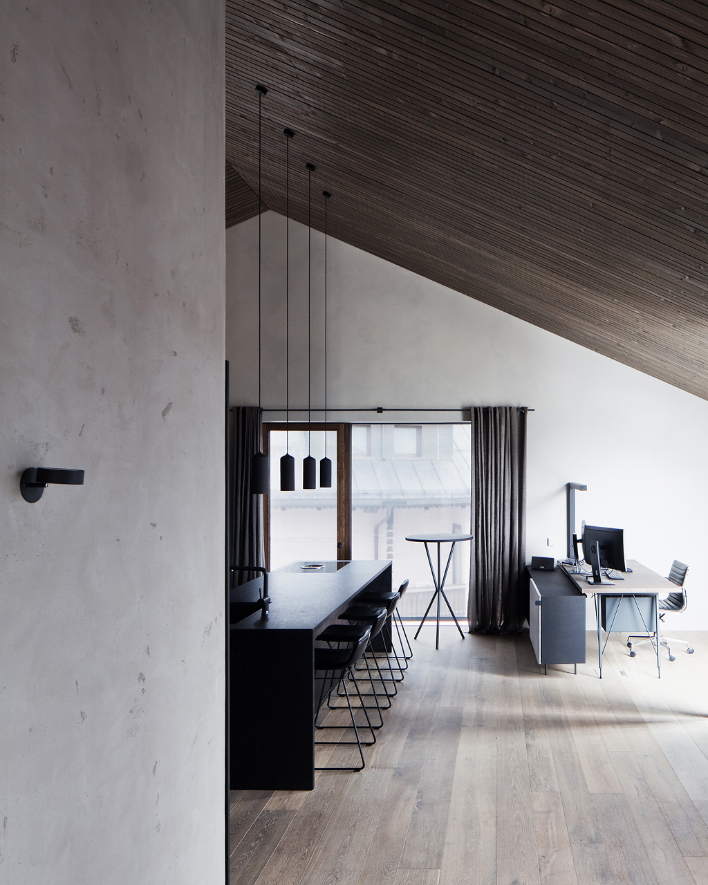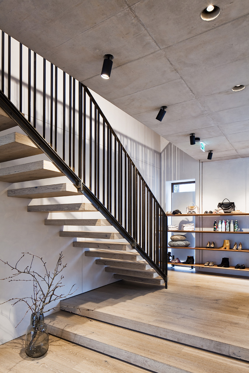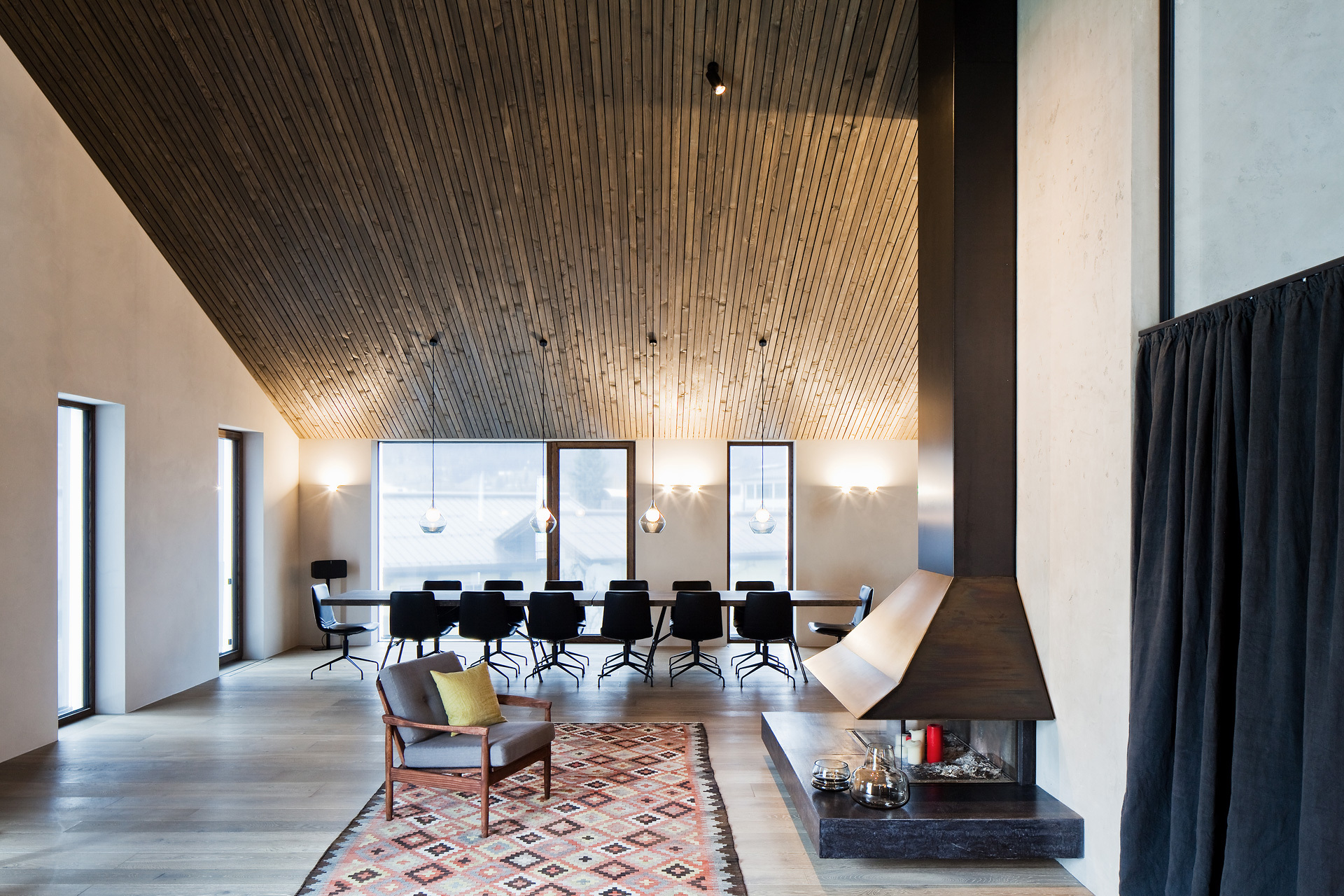 Um den Luftaustausch der Büroeinheiten zu gewährleisten, verfügt das oberste Geschoss über eine Wohnraumlüftung. Das Dachgeschoß ist als Holz-Riegel-Bau ausgebildet, während das Dach aus einer Massivholzkonstruktion besteht, um nachhaltig sowohl in der Bauführung als auch in der Materialität zu sein. An der Fassade wie auch im Innenbereich kamen Naturmaterialien zum Einsatz: HOLZ/ STEIN / STAHL / BETON / TEXTILIEN.