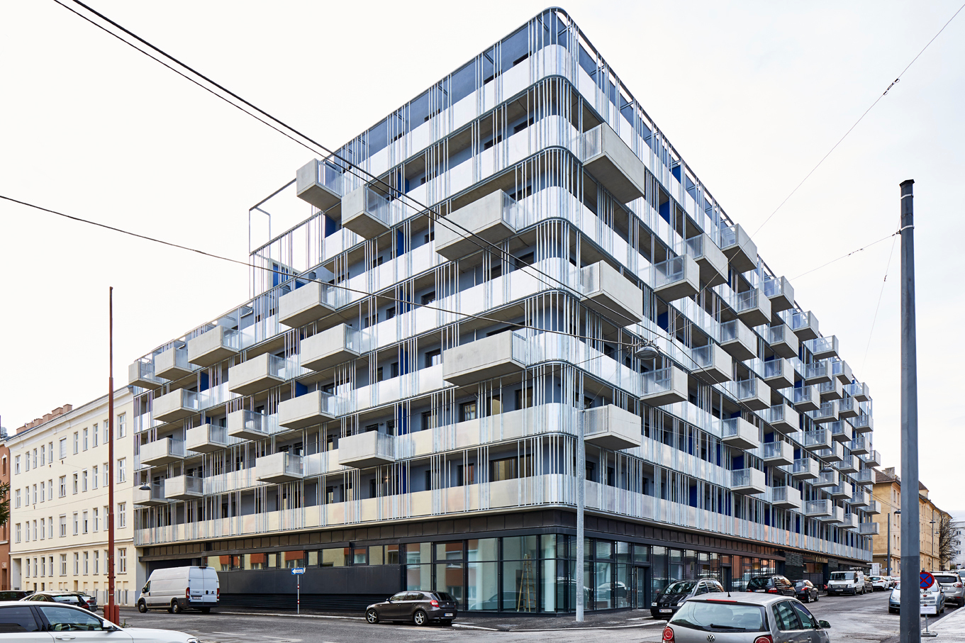 Was eine gute Fassade alles kann: Sie dient dem Ausblick und der Belichtung, sie bereichert den Straßenraum und generiert gut nutzbare Freiräume für die Wohnungen – exemplarisch umgesetzt in einem Wohnbau in Wien Simmering.