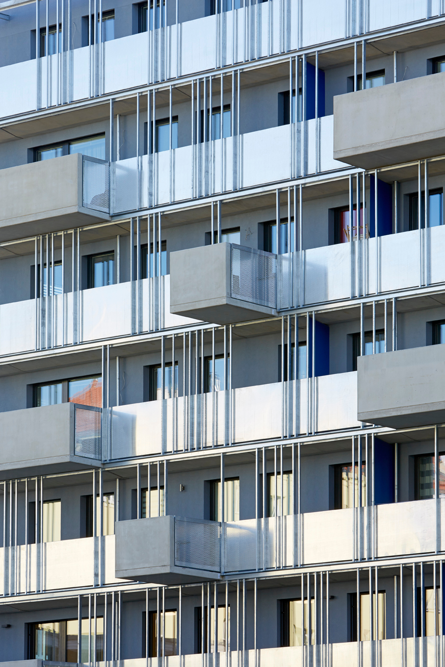Ab dem zweiten Obergeschoß verfügt jede Wohnung über einen Balkon und jede Maisonette über eine Loggia oder einen Garten. Der Freiraum zur Straße hin besteht aus zwei Schichten: einer Art umlaufender Laube, aus der als zweite Schicht Balkone hervorragen, die es in mehreren Tiefen und Breiten gibt. Um aus diesen Elementen ein ästhetisch befriedigendes Spiel zu machen, braucht es ein Regelwerk für die Abstimmung zwischen Grundriss und Fassade. Das Thema setzt sich bis ins Detail fort, etwa zum Gerüst aus verzinkten Stahlprofilen, das der Fassade einen Rhythmus gibt, aber auch als Unterkonstruktion für die Geländer und teilweise als Rankgerüst dienen. An manchen Punkten hat es auch gar keinen Zweck, etwa an der Attika, wo es den Übergang von der niedrigeren Bebauung zur höheren spielerisch begleitet.