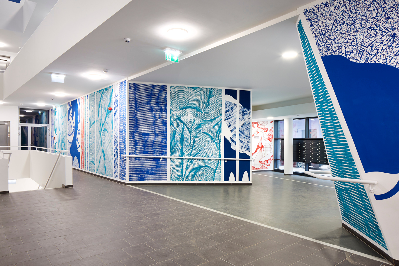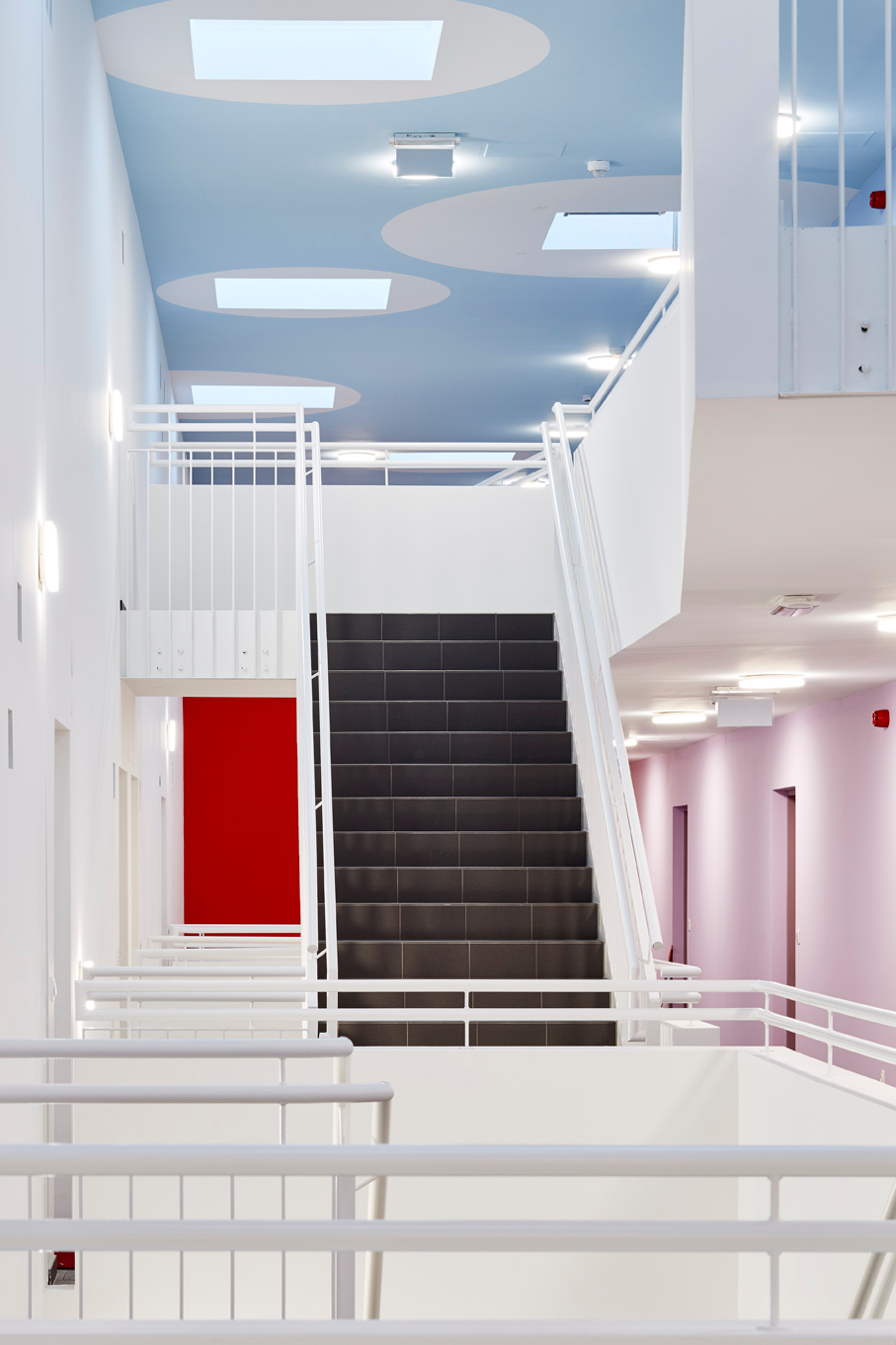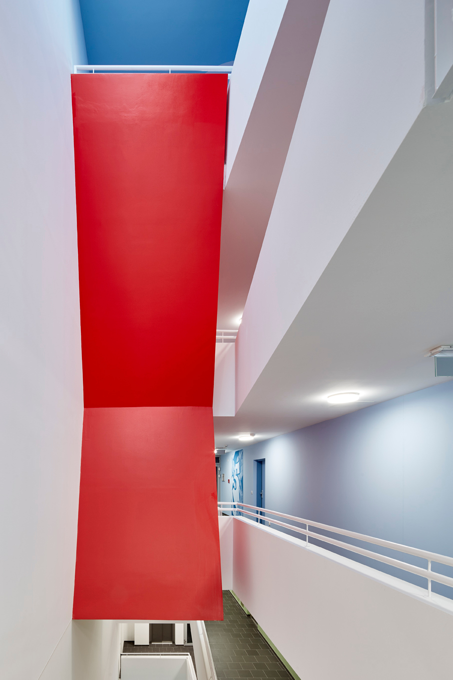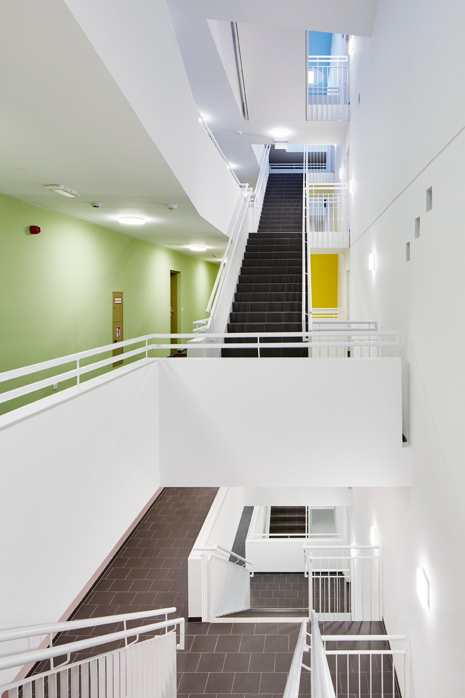 Dieses Projekt beweist, dass eine gute Fassade im Grundriss beginnt: Die Aufgabe, einen gründerzeitlichen Block mit einem Wohnbau abzuschließen, beantworten die Architekten mit einer U-förmigen Verbauung des Blockrands mit kleineren Wohnungen, die über Laubengänge erschlossen werden. Ein Großteil dieser Gänge liegt nicht im Freien, sondern in einer großzügigen Halle mit einer Kaskadentreppe, die alle Geschoße verbindet. Eine Druckbelüftung, die sich im Brandfall einschaltet und verhindert, dass Rauch aus einer Wohnung in die Halle dringt, macht es möglich, mit dieser einzigen Erschließung für das Haus auszukommen.
