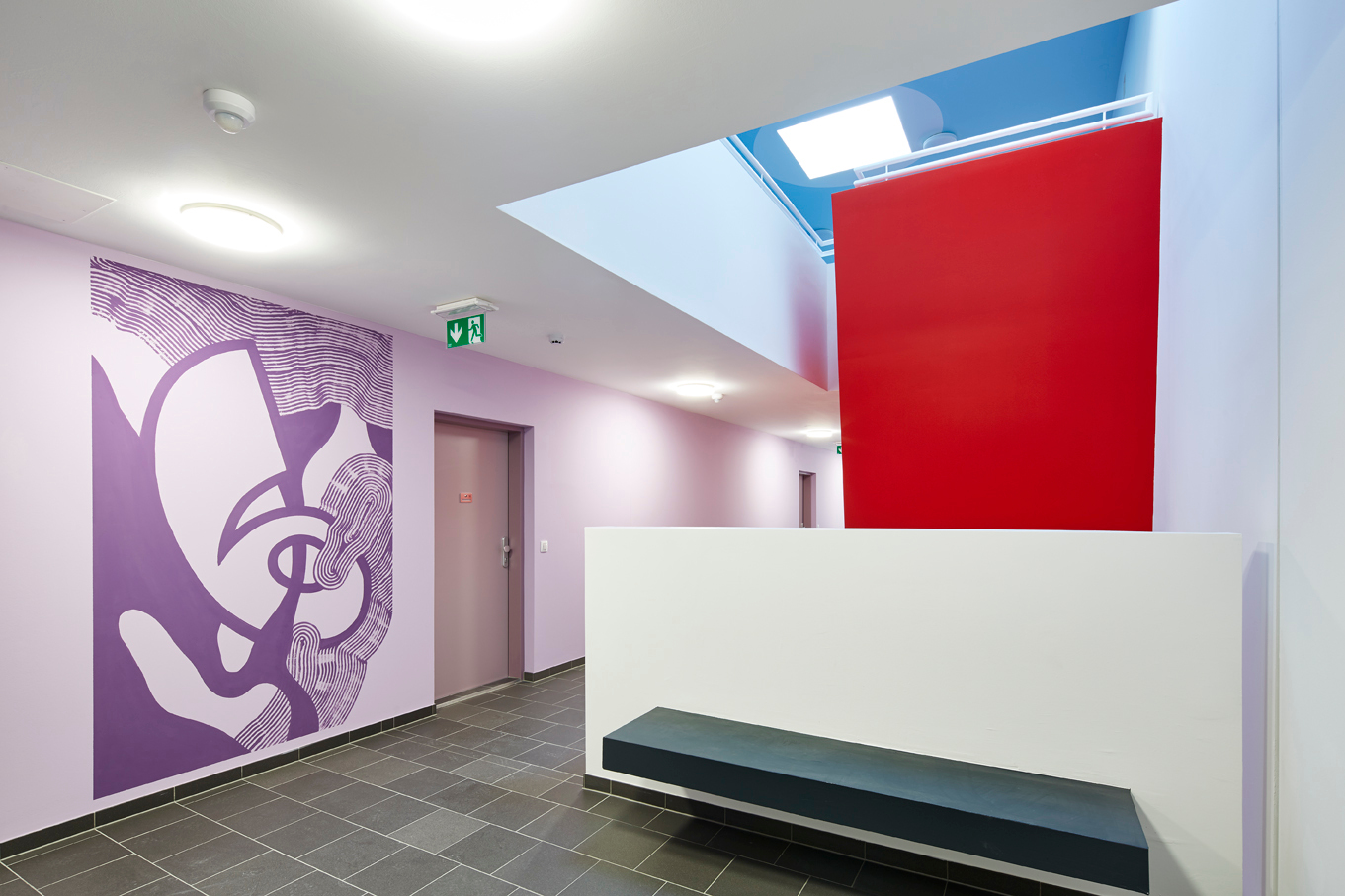 In der Halle führen Brücken zu hofseitig liegenden Maisonetten, die wie eine Spange in das große U der Kleinwohnungen eingepasst sind. Für diese zweigeschoßigen Sondertypen gibt es durchaus Nachfrage, sie werden aber immer seltener realisiert. Das Gros der Wohnungen folgt auch in diesem Projekt dem Smart-Wohnen-Prinzip, also knapp bemessenem, aber damit günstigerem Wohnraum. Ein zusätzlicher Faktor für die zunehmende Standardisierung ist der Wunsch nach Barrierefreiheit, nicht zuletzt, um das Wohnen in der eigenen Wohnung bis ins hohe Alter zu erlauben. Ob die generelle Ausrichtung des Wohnungsangebots auf die Bedürfnisse alter Menschen oder von Menschen mit Behinderungen klug ist, sei dahingestellt. Im Wohnbau in der Braunhubergasse findet sich die Alternative dazu, nämlich ein integriertes Heim mit betreutem Wohnen, das neben einer Wohngemeinschaft auch einige kleine, im Haus verteilte Wohneinheiten versorgt.