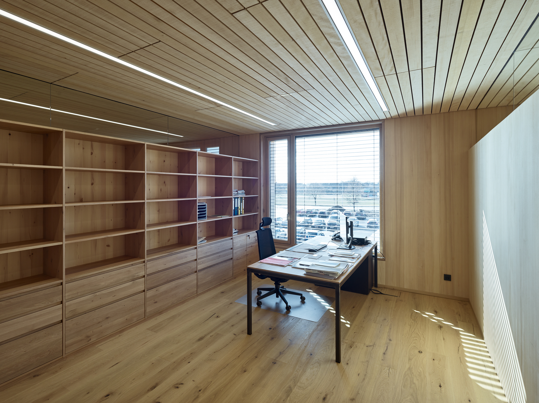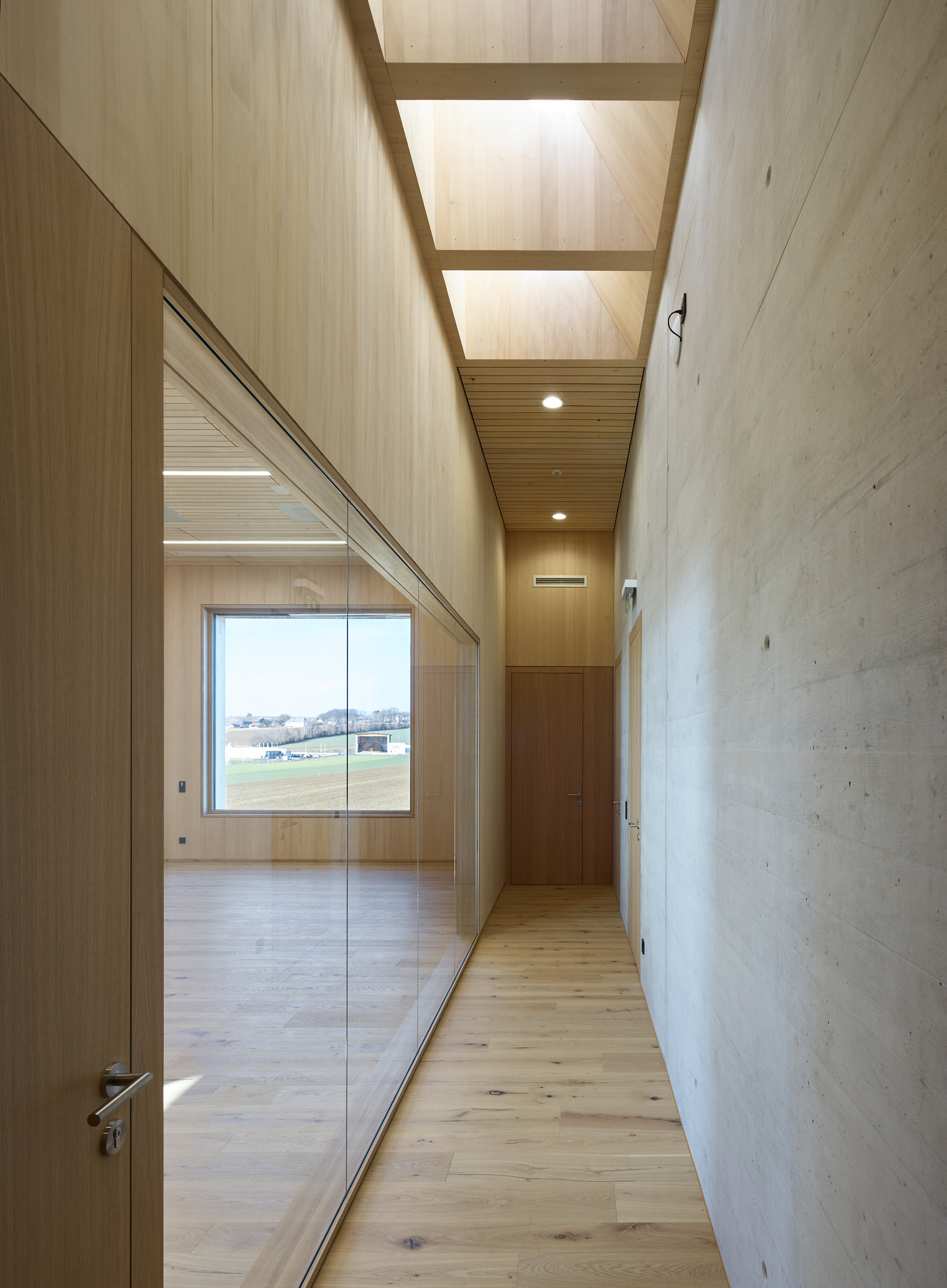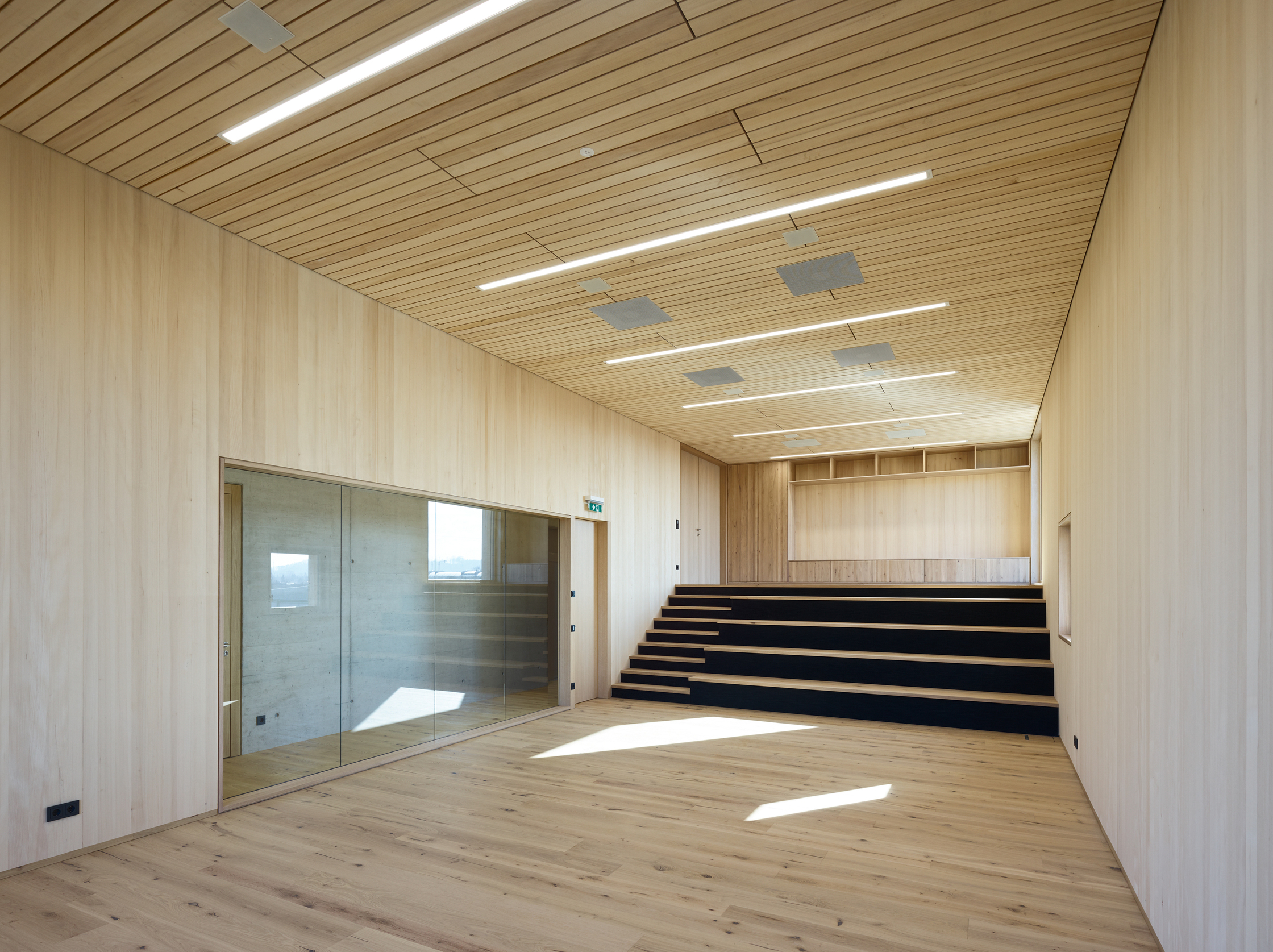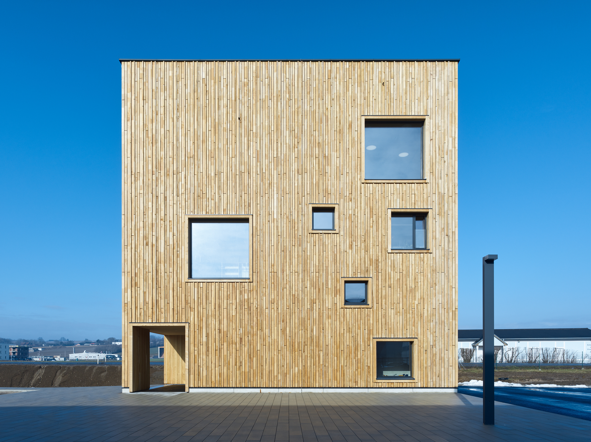 Die Außenwände sind in Holzelementbauweise gefertigt und mit einer hinterlüfteten, vertikalen Eichenschalung (offene Fugen) versehen. Zum Schutz vor Kondensat ist auf der Innenseite eine mit Weißtannentäfer verkleidete Installationsschicht vorgelagert.
