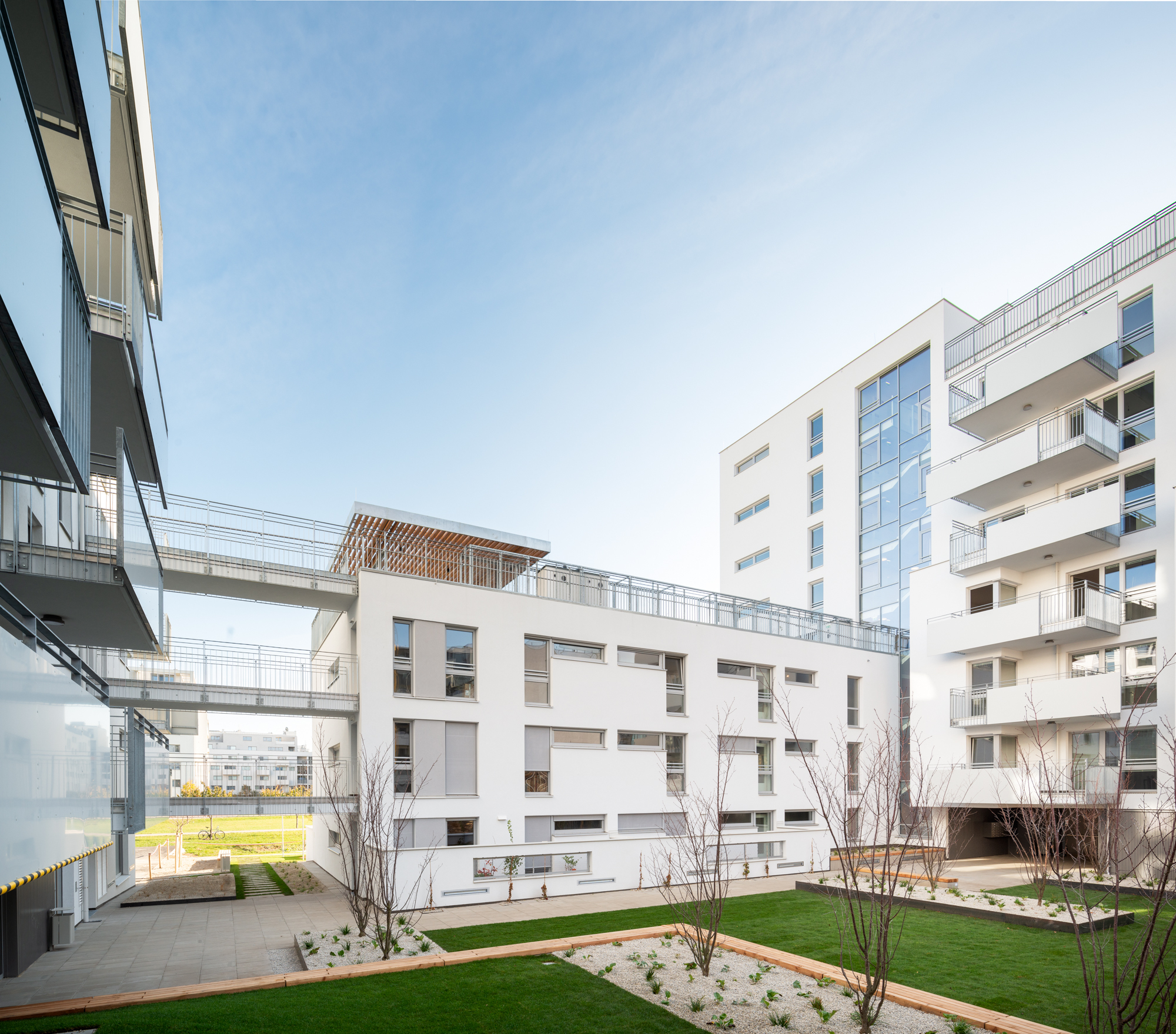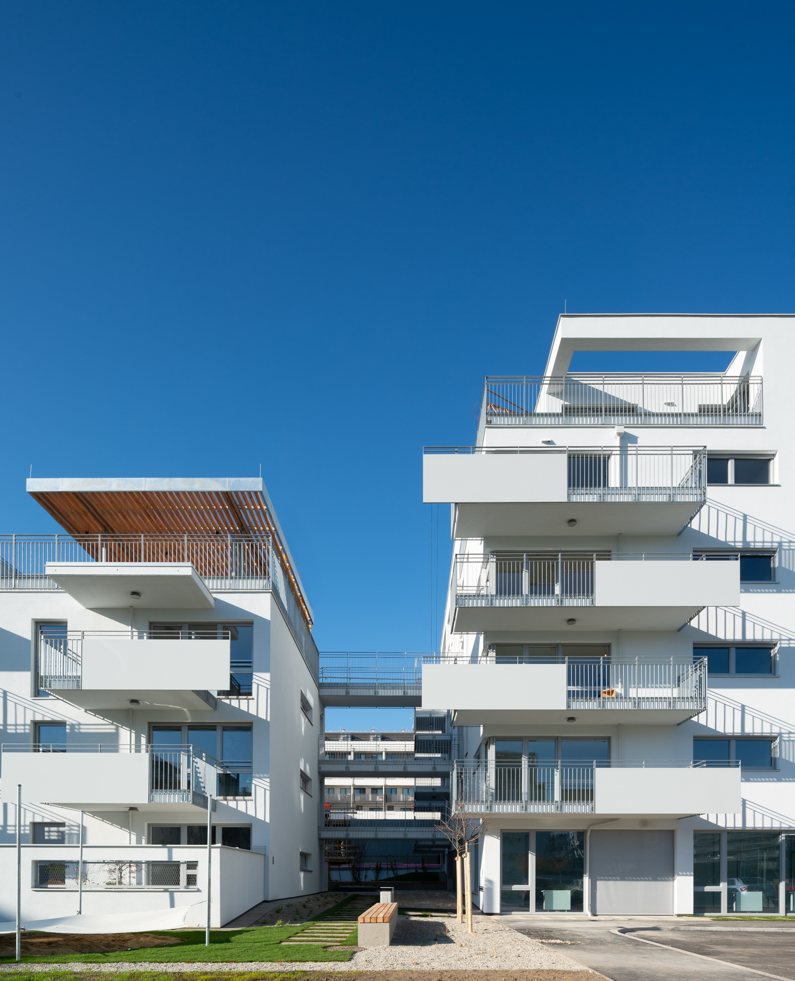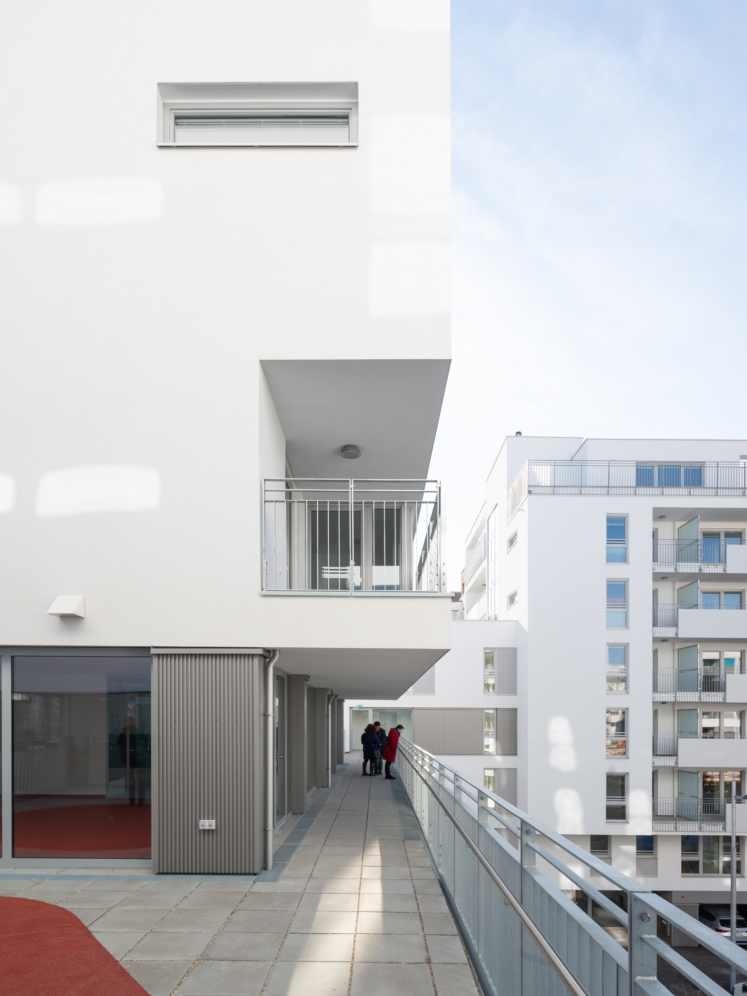 Das Generationenband verbindet diese Häuser miteinander; an diesem Weg, der sich in der Höhe durch die Anlage schlängelt, sind auch alle Gemeinschaftsräume, Kinderspielräume, Jugendraum, Gemeinschaftsterrassen angeordnet. „Räume also, die für gewöhnlich eher im Erdgeschoss untergebracht werden, doch hier sind sie auch deshalb in die Höhe gewandert, weil sich das Erdgeschoss mit seiner Lage am Park gut fürs Wohnen eignet“, erklärt Architekt Dieter Blaich. Als klare Grenze zwischen privater Terrasse und öffentlicher Kirschblüte dienen weiße, halbhohe Mauern mit schmalen Öffnungen. Eine willkommene Abwechslung zu den sonst in Wien üblichen Maschendrahtzäunen, die sofort nach Einzug mit Eigenbausichtschutz aus Thujen oder Baumarktbastmatten verunstaltet werden.