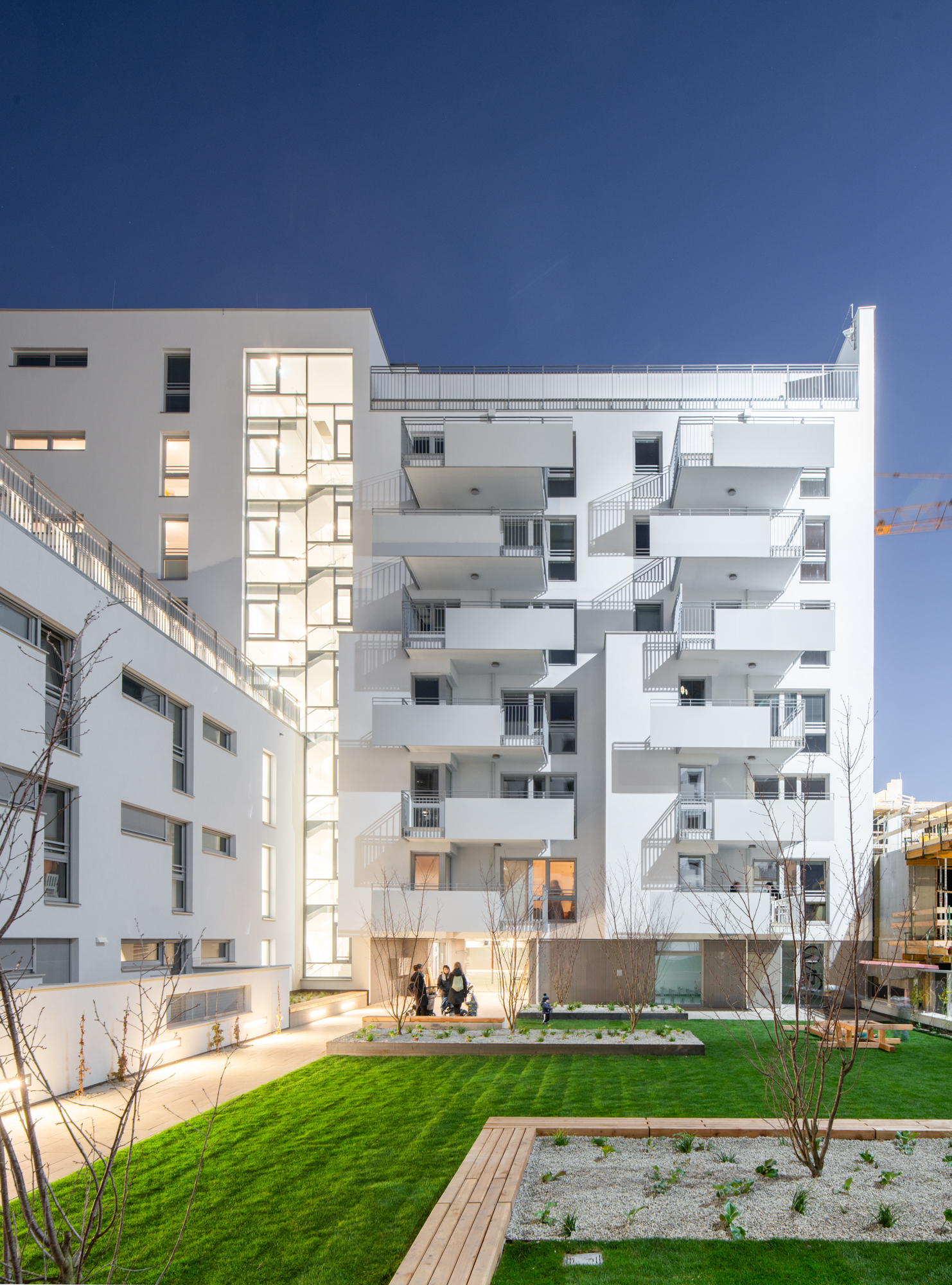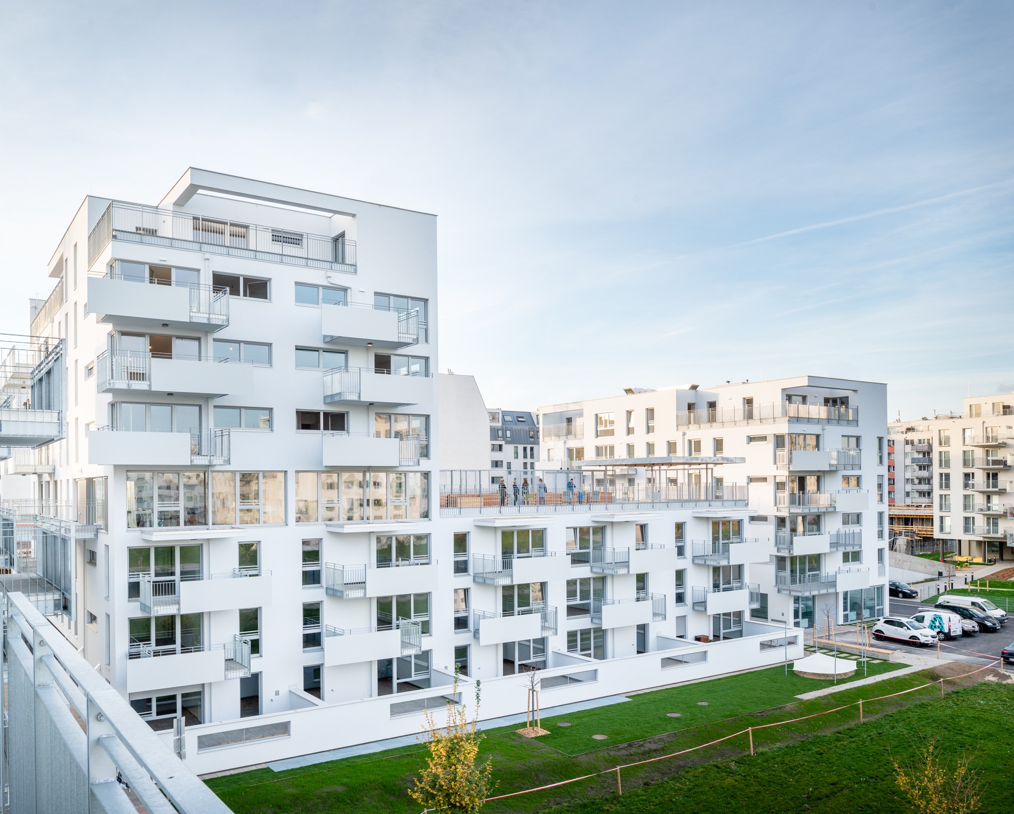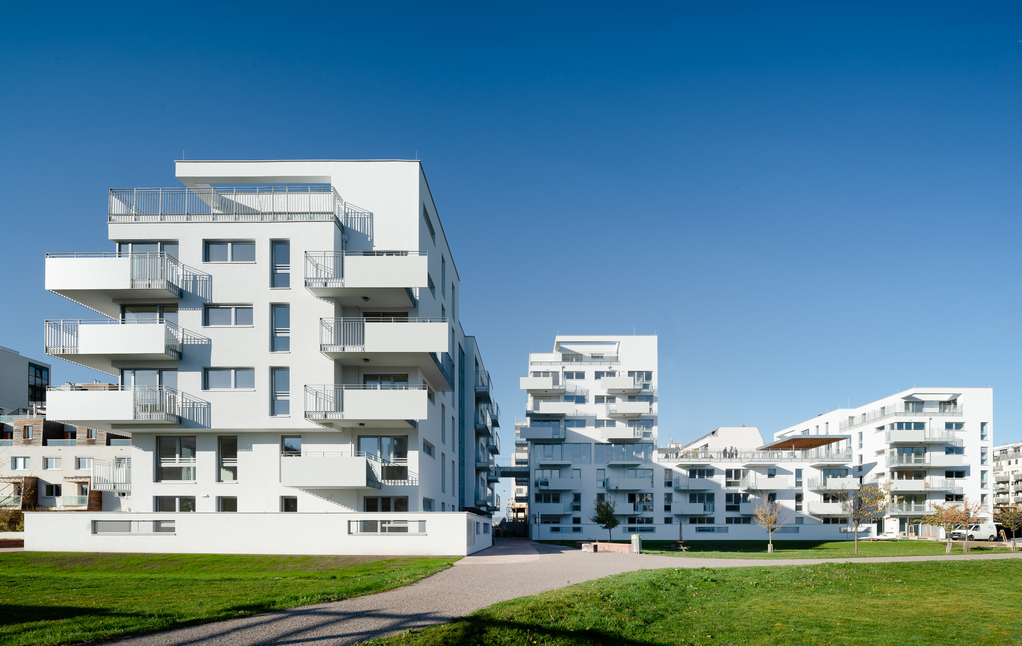 Das Generationenband verbindet diese Häuser miteinander; an diesem Weg, der sich in der Höhe durch die Anlage schlängelt, sind auch alle Gemeinschaftsräume, Kinderspielräume, Jugendraum, Gemeinschaftsterrassen angeordnet. „Räume also, die für gewöhnlich eher im Erdgeschoss untergebracht werden, doch hier sind sie auch deshalb in die Höhe gewandert, weil sich das Erdgeschoss mit seiner Lage am Park gut fürs Wohnen eignet“, erklärt Architekt Dieter Blaich. Als klare Grenze zwischen privater Terrasse und öffentlicher Kirschblüte dienen weiße, halbhohe Mauern mit schmalen Öffnungen. Eine willkommene Abwechslung zu den sonst in Wien üblichen Maschendrahtzäunen, die sofort nach Einzug mit Eigenbausichtschutz aus Thujen oder Baumarktbastmatten verunstaltet werden.