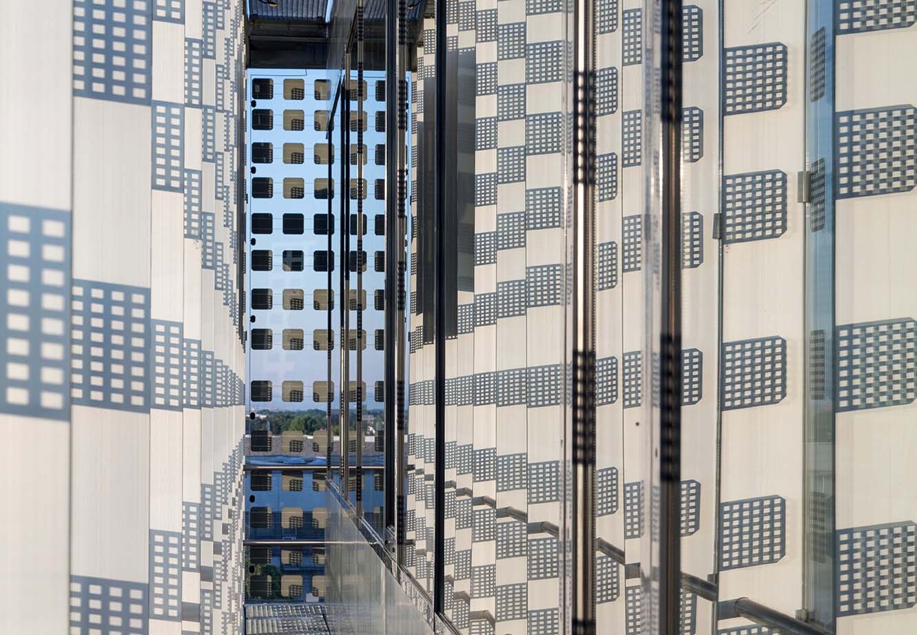 „transparente Sonnenschutzanlagen“/siebbedruckte verstellbare Glaslamellen aus Sonnenschutzglas - Blendschutz manuell bedienbar