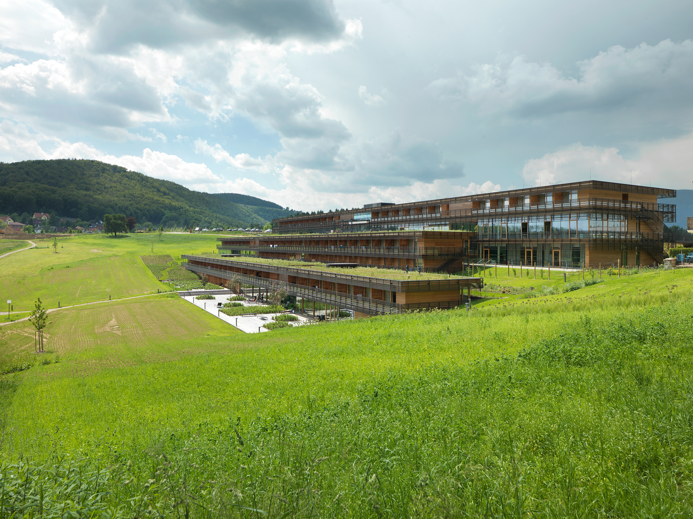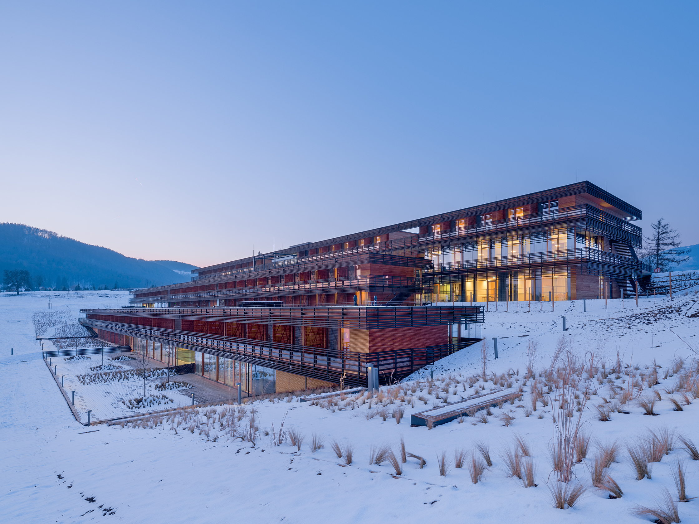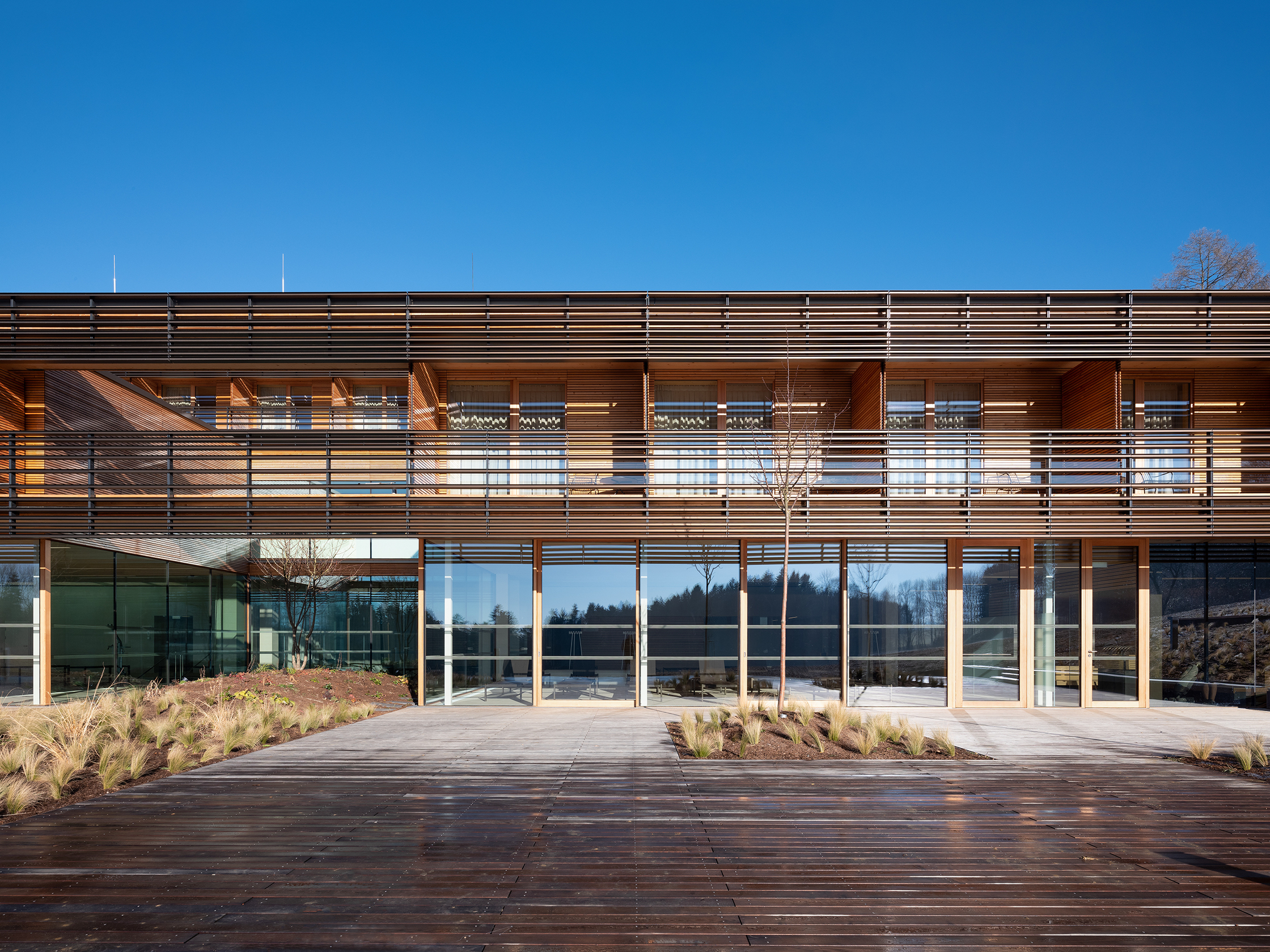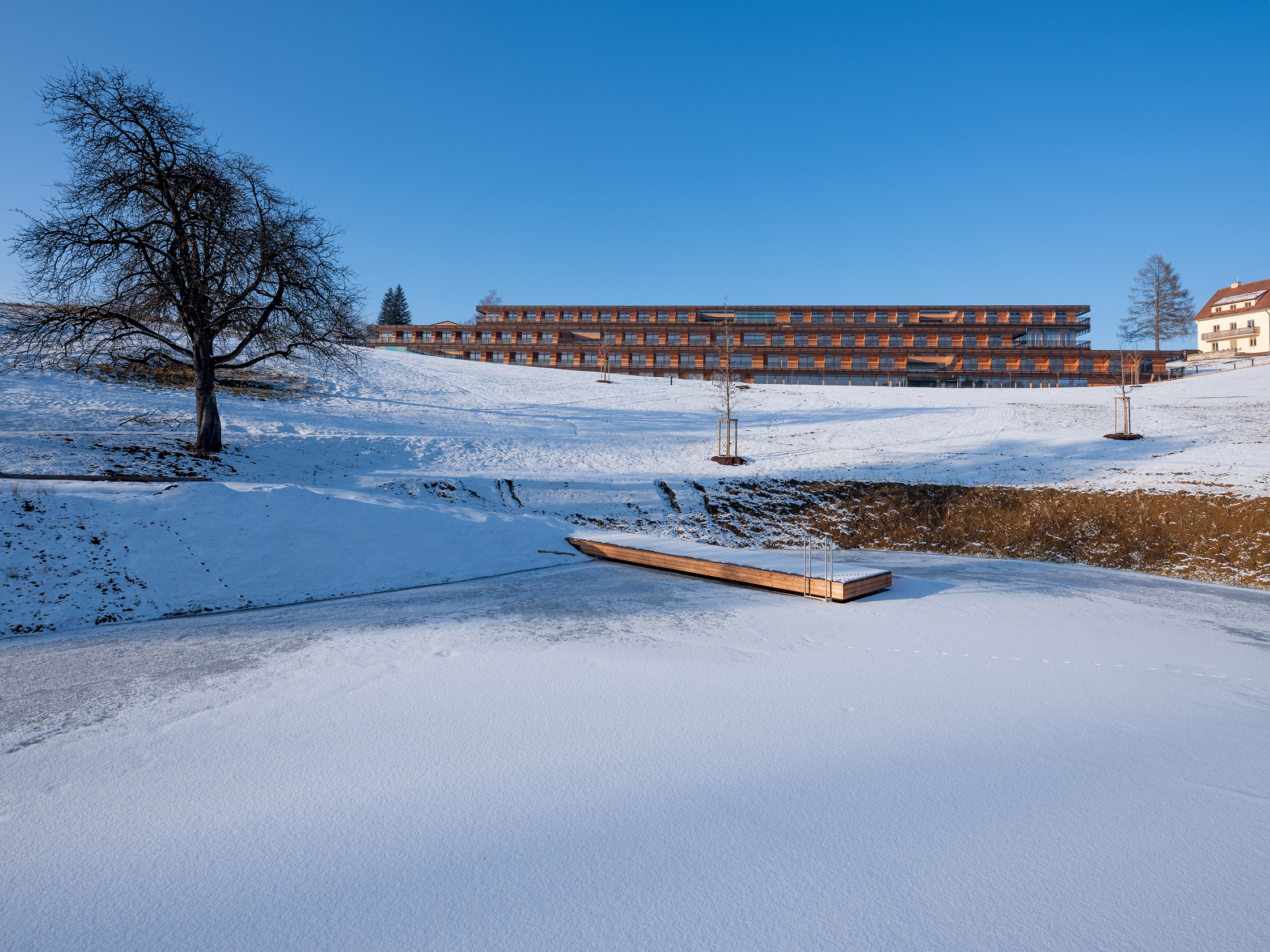 Das Zentrum für stationäre Gesundheitsförderung und Prävention, das Dietger Wissounig in Graz für die Versicherungsanstalt für Eisenbahnen und Bergbau geplant hat, bietet dafür einigen Anlass. Es ist ein sehr großes Gebäude in einer sehr schönen, freien Landschaft, von der man kaum annehmen würde, dass sie noch im Grazer Stadtgebiet liegt.