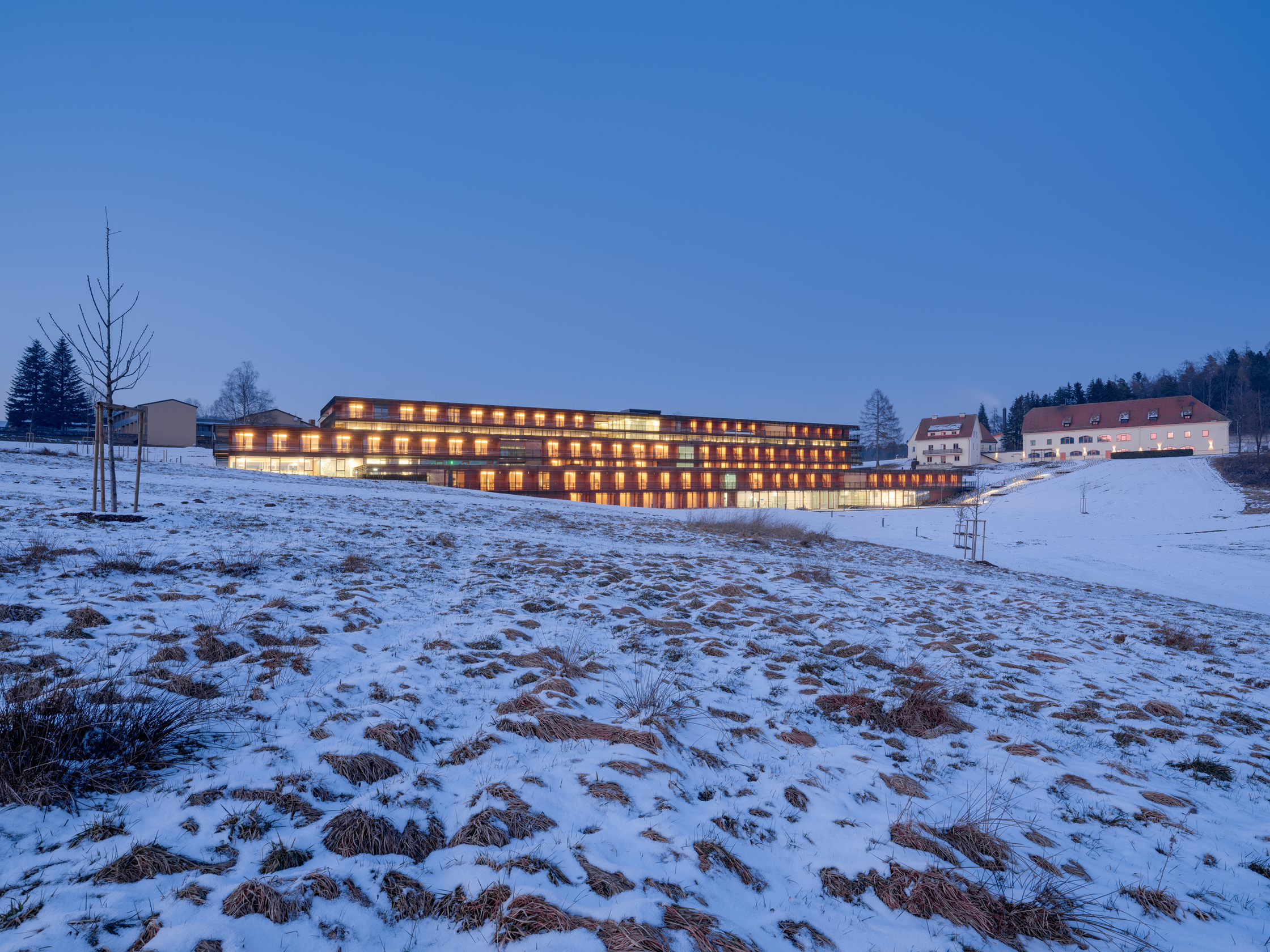 Ein wichtiges Gestaltungselement der Anlage sind fünf Atrien, die an strategischen Punkten in die Baukörper geschnitten sind. Diese Atrien dienen nicht zum Aufenthalt von Nutzern. Sie sind als kleine Landschaftsausschnitte angelegt, mit dichter Bepflanzung auf einem Miniaturhügel in der Mitte. Ihre Aufgabe ist es, gewissermaßen als Akkumulatoren von Achtsamkeit, die umliegenden Räume atmosphärisch zu beruhigen. Das mag seltsam klingen, passt aber sehr gut zur Aufgabe, der sich diese Gesundheitseinrichtung verschrieben hat. Hierher kommt man nämlich nicht, wenn man krank ist, sondern aus Gründen der Prophylaxe. Es geht um „stationäre Gesundheitsförderung“, bei der Versicherte eine Woche lang lernen, gesünder zu leben, vom Essen über die Bewegung bis zur Rauchentwöhnung. Deshalb gibt es hinter dem Speisesaal eine Lehrküche, in der die Gäste in die Welt abseits von Stelze und Schnitzel eingeführt werden. Die Gäste gehören zum größten Teil zur Altersgruppe jenseits der 50, wobei es eigene Angebote für die Zeit unmittelbar nach der Pensionierung gibt sowie für Pensionisten zwischen 65 und 75 Jahren. Die Kosten übernimmt die Versicherung, berufstätige Gäste müssen für die Zeit im „Josefhof“ ihren Urlaub konsumieren.
