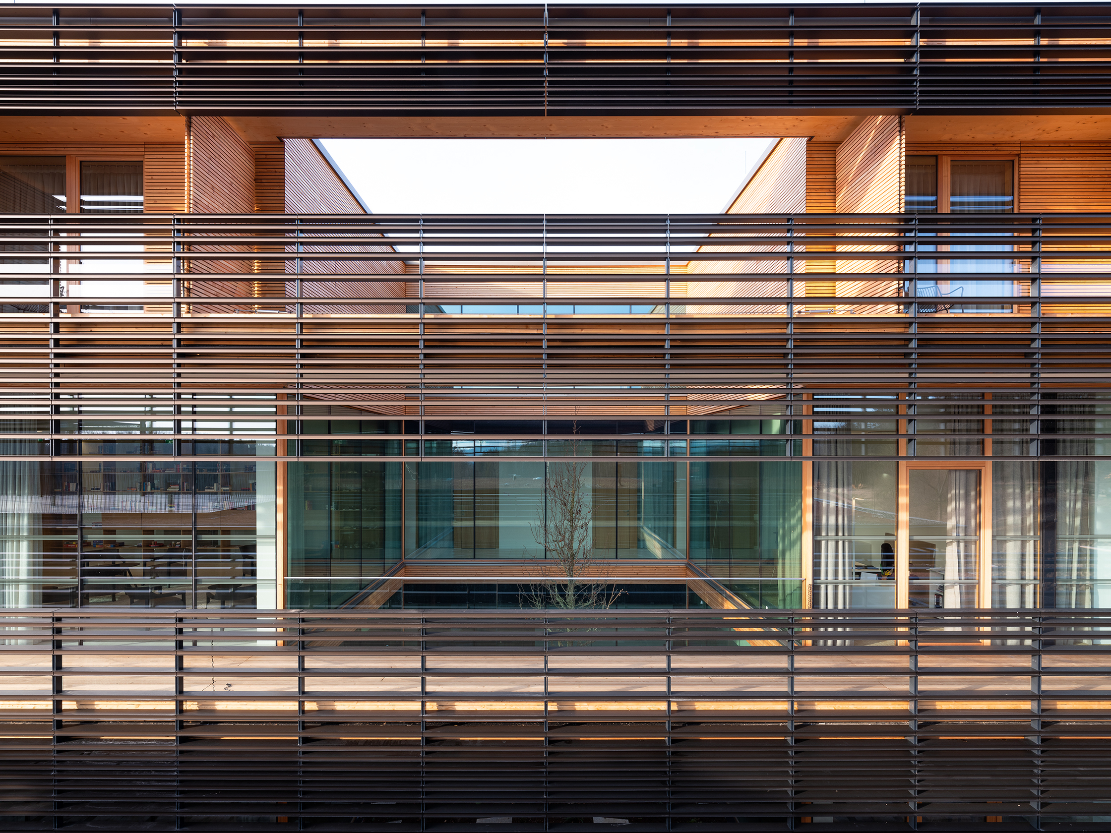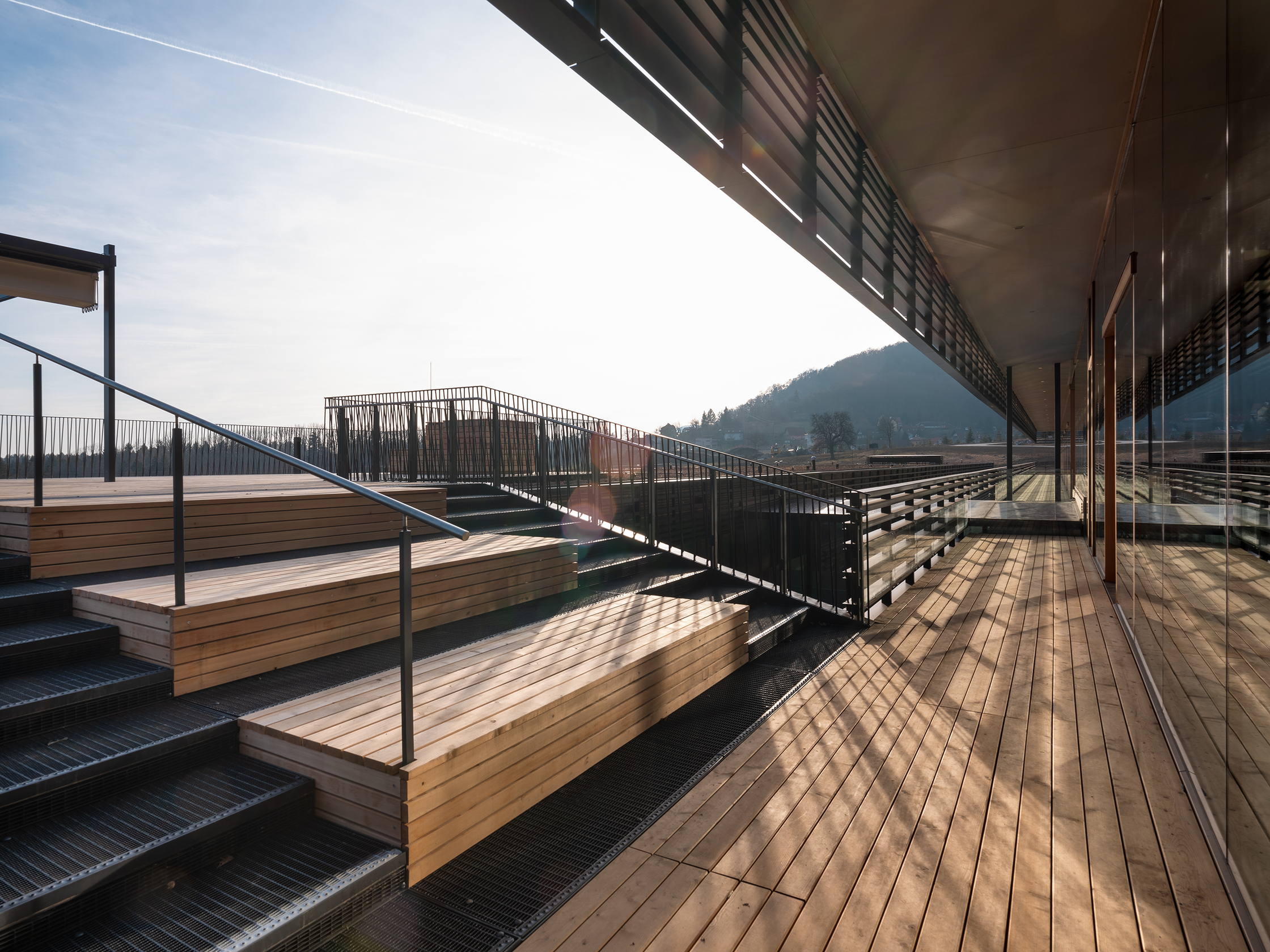 Um seinen ökologischen Fußabdruck zu reduzieren, ist das Haus zu einem überwiegenden Teil in Holz konstruiert, in einem Modulsystem der Firma Kaufmann Bausysteme, bei dem selbsttragende Boxen aus Brettsperrholz im Werk gefertigt und an der Baustelle montiert werden. Bis auf den Fernseher und die Vorhänge sind diese stapelbaren Einheiten inklusive der Sanitärbereiche fertig installiert. Serielle Fertigung kann leicht dazu führen, dass die Ergebnisse schematisch und barackenartig aussehen. Der „Josefhof“ ist der Beweis, dass es auch anders geht. Das liegt einerseits daran, dass nicht die gesamte Konstruktion aus präfabrizierten Boxen besteht. Die erdberührenden Bauteile im Hang sind aus Stahlbeton, was größere Stützweiten und unterschiedliche Raumhöhen erlaubt, wie sie für Gymnastik- und Speisesäle benötigt werden. Am spannendsten werden die Räume, wenn sich Konstruktionssysteme überlagern, etwa dort, wo das große Schwimmbecken im untersten Geschoß von einem raumhohen Träger überspannt wird, der die Hotelboxen trägt, aber zugleich ein Oberlicht ermöglicht, durch das Licht von oben auf das Becken fällt. Ein besonders raffiniertes Detail mit einem eigenen Rhythmus sind die Balkonbrüstungen, die aus horizontalen Aluminium-Lamellen gebildet werden und die Beschattung übernehmen: Ihre Breite verhindert direkte Sonneneinstrahlung im Sommer und erlaubt sie im Winter. Auf eine Klimatisierung der Zimmer konnte so verzichtet werden. Allerdings brauchen die Lamellen, um als Absturzsicherung zugelassen zu werden, eine Ergänzung: Damit Kinder die Brüstungen nicht mit einer Leiter zum Hochklettern verwechseln, sind diese zusätzlich mit Glasplatten abgedeckt – was zu einem weiteren Detail führt, einem Mechanismus, mit dem die Gläser zur Reinigung heruntergeklappt werden können. Auch das gehört zu guter Architektur.