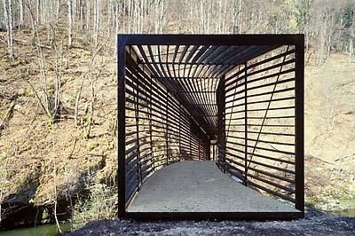 Die unweit von Boudry als Stahl-Holz-Konstruktion errichtete Passerelle überspannt die Distanz von 27,5 Metern stützenlos. Statisch ist die Brücke wie eine Röhre konzipiert. Die organisch komponierte S-Form absorbiert die Spannungen und fügt sich harmonisch in die Landschaft des zwischen Felsen sich windenden Flusses ein. Die horizontalen Holzlamellen spenden Schatten und erzeugen im Innern der Passerelle tanzende Lichtreflexe.