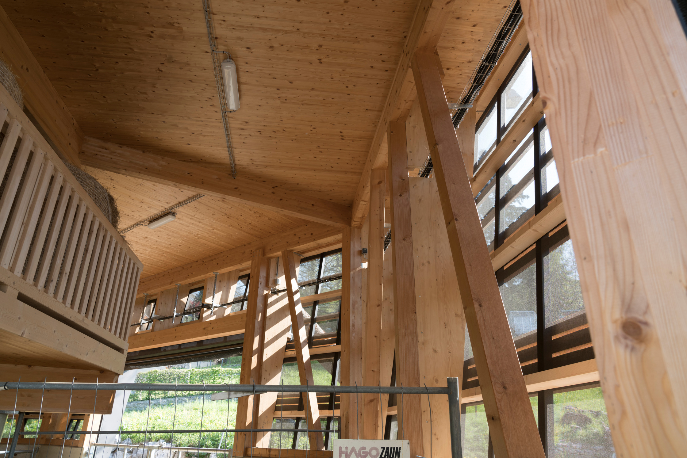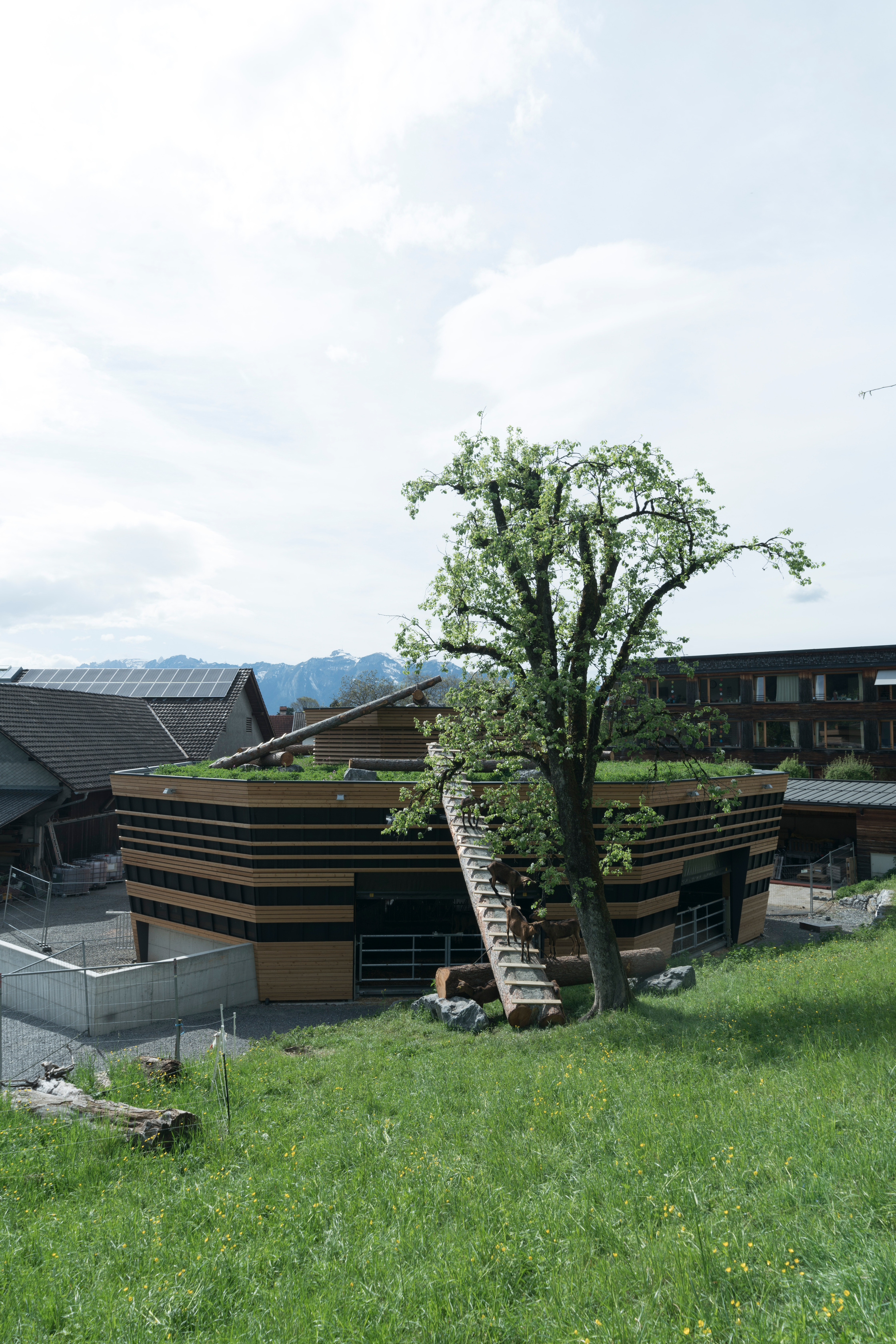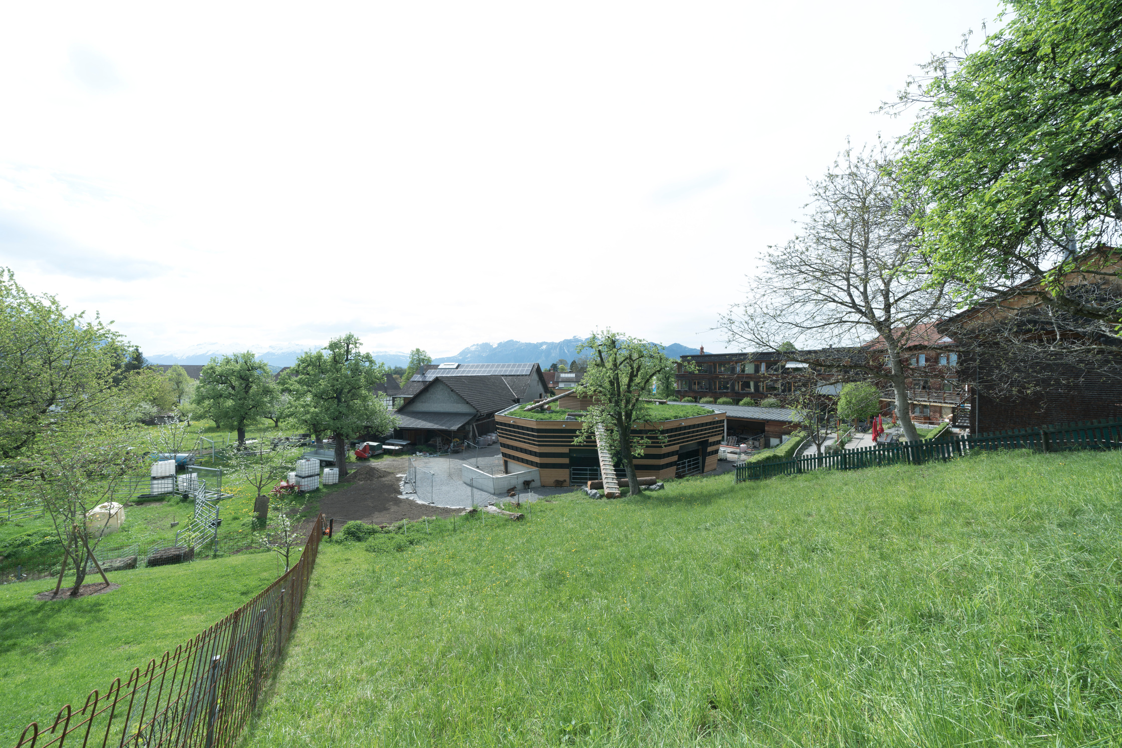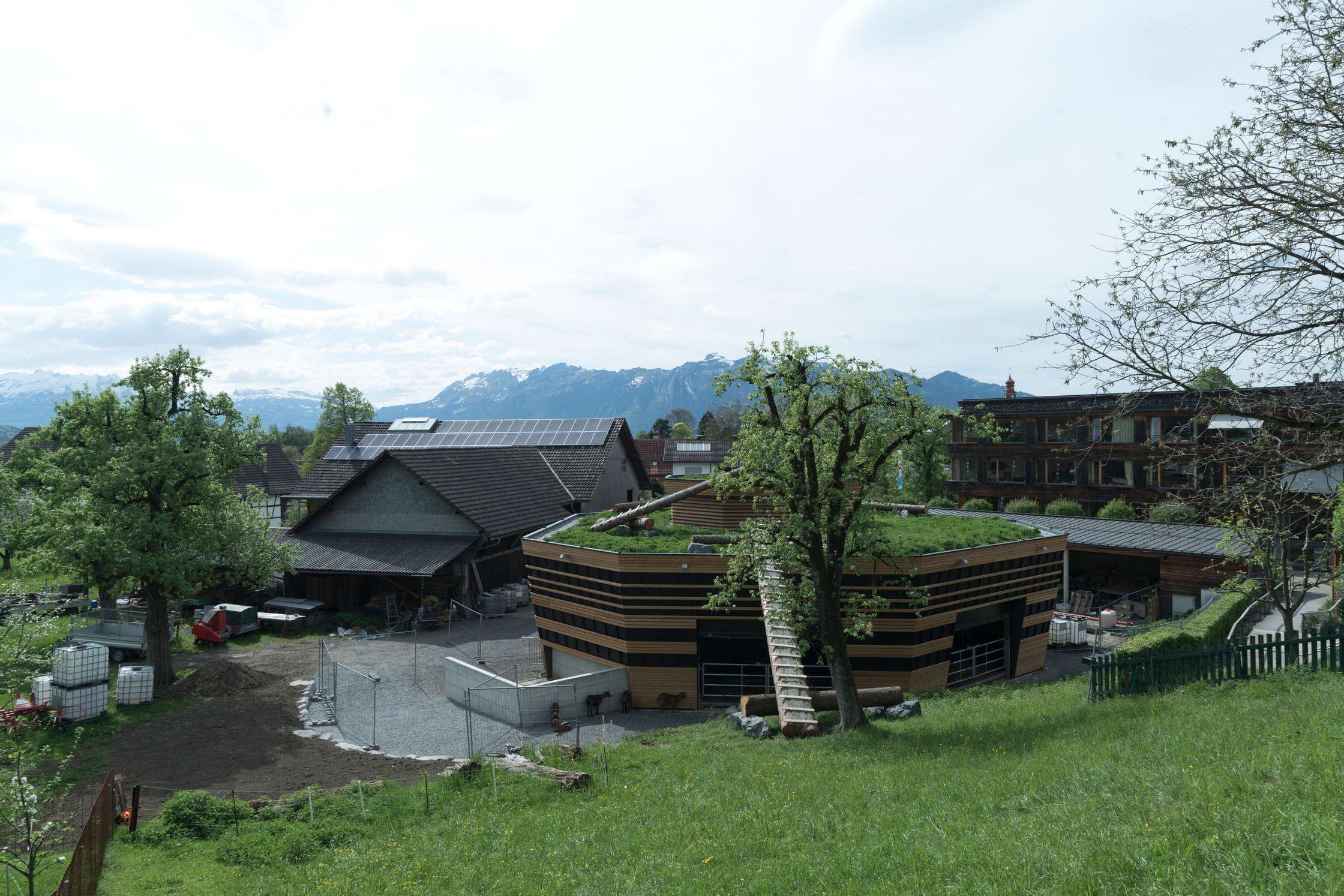 Mit dem intensiv bepflanzten Dach ersetzt das Gebäude die verbaute Fläche durch ein neues Stück Kulturlandschaft: Die vielfältige Begrünung dient als Ziegenweide, speichert einen Großteil des Niederschlags und dient als Rückhaltebereich.