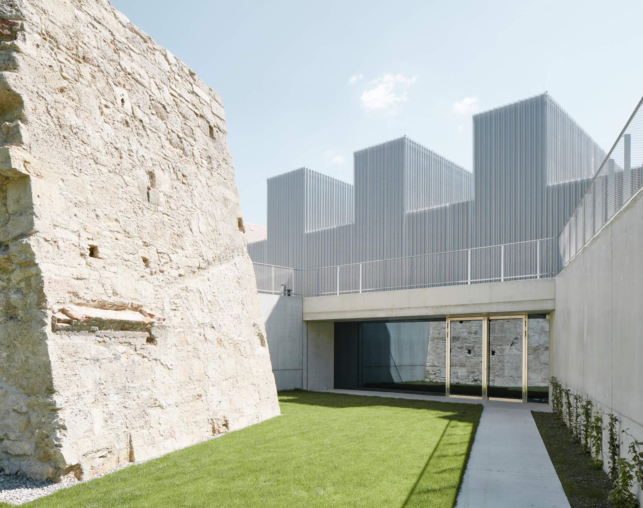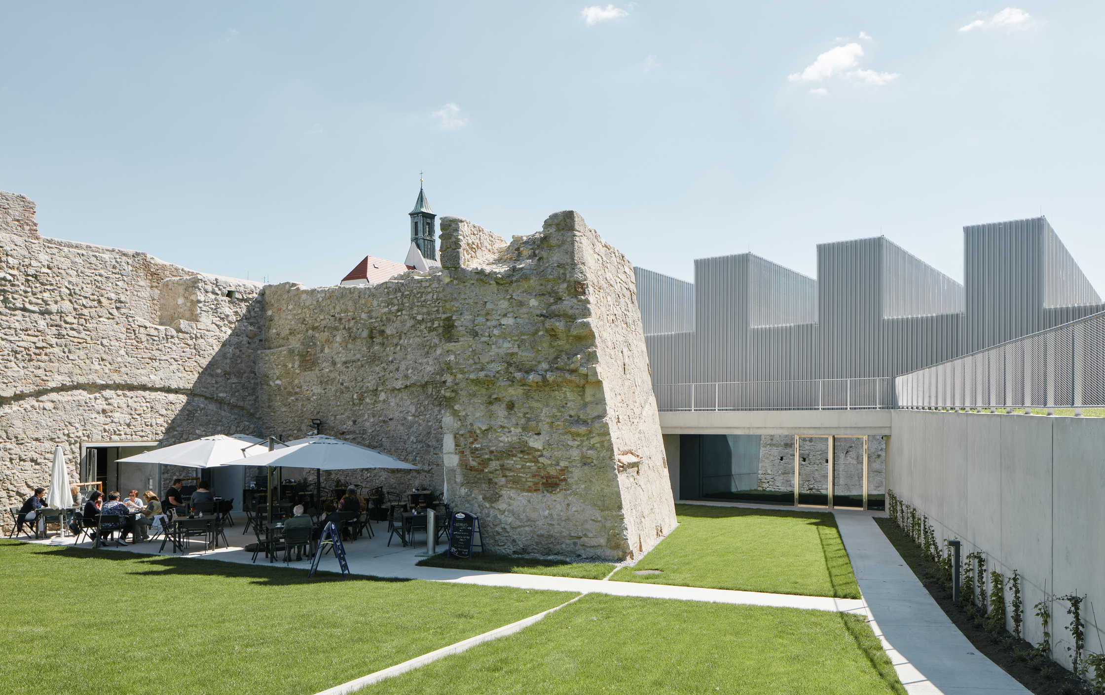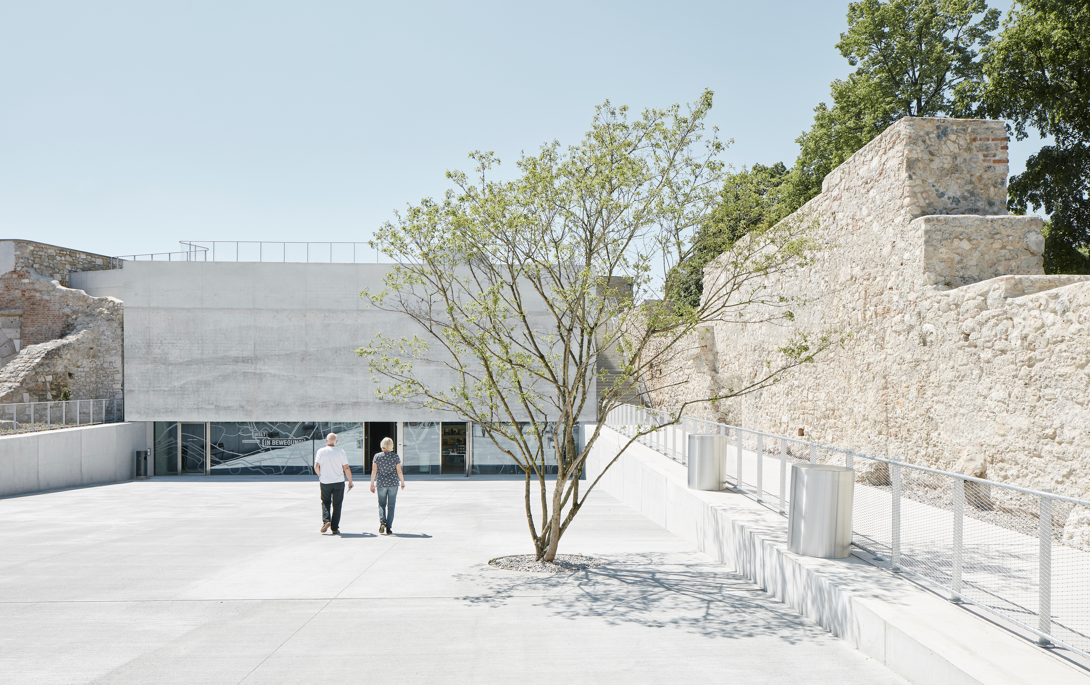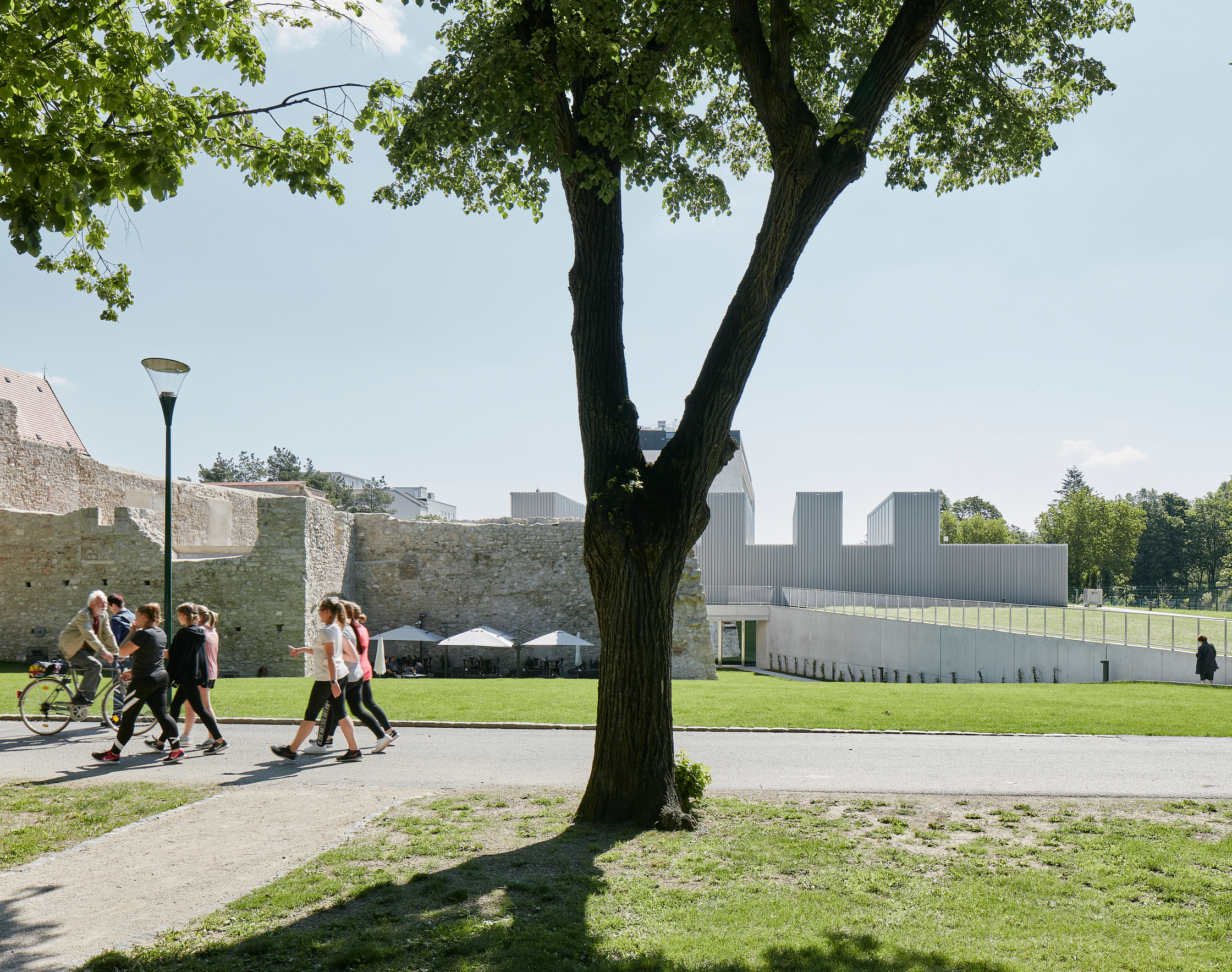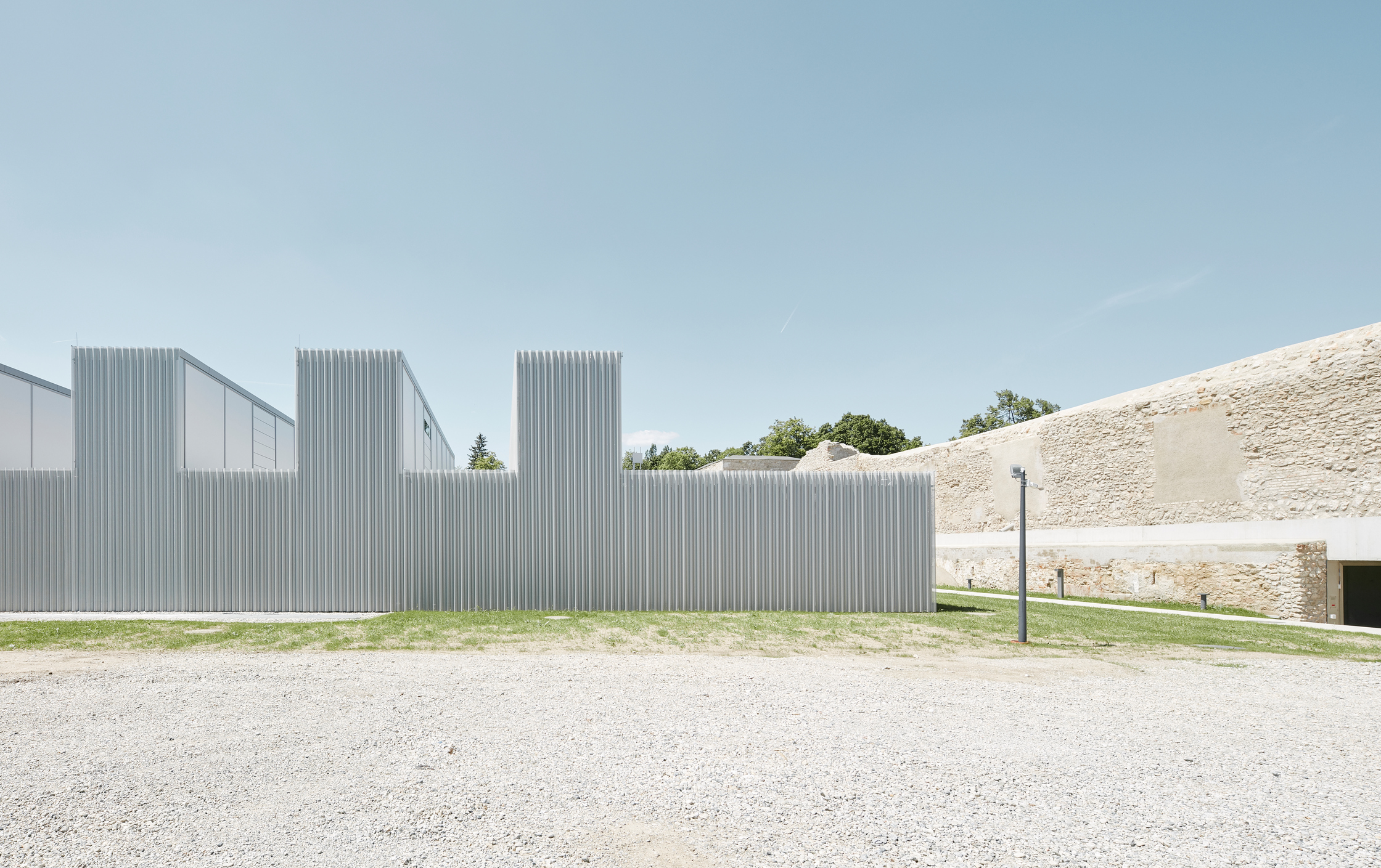 Das Vorfeld der Kasematten gestalteten sie als sacht abfallenden Platz, der von der Bahngasse auf das Bestandsniveau der Kasematten hinabführt. Dort empfängt ein Neubau die Besucher mit einer verglasten Erdgeschoßzone und darüber einem schlichten massiven Schild aus Sichtbeton, das dem Neubau unaufdringlich Präsenz verleiht und – ob beabsichtigt oder nicht – als Referenz auf die wehrhafte Funktion des Bestandes deutbar ist. Anlässlich der Landesausstellung dient die mächtige Betonwand derzeit als Trägerin einer Werbeplane. Es wäre zwecks Wahrung der Originalität der neuen und alten Architektur ratsam, dies nicht zu einem Dauerzustand werden zu lassen.