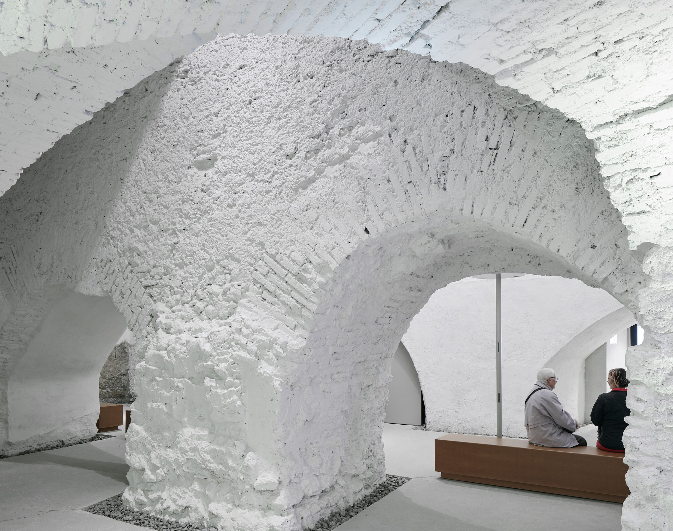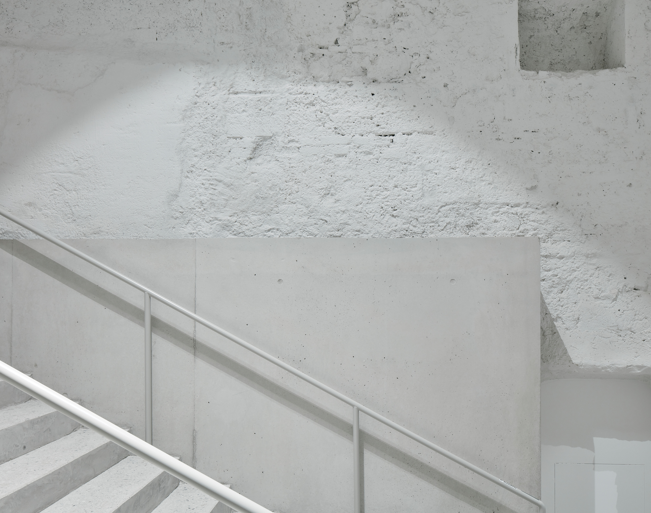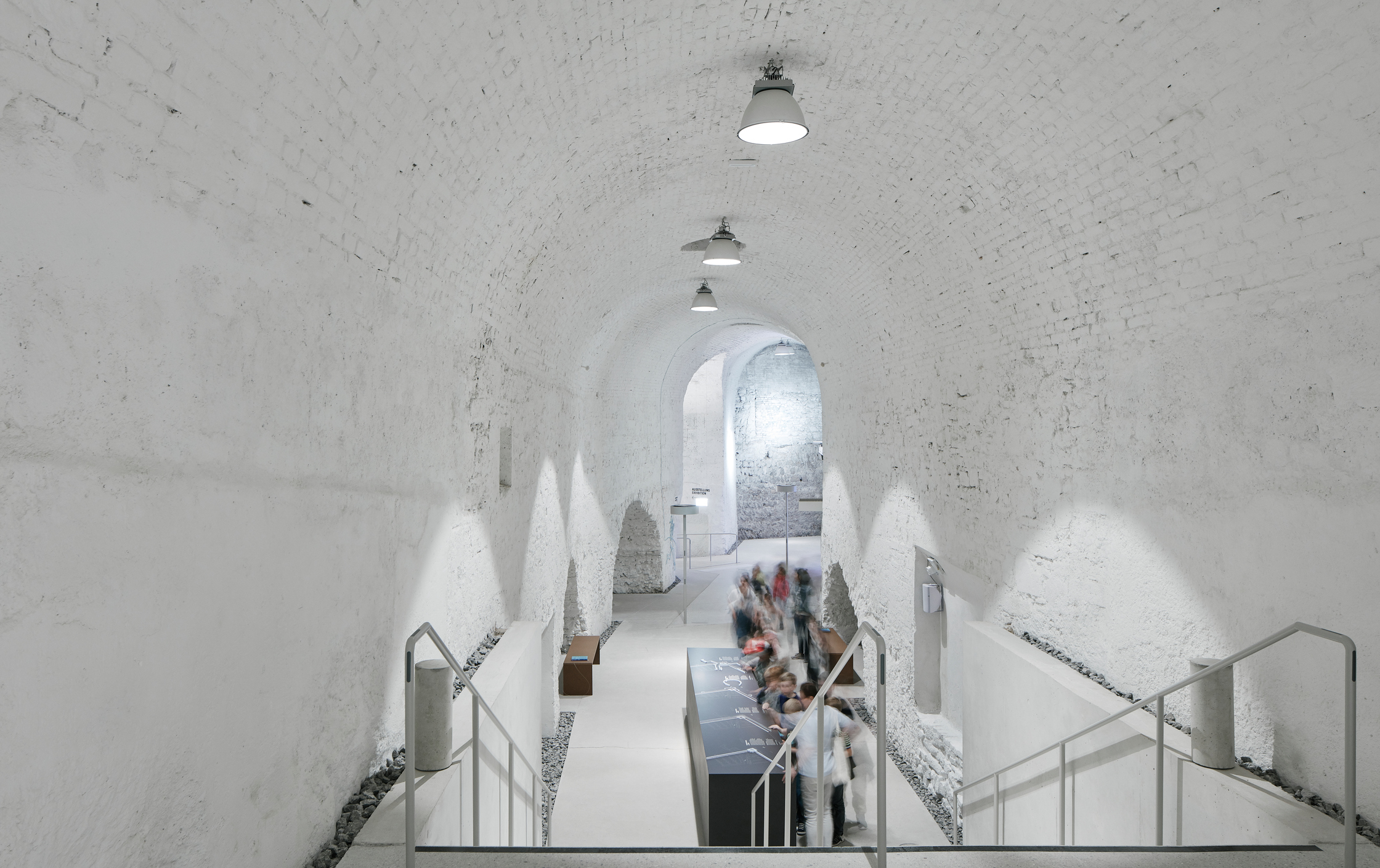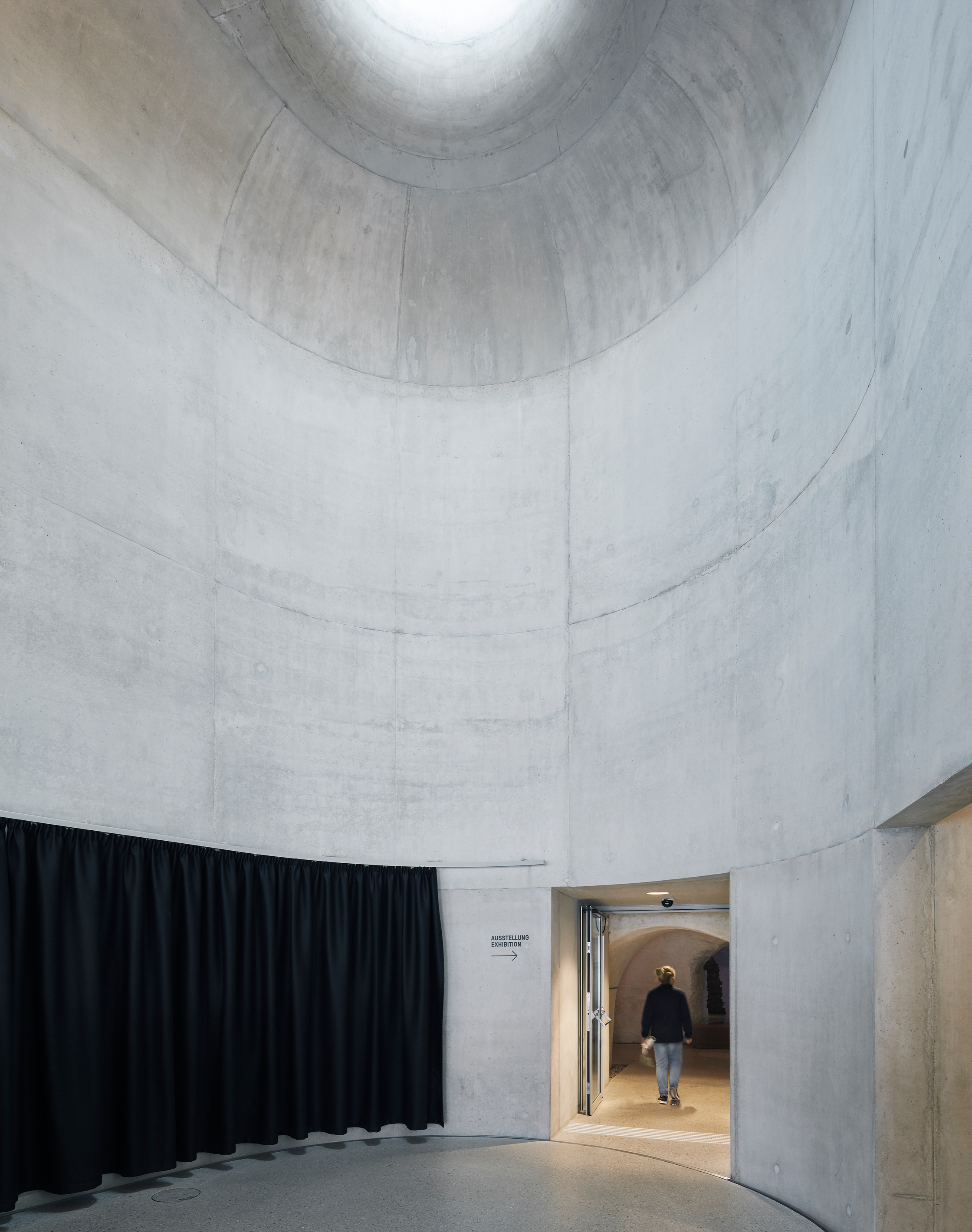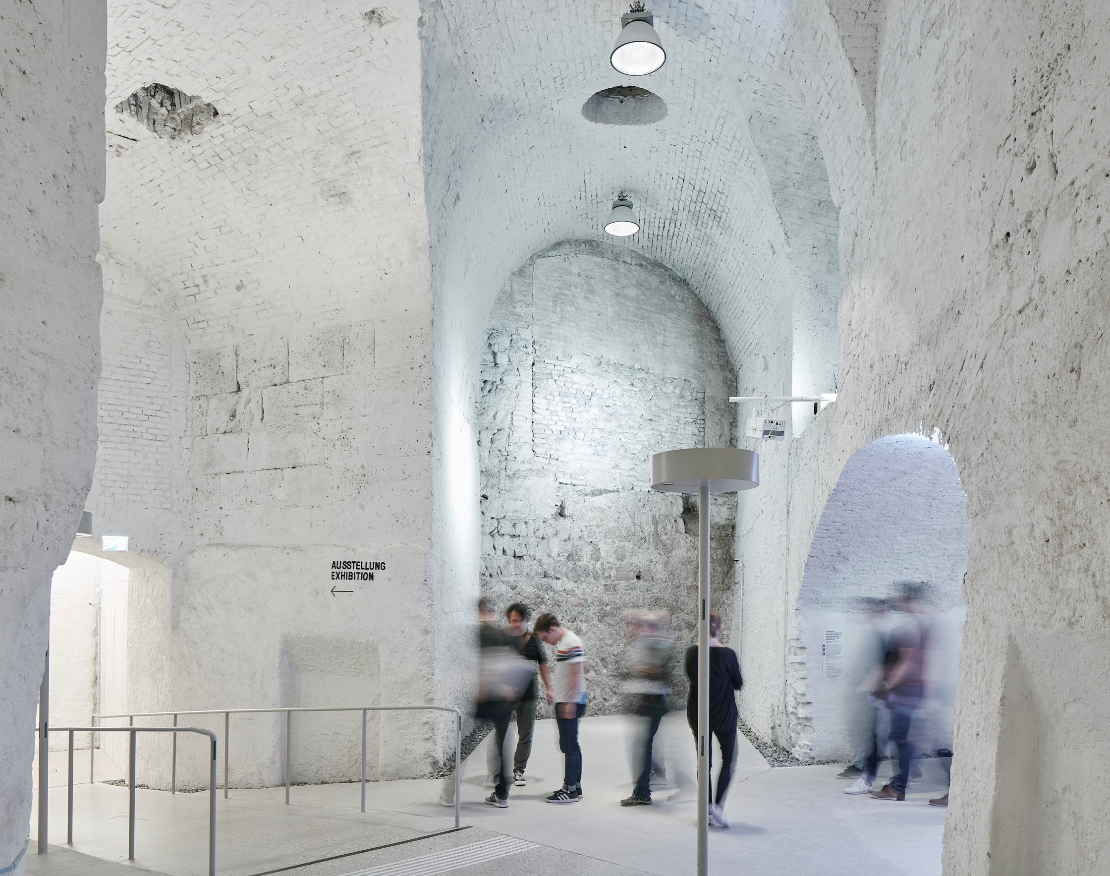 Das neue Foyer bietet sich als eindrucksvoller, über die gesamte Gebäudehöhe erstreckender Raum dar. Im Scheitelpunkt des im Grundriss konisch zulaufenden Vestibüls sorgt eine Lichtkuppel für Zenitallicht. Wölbung, Raumdimension und die Öffnung nach oben stellen – so wird man, einmal in das unterirdische Raumsystem eingedrungen, erkennen – die zeitgenössische Ouvertüre für die folgenden freigelegten historische Strukturen dar. Diese wurden von späteren Einbauten befreit und bleiben frei von jedweden Einbauten – bis auf den neuen Boden aus sandgestrahltem Beton, der die vorgefundenen Niveauunterschiede ausgleicht.