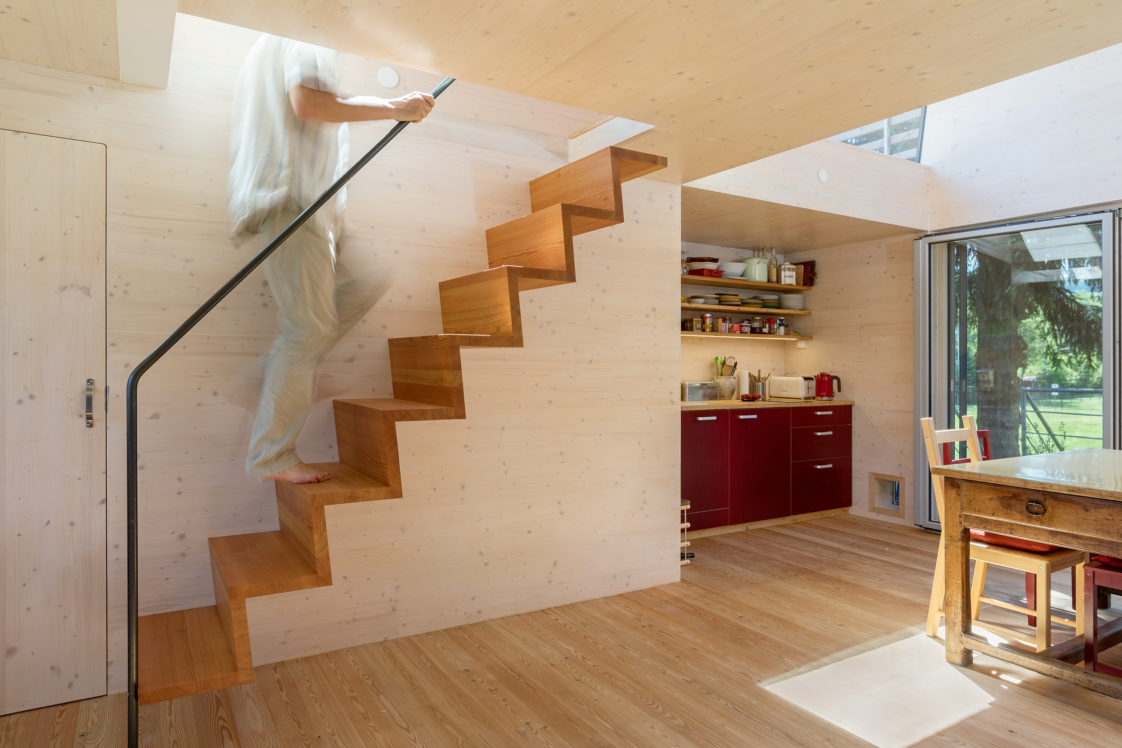 Brettsperrholz-Fertigteile: zugleich dekorativ (Innensichtfläche) als auch konstruktiv (Wandscheiben, Decken),