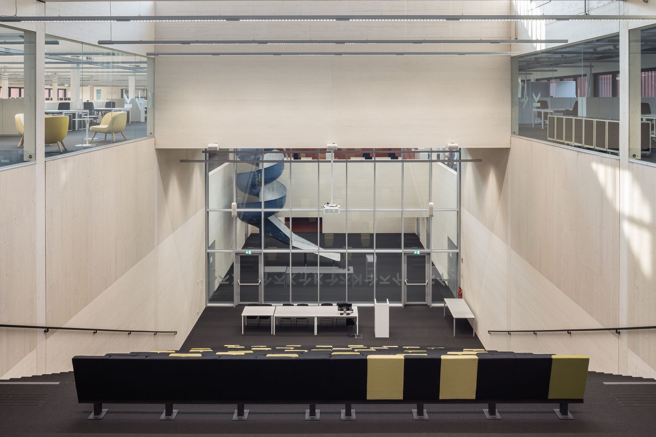Das Open Innovation Center (OIC) ist in zwei Bereiche gegliedert: Der nördliche, etwas kleinere Teil birgt eine dreischiffige Fabrikationshalle, die LIT-Factory, eine „vernetzte Lehr-, Lern- und Forschungsfabrik für Smart Polymer Processing und Digitalisierung“. Hier können neue Entwicklungen aus dem OIC auf kurzem Weg in kleinen Serien produziert werden. Der größere Teil des Gebäudes wird von einer Struktur eingenommen, die den Gedanken der fachgebietsübergreifenden Zusammenarbeit von Wissenschaftern und Wirtschaftstreibenden ebenso räumlich fasst wie den hohen Stellenwert von offenem Austausch bei der Lösung intellektuell anspruchsvoller Aufgaben. Es ist ein „Open Workspace“, den Riepl Riepl Architekten als einen von zwei massiven Stiegenhauskernen ausgesteiften Holz-Skelettbau entwickelt haben. Etwas weniger modisch ausgedrückt: Riepl Riepl Architekten haben ein anregend spannungsvolles, großzügiges Raumgefüge geschaffen, das alles tut, was Raum tun kann, um Kommunikation, Kooperation und Inspiration zu fördern. Das wird schon unmittelbar hinter dem Haupteingang spürbar, wo eine breite, aus „normalen“ und Sitzstufen komponierte Treppenanlage auf die obere Ebene führt. Zwei weitere Lufträume, deren einer, das multifunktionale OIC Stufenforum, auch als Hörsaal für 200 Personen eingesetzt werden kann, stärken die Verbindung der Geschoße untereinander zu einem großen Ganzen.