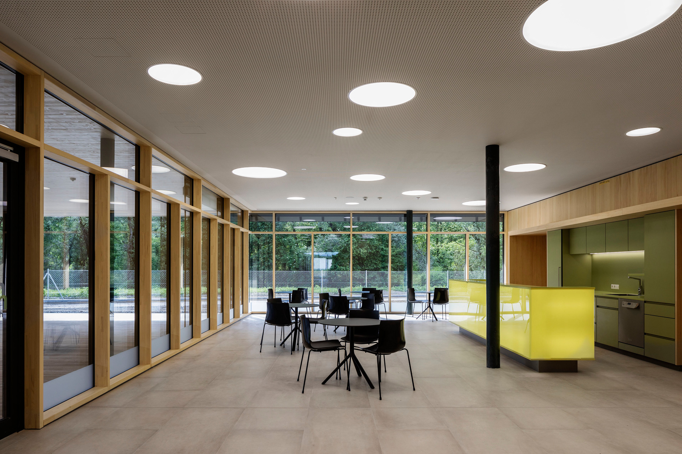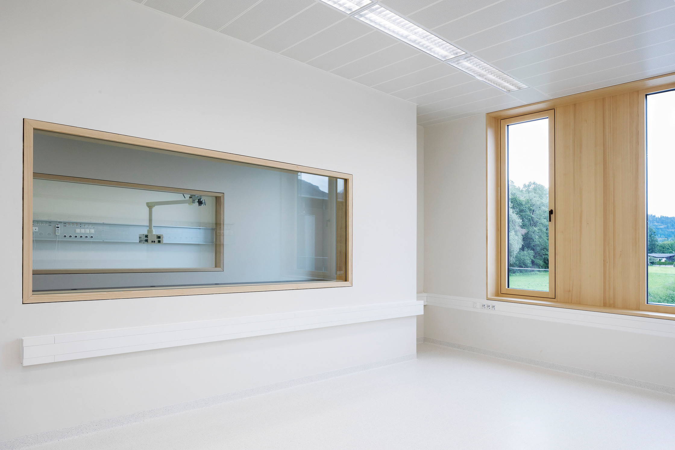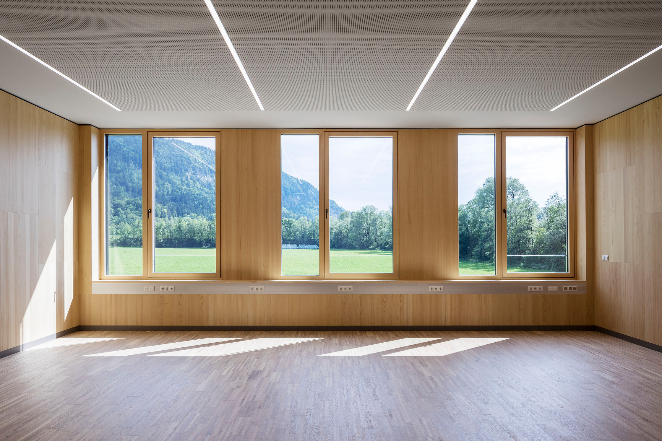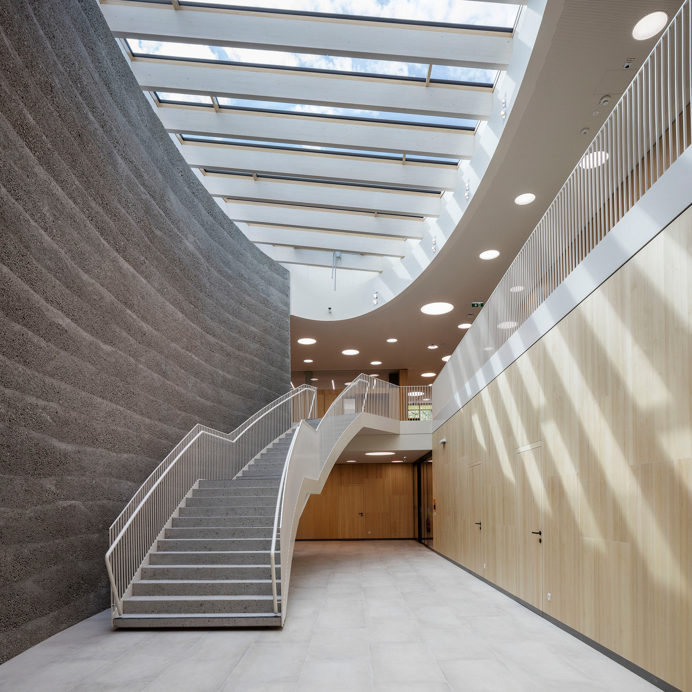 Im Erdgeschoss werden alle Räume mechanisch be- und entlüftet. Im Obergeschoss werden alle 6 Klassen, der Unterrichtsraum und alle innenliegenden Räume mechanisch be- und entlüftet. Die Frischluftansaugung erfolgt über einen Bodenkollektor im Technikraum.