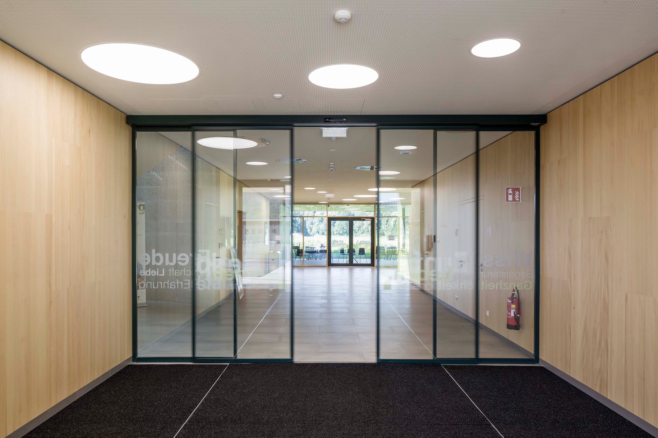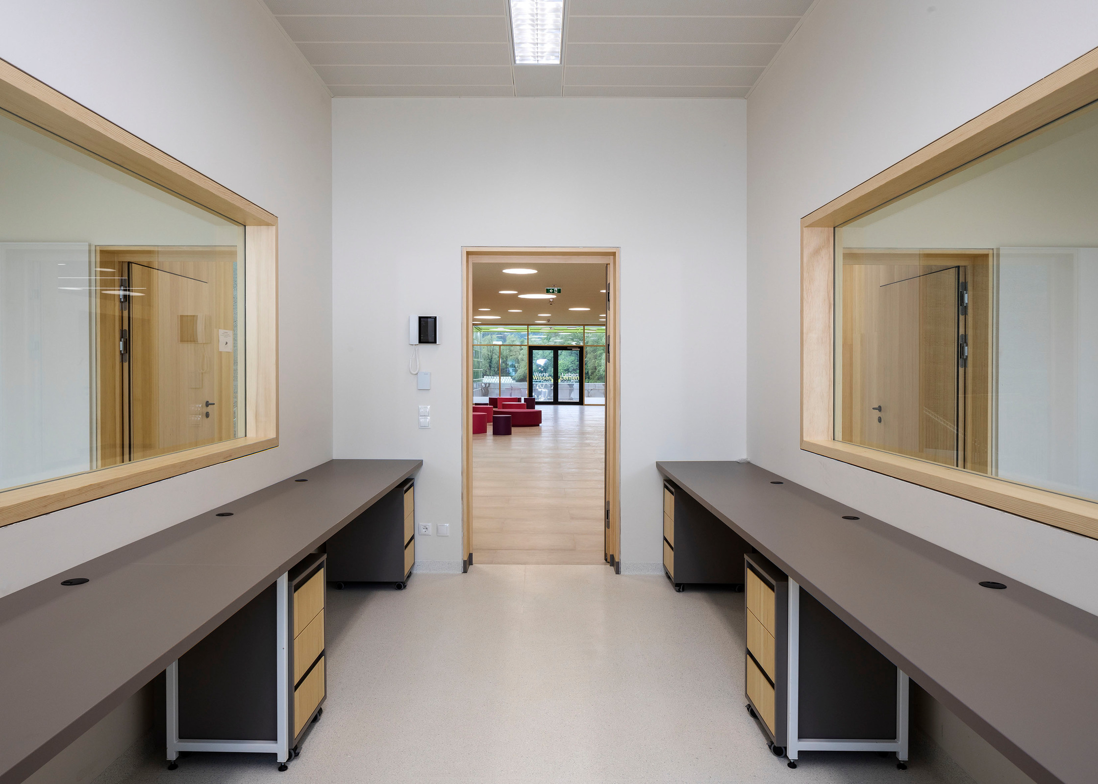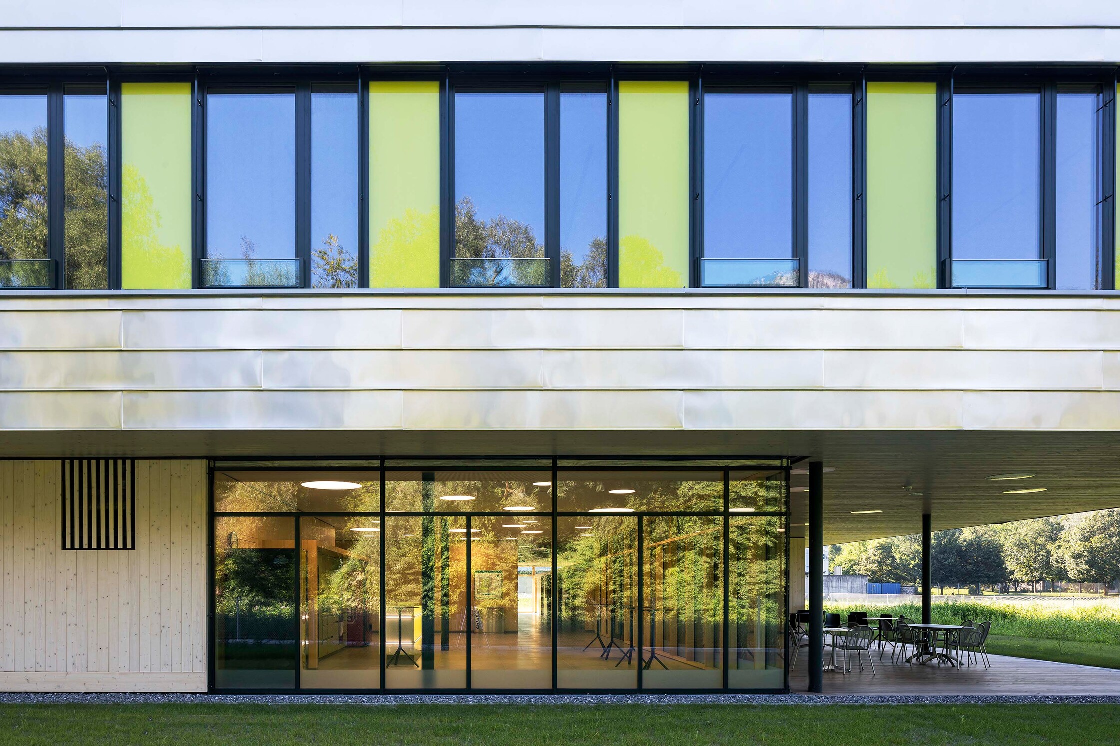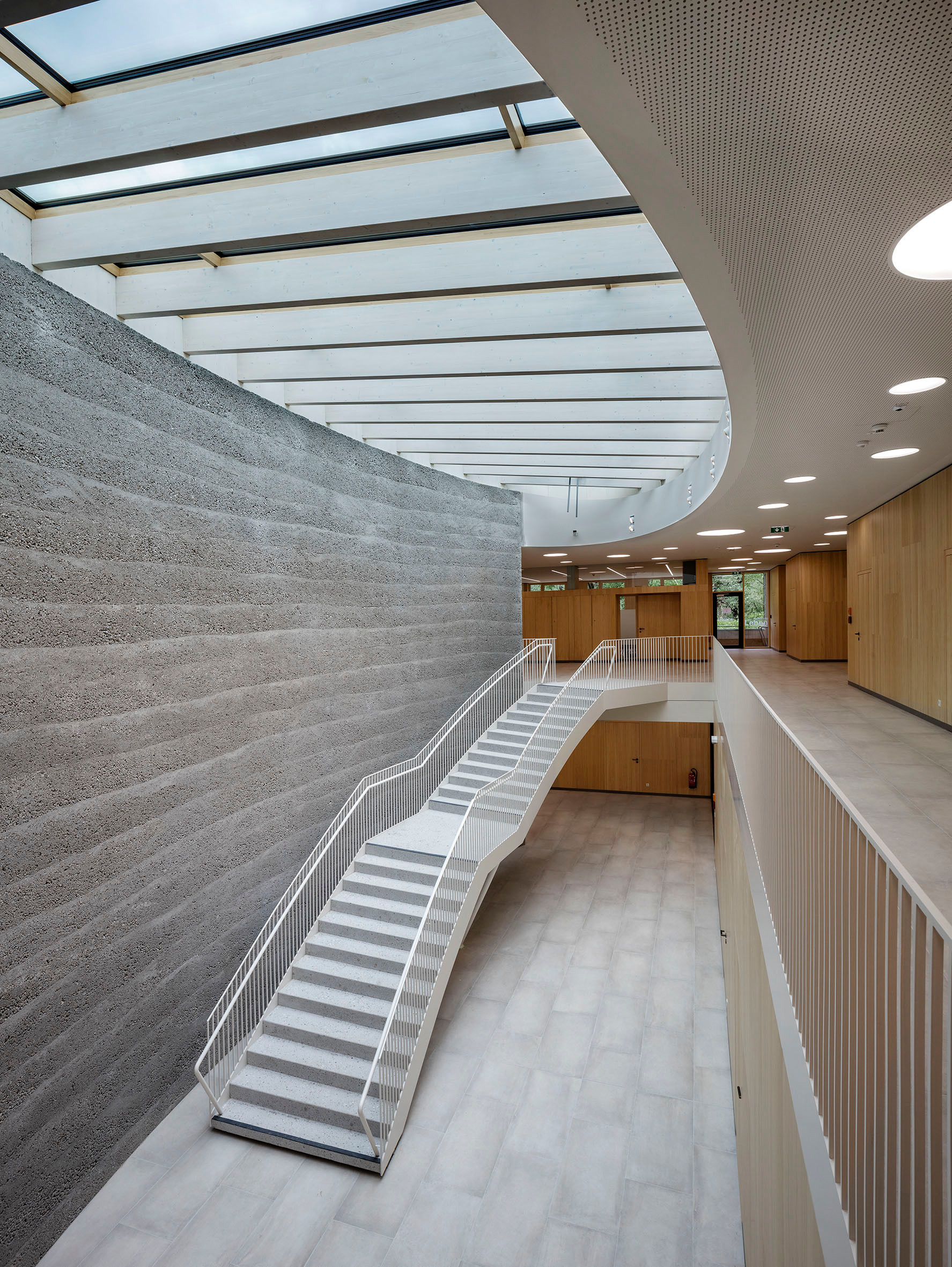 Im Erdgeschoss werden alle Räume mechanisch be- und entlüftet. Im Obergeschoss werden alle 6 Klassen, der Unterrichtsraum und alle innenliegenden Räume mechanisch be- und entlüftet. Die Frischluftansaugung erfolgt über einen Bodenkollektor im Technikraum.