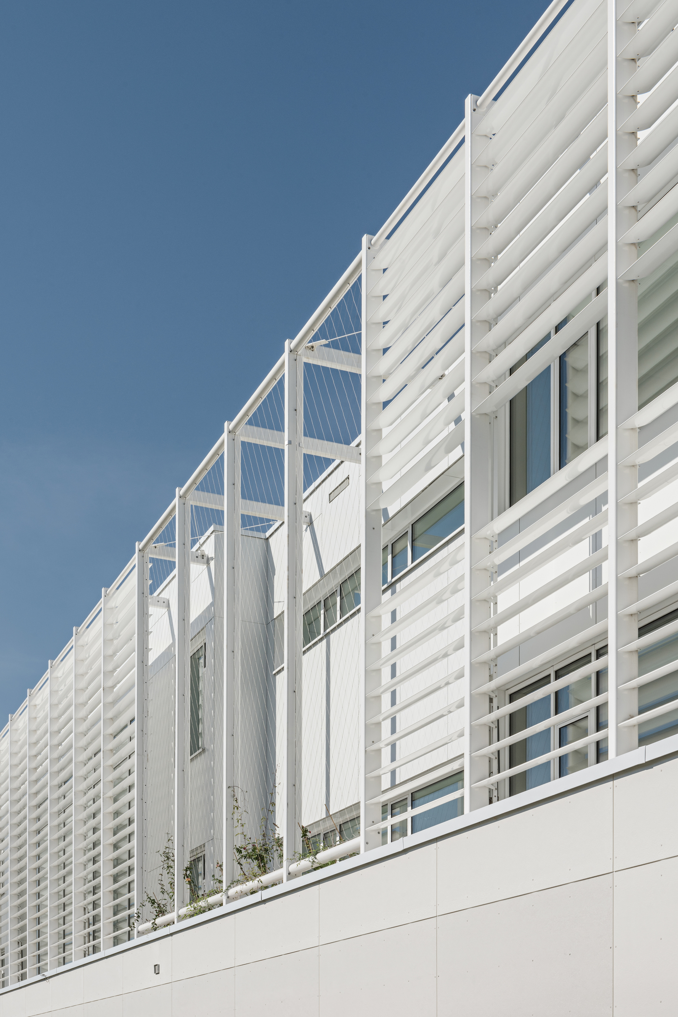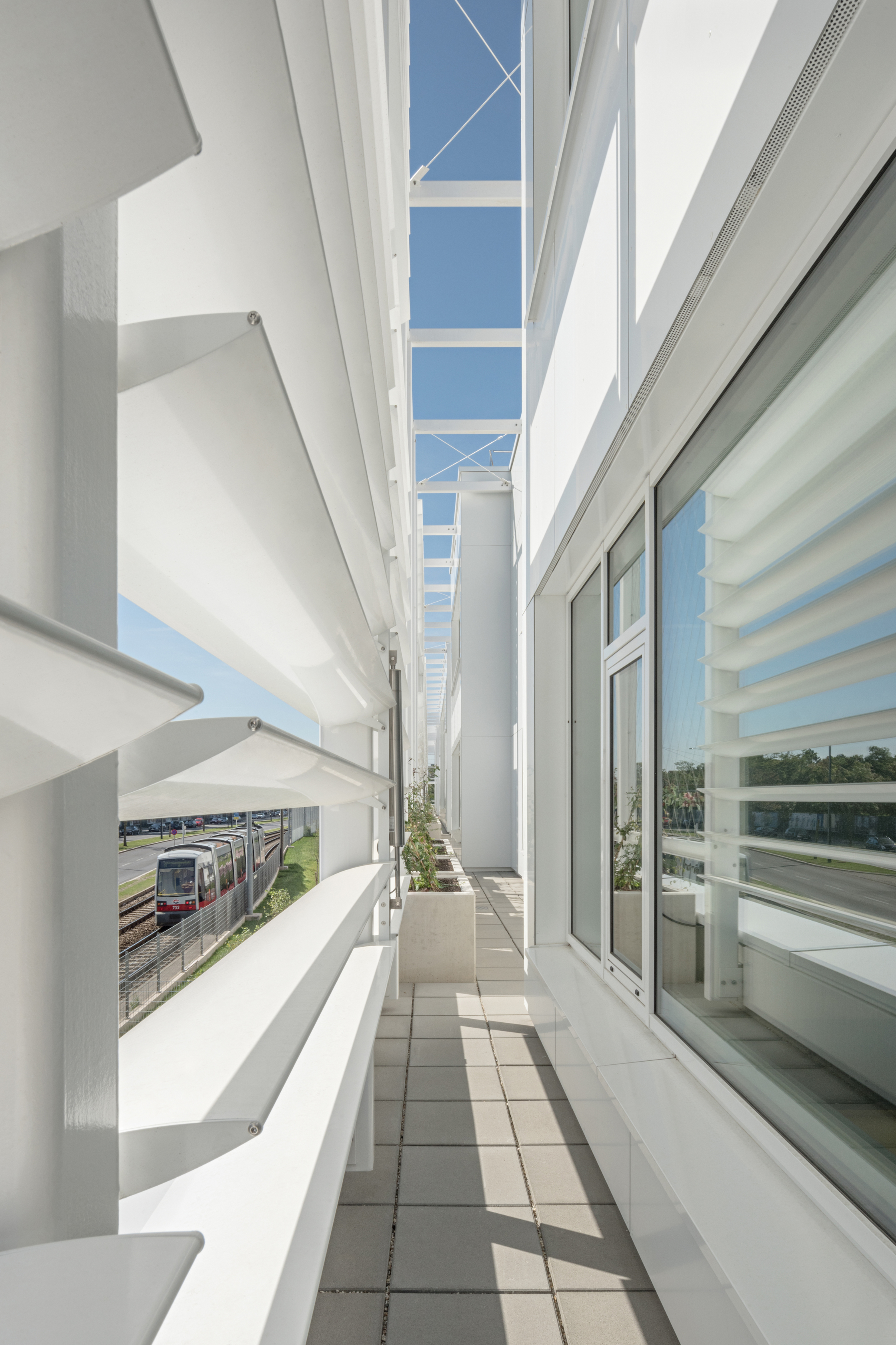 Die Antwort der Silbermayr Welzl Architekten ist bestechend einfach. Sie nahmen die Länge nicht als zu bekämpfenden Nachteil, sondern erkannten deren Vorteile: Eine geringe Gebäudetiefe gestattet beste Versorgung mit Tageslicht sowie eine gute Verschränkung zwischen innen und außen, selbst wenn Terrassen nur an einer Seite sinnvoll sind. Rankgerüste und Lamellen bilden zur Straße einen Filter. Dahinter liegen weniger frequentierte Räume wie Nassräume und Garderoben. Zum Garten öffnet sich die Schule in allen drei Ebenen und über die ganze Länge raumhoch verglast zum vom Atelier Landschaft naturnah gestalteten Freiraum und auf die Balkonbänder. Zwischen der Nebenraumzone und der intensiv genutzten Flanke mit den Klassenzimmern legten die Architekten eine Promenade an, die sich zwischen den Raumgruppen nach beiden Seiten zu offenen Lern- und Aufenthaltszonen weitet, die gartenseitig auf die Loggien und Balkone ins Freie münden.
