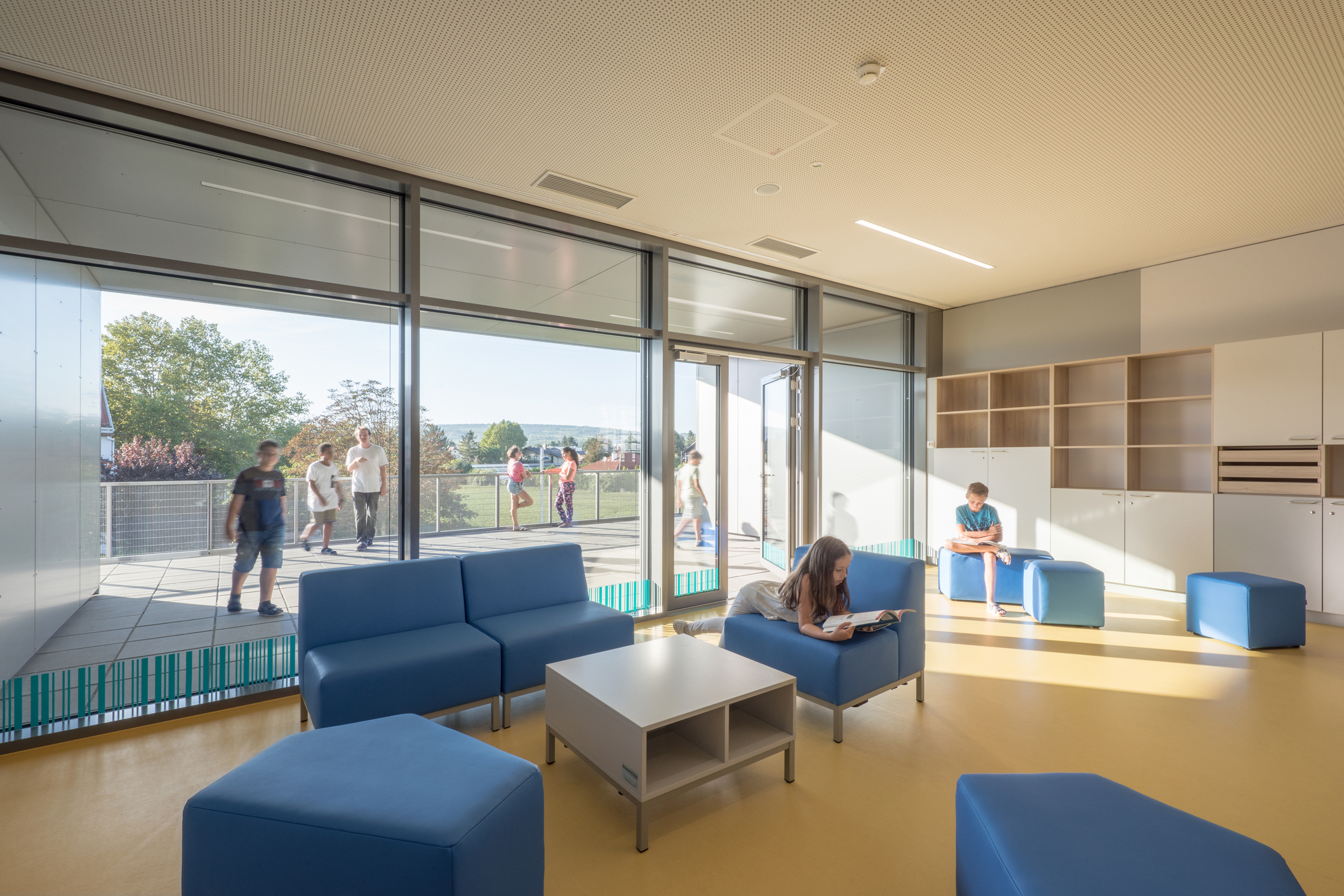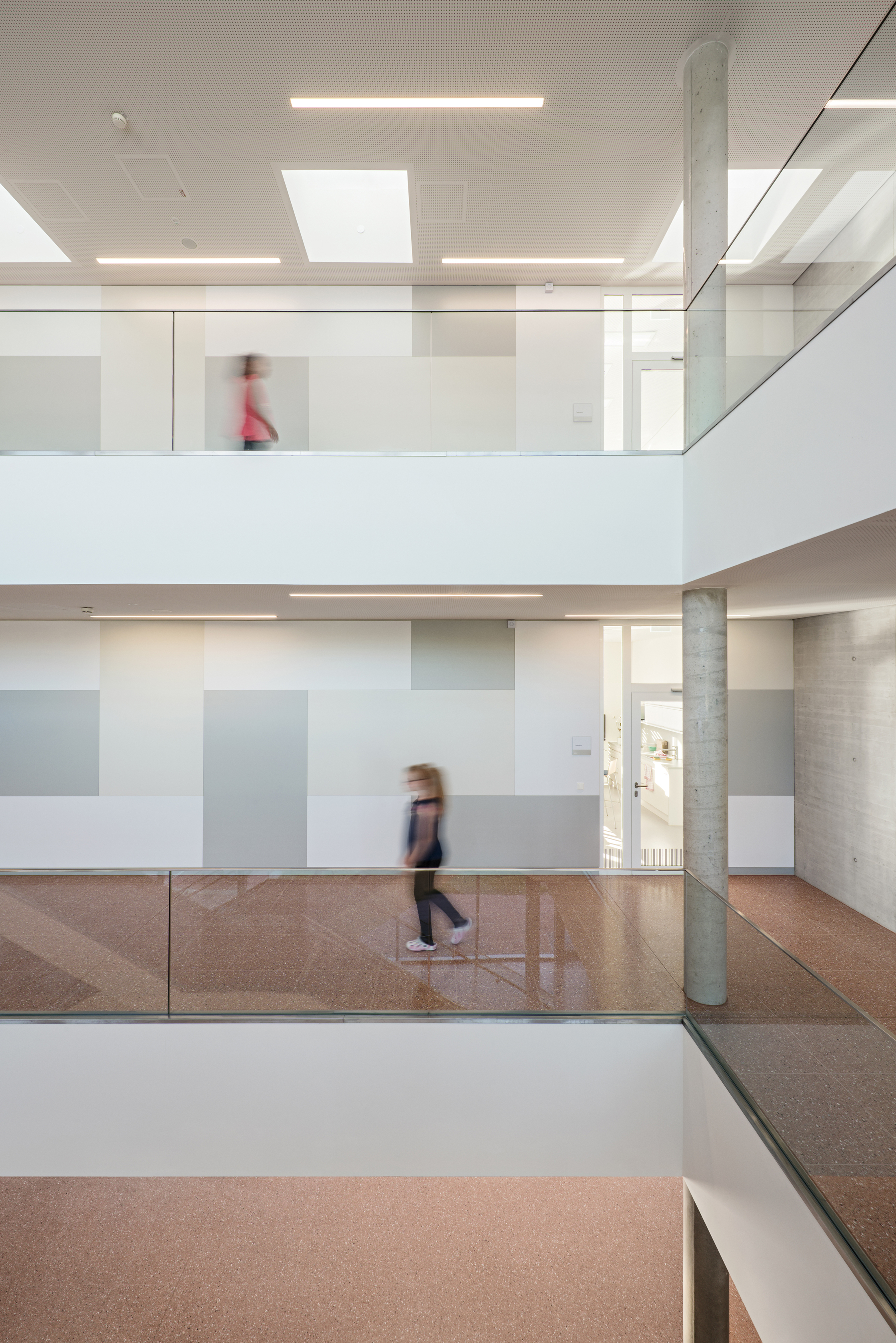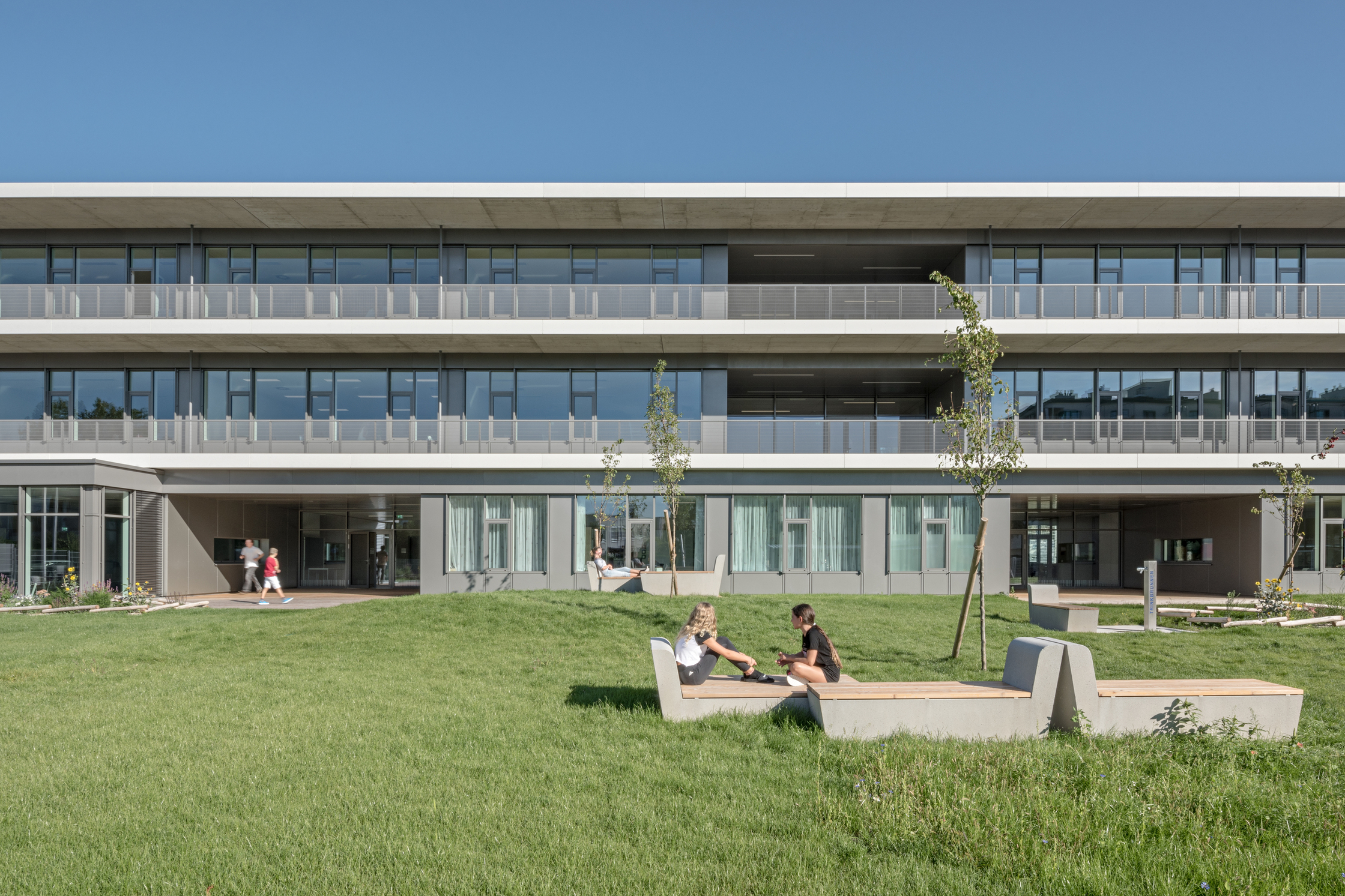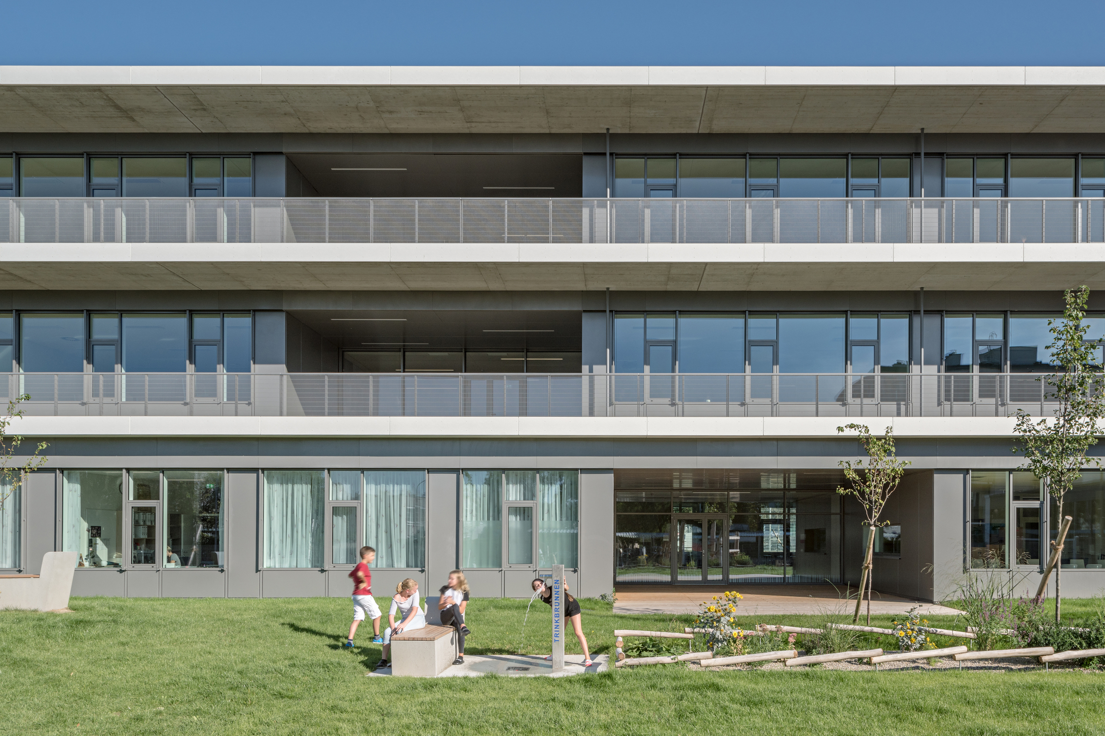 Über Eck gezogene Fensterbänder in den Bildungsräumen und raumhohe Verglasungen in den Allgemeinbereichen schaffen räumliche Weite, Ausblick und viel Tageslicht, und für Gartenbezug auch im Obergeschoß sorgen große Balkone. Deren elegante Geländer mit zarten, V-förmig angeordneten Rundstäben und ein subtiles Farbkonzept sind nur zwei der Details, die auch hier Herz und Auge erfreuen.